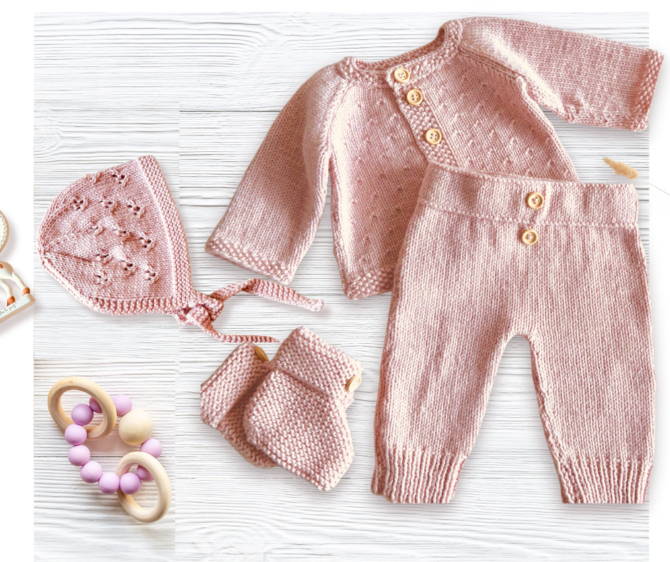 Profitez de notre offre pour vos listes de maternité avec cette ensemble gilet et pantalon legging, beguin et chaussons coloris rose poudrée. Pour les littles girl, voici un coloris rose poudré tout doux pour cette laine mérinos à plusieurs brins tricotée à la main.