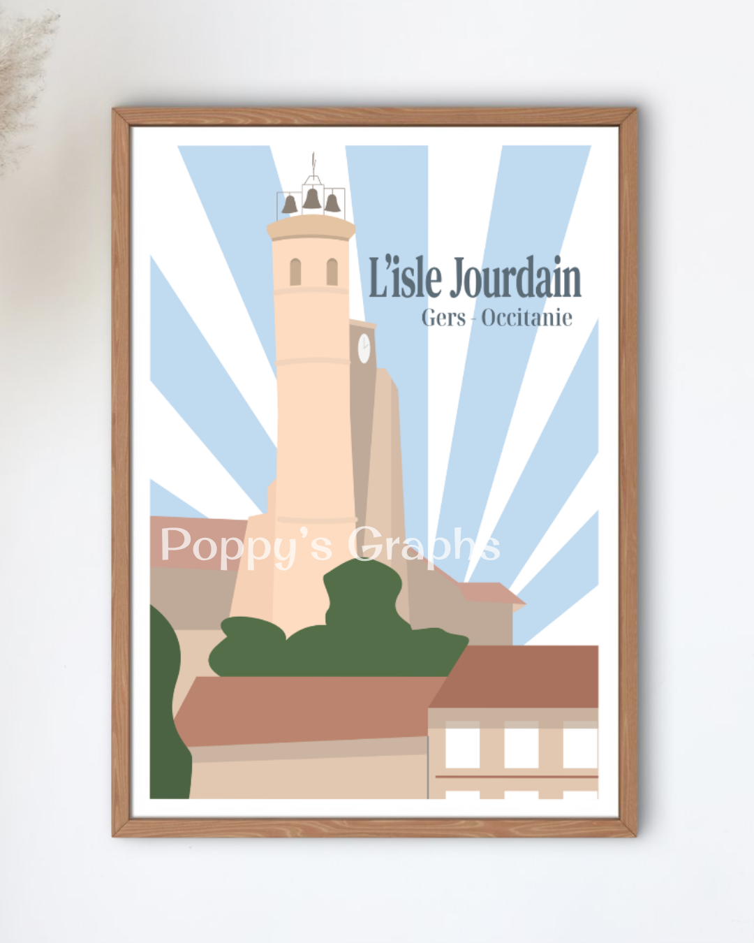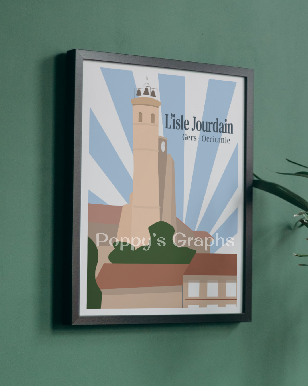 J’ai voulu représenter un élément phare de l’isle jourdain, quoi de mieux que le clocher qui dépasse largement avec cette grande tour ! Résultat : un poster qui illustre parfaitement la ville. Les couleurs sont douces, la mise en page reste minimaliste et élégante, et l’illustration garde cette petite touche originale qui attire l’attention sans crier.