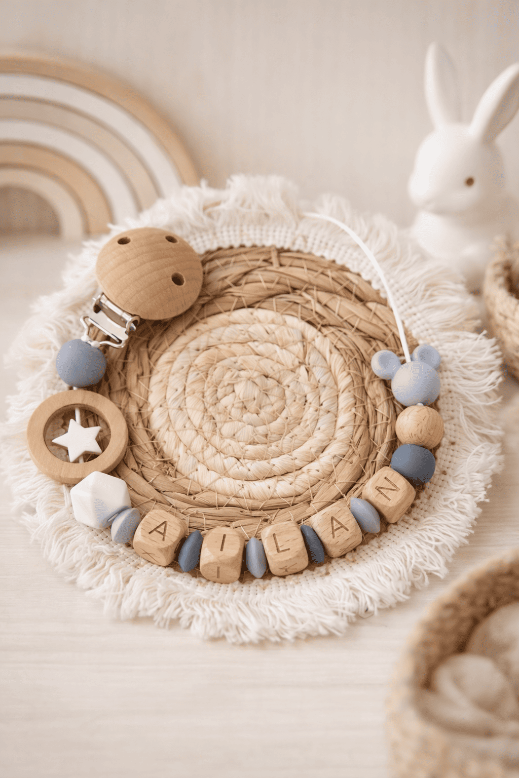 - Attache tétine Bois naturel et Silicone alimentaire (Sans BpA, sans phtalates, etc…)