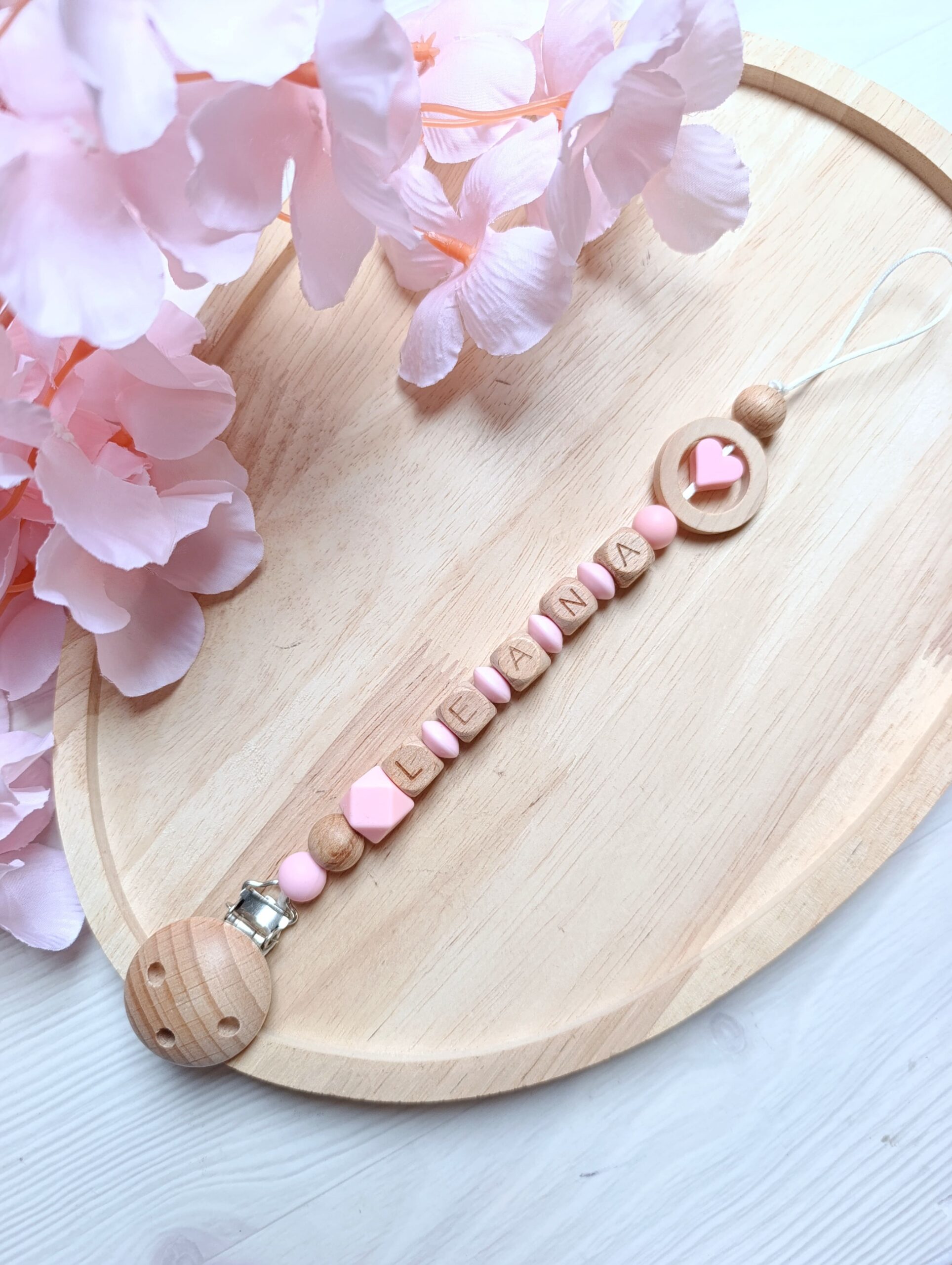 - Attache tétine Bois naturel et Silicone alimentaire (Sans BpA, sans phtalates, etc…)