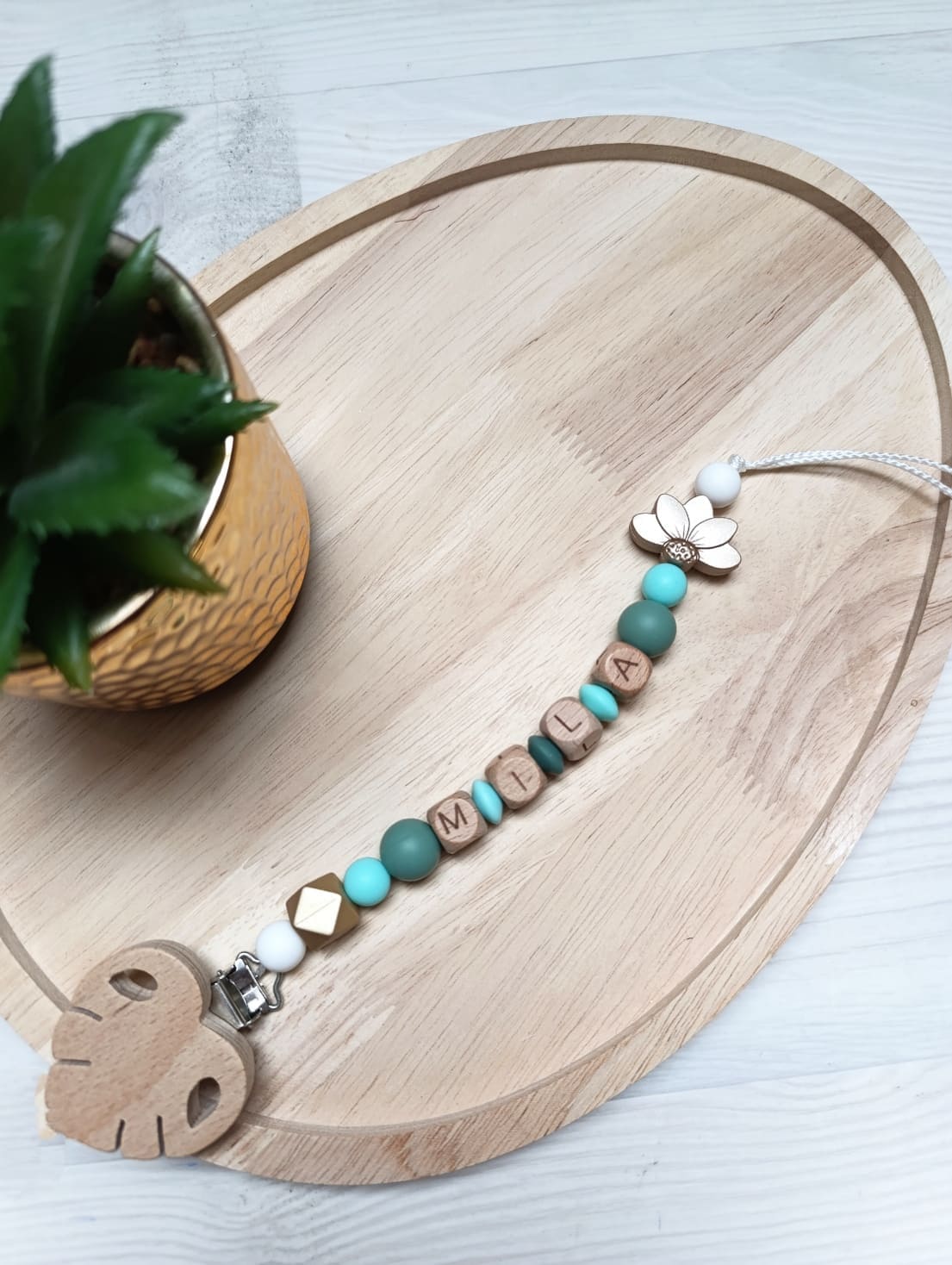 - Attache tétine Bois naturel et Silicone alimentaire (Sans BpA, sans phtalates, etc…)