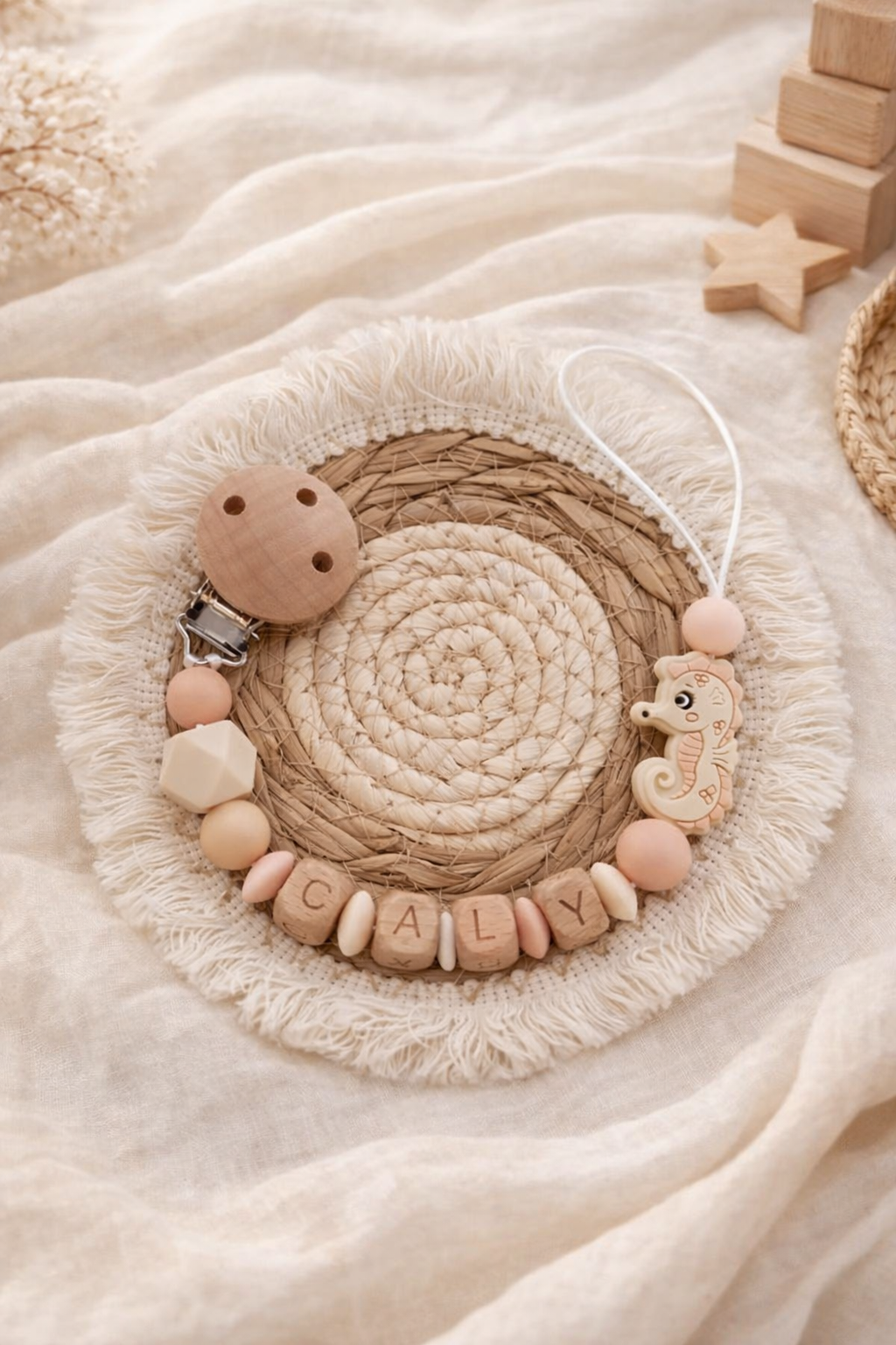 - Attache tétine Bois naturel et Silicone alimentaire (Sans BpA, sans phtalates, etc…)