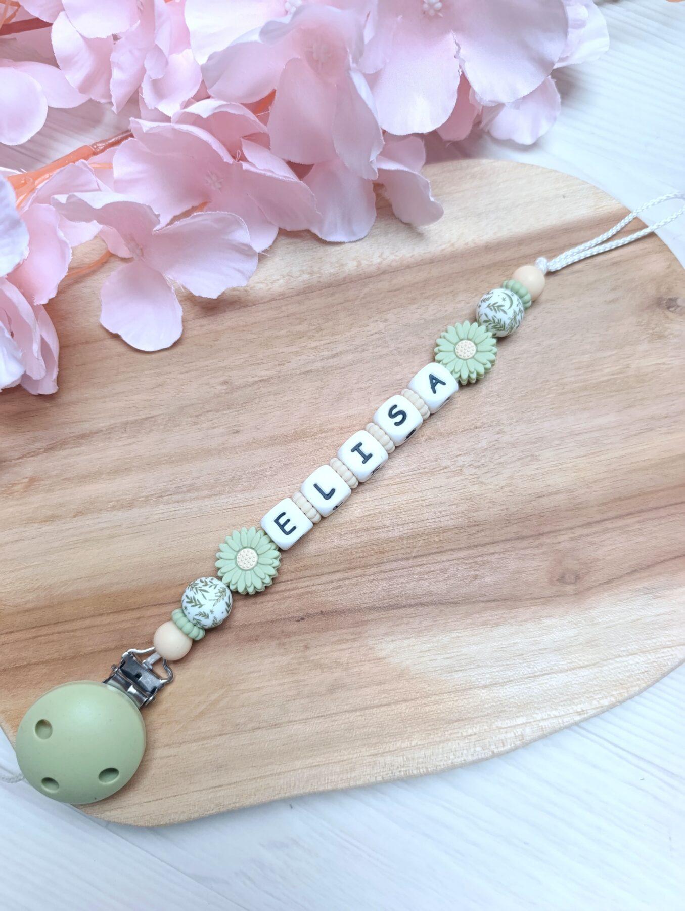 - Attache tétine Bois naturel et Silicone alimentaire (Sans BpA, sans phtalates, etc…)