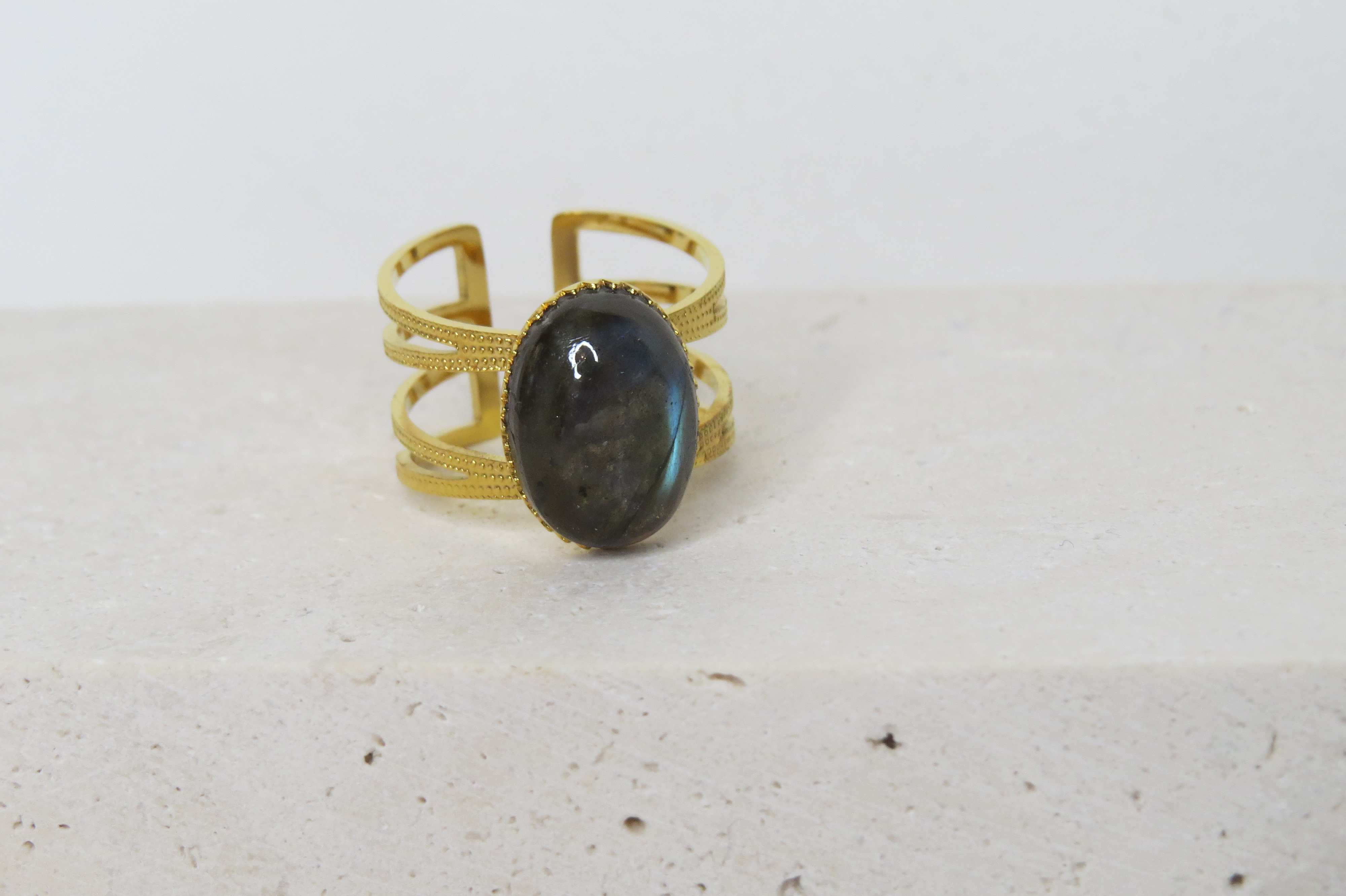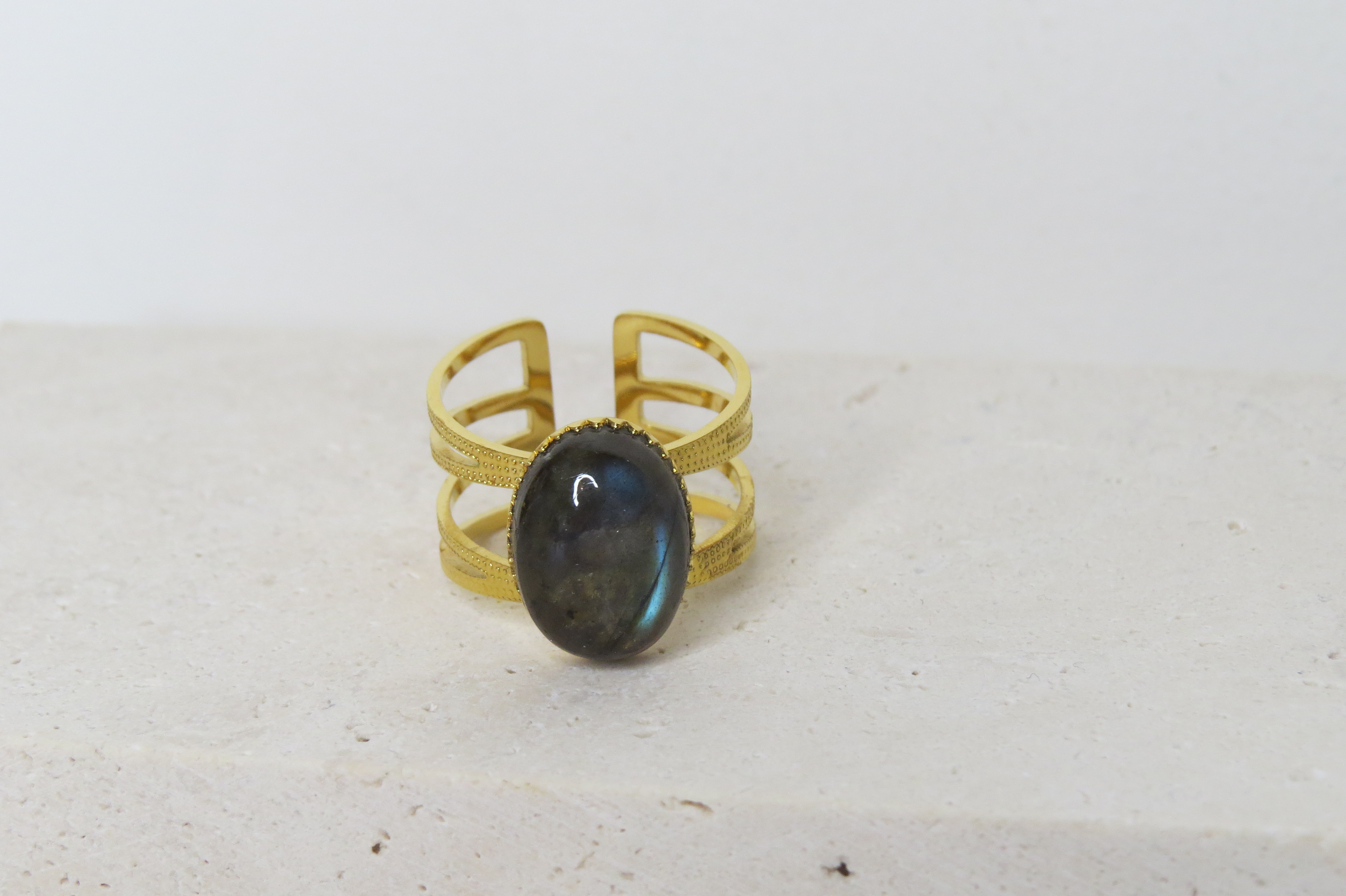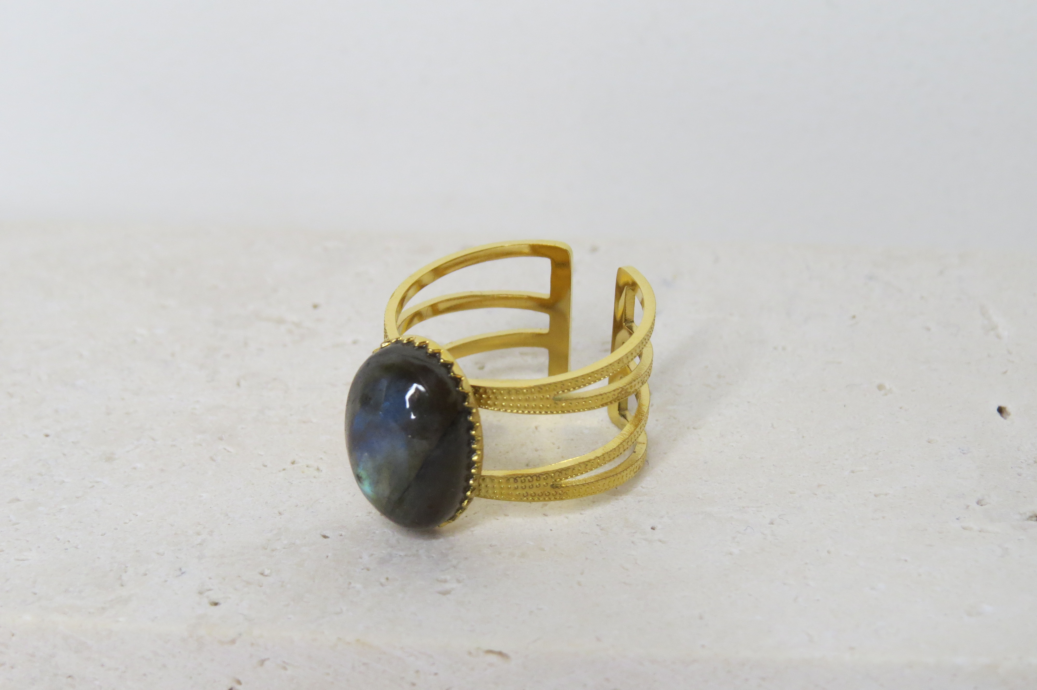 Découvrez notre bague en acier inoxydable doré et sa pierre de labradorite