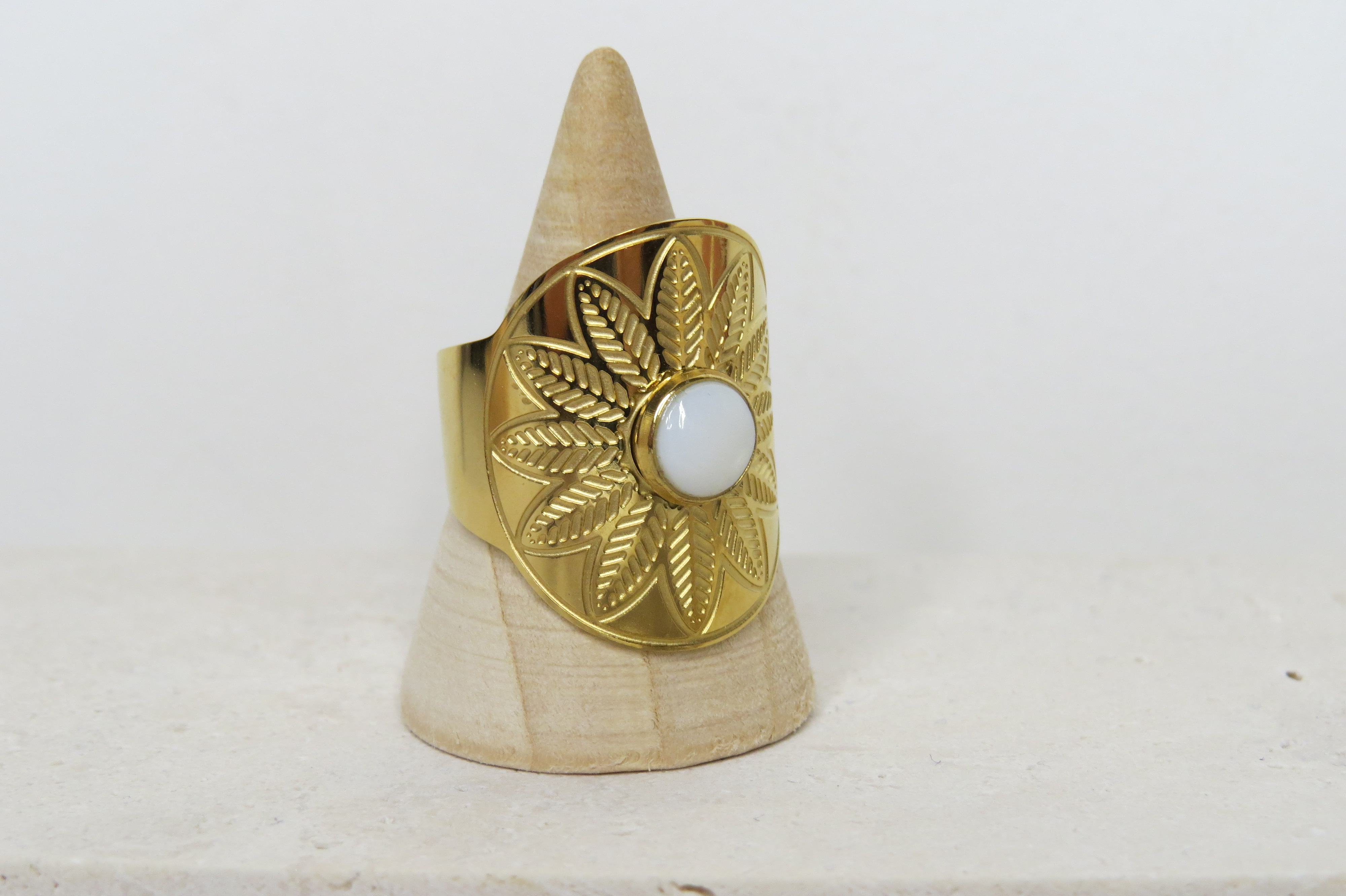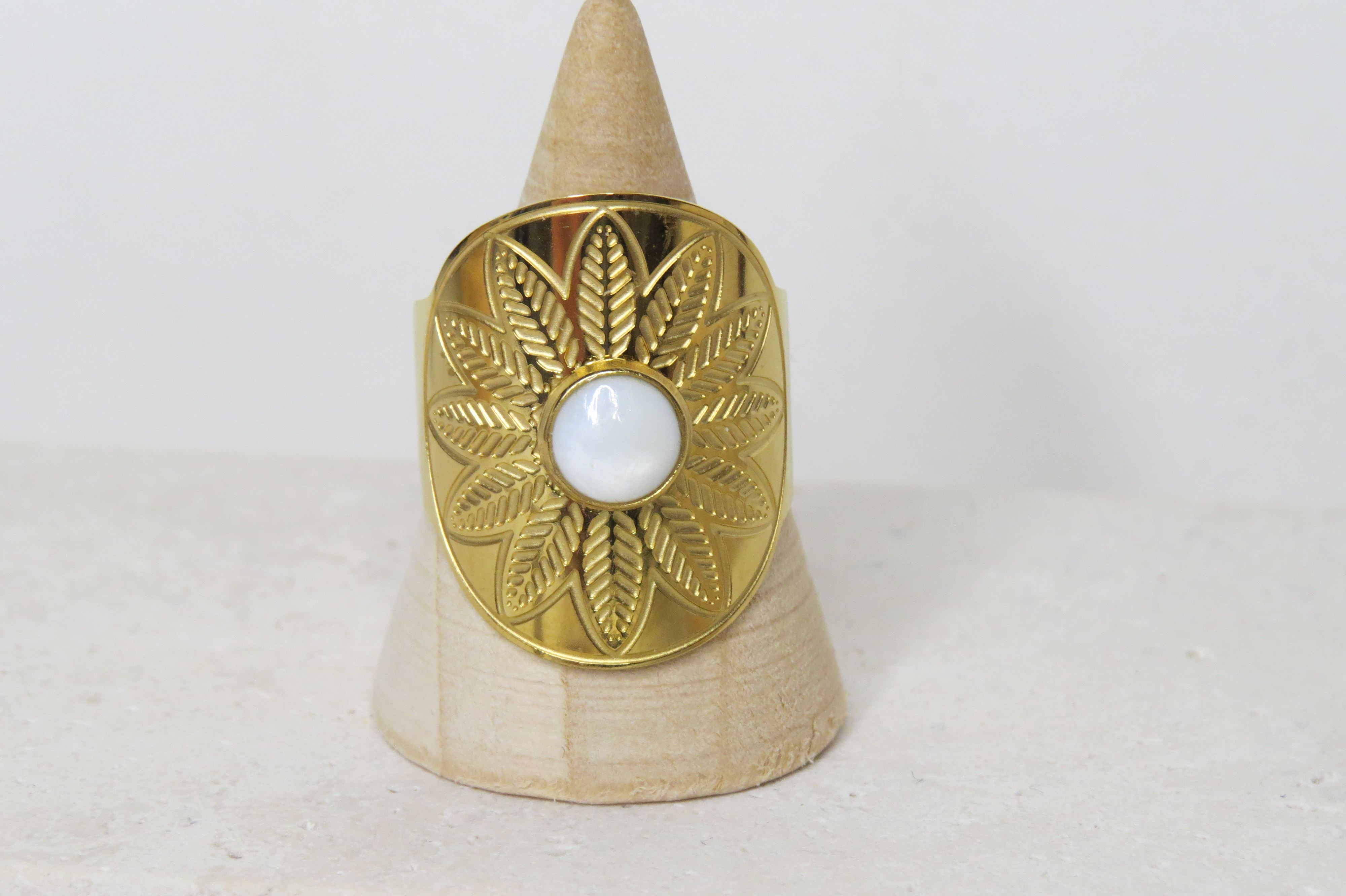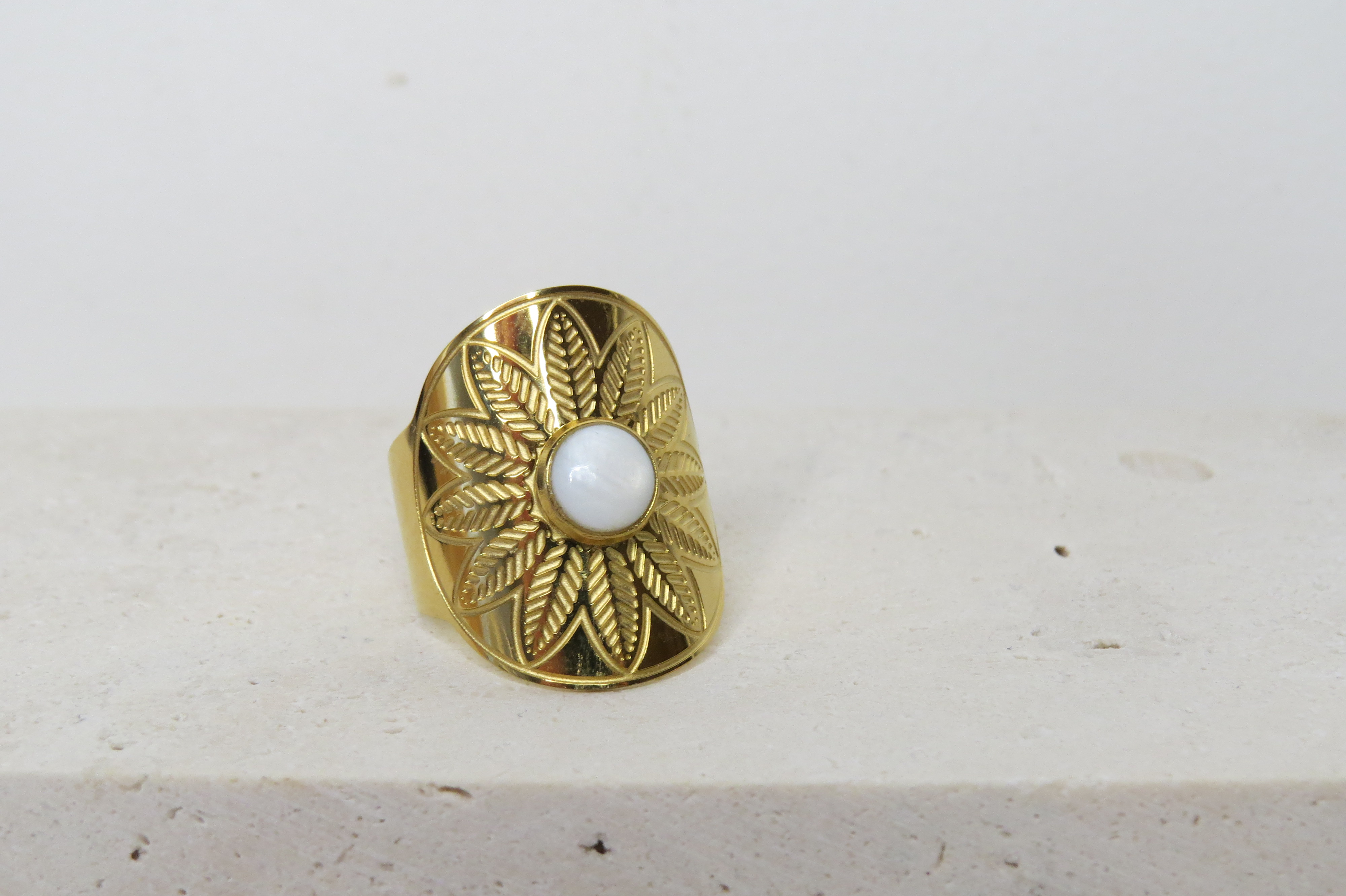 Découvrez notre bague en acier inoxydable doré et sa pierre de nacre