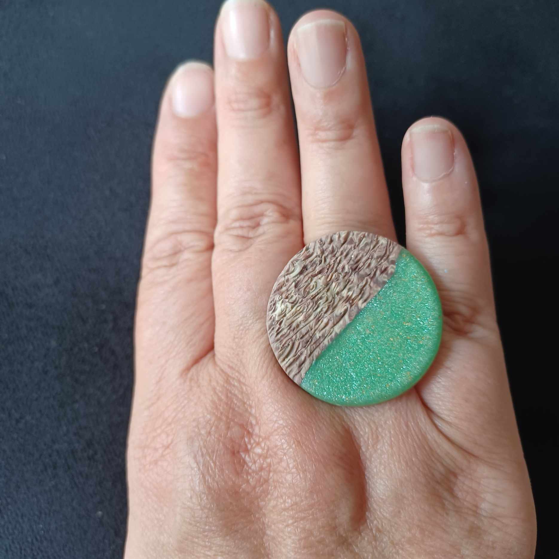 Une bague fantaisie imposante mais légère à porter. Un duo original moitié texturé aspect bois, moitié lisse uni pailleté. En polymère, monture en acier inoxydable et ajustable.