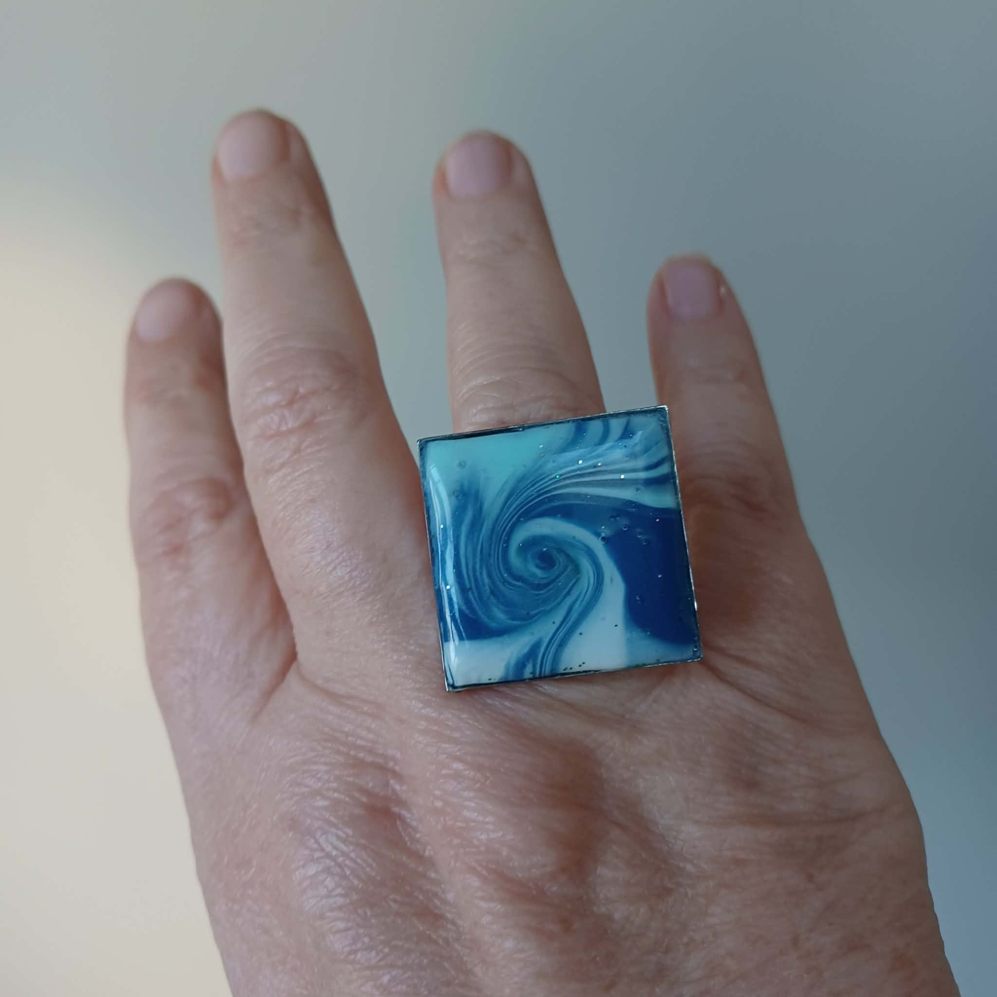 Une bague estivale mais à porter en toute saison ! Motif vague créé en polymère et résiné. Monture en métal ajustable.