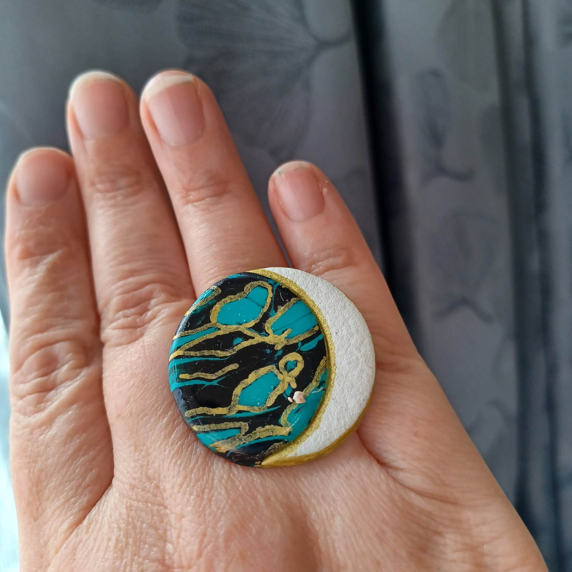 Une jolie bague fantaisie, en polymère résinée, monture en acier inoxydable et ajustable, toute légère.