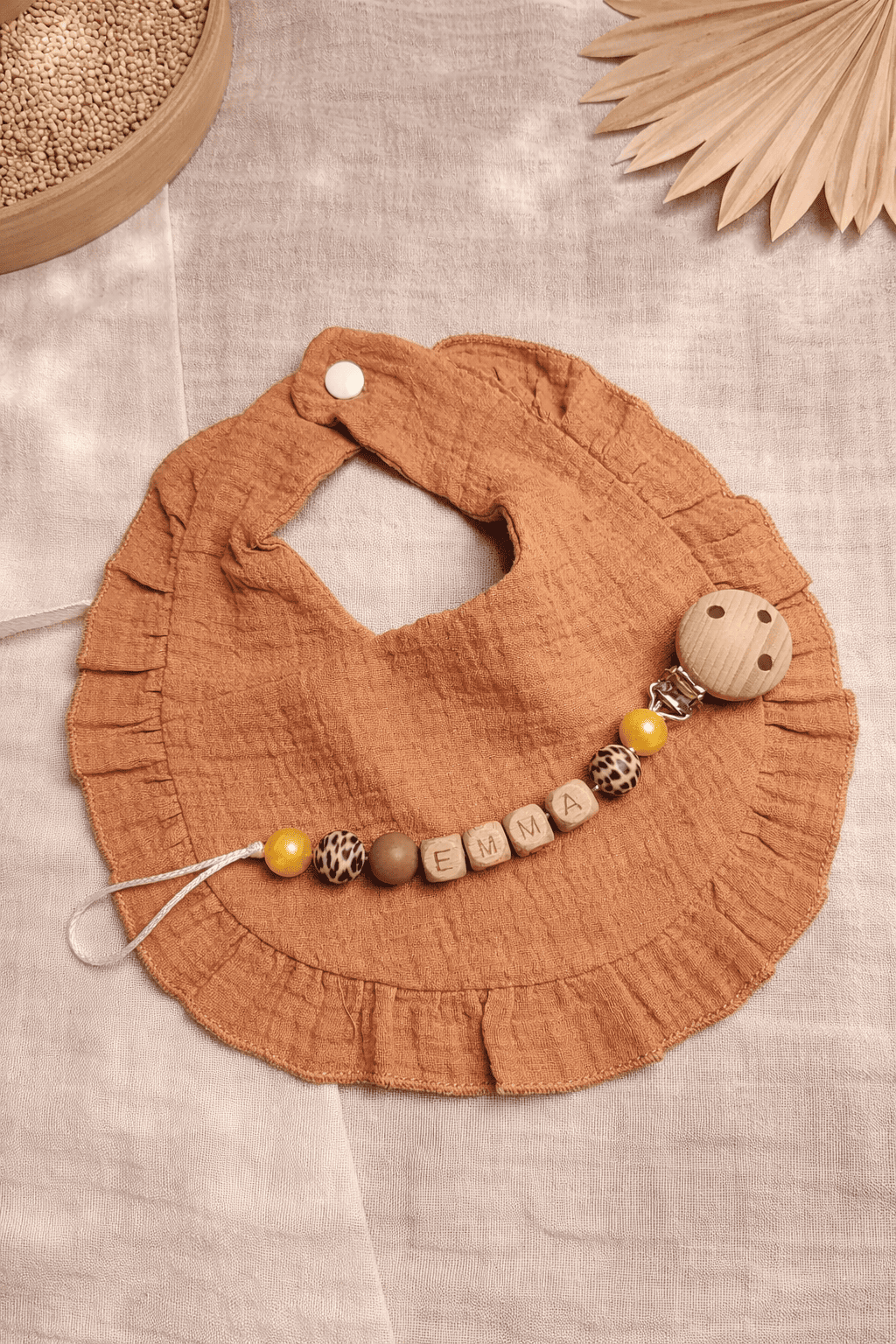 Ensemble cadeau composé d’un bavoir à volants et une attache tétine