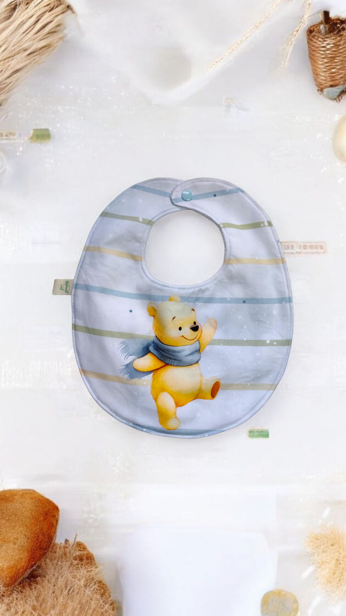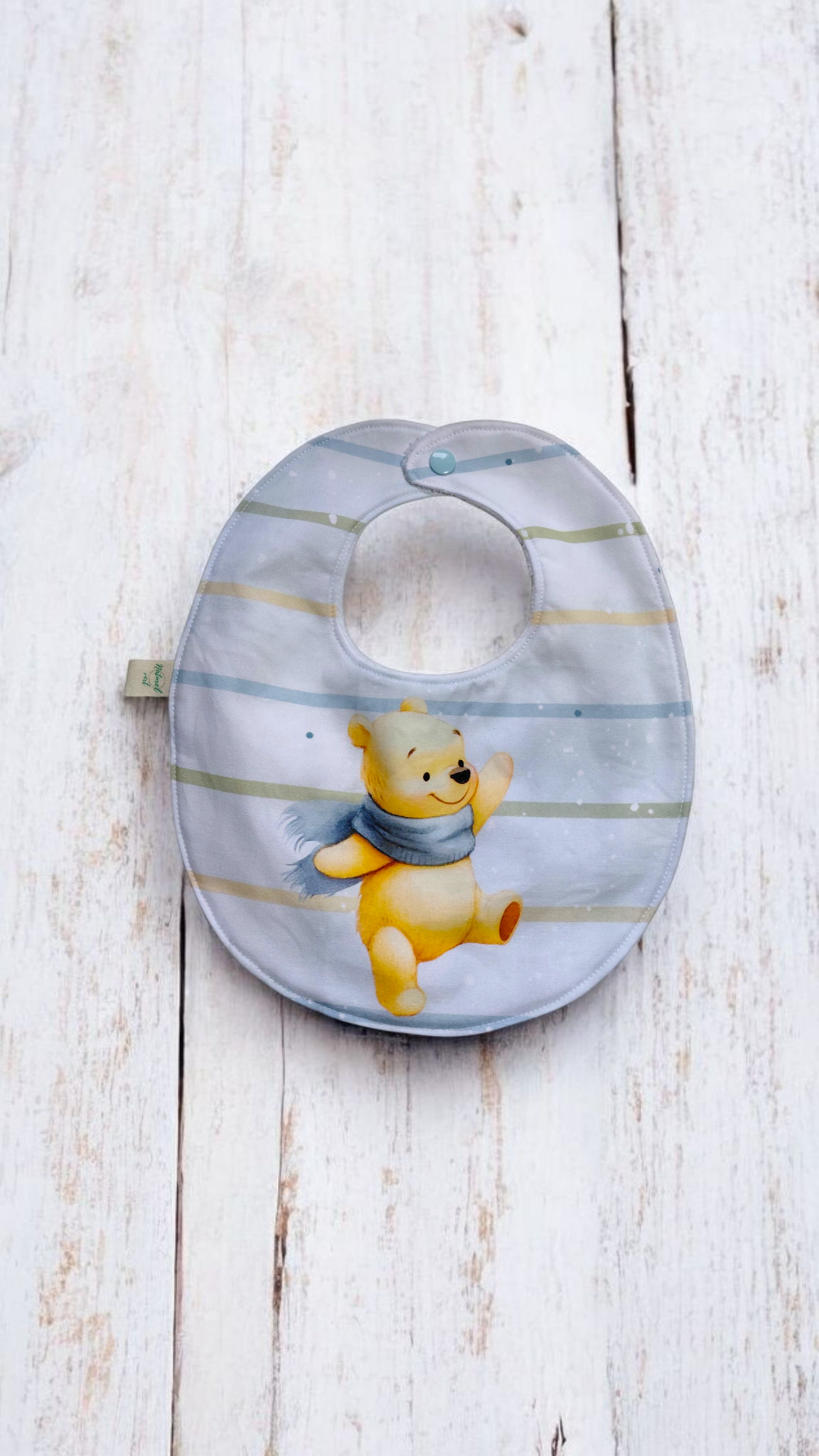 Ce bavoir bébé fait main est confectionné avec soin dans un coton premium imprimé motif ours et une éponge de bambou blanche unie, douce et absorbante.
