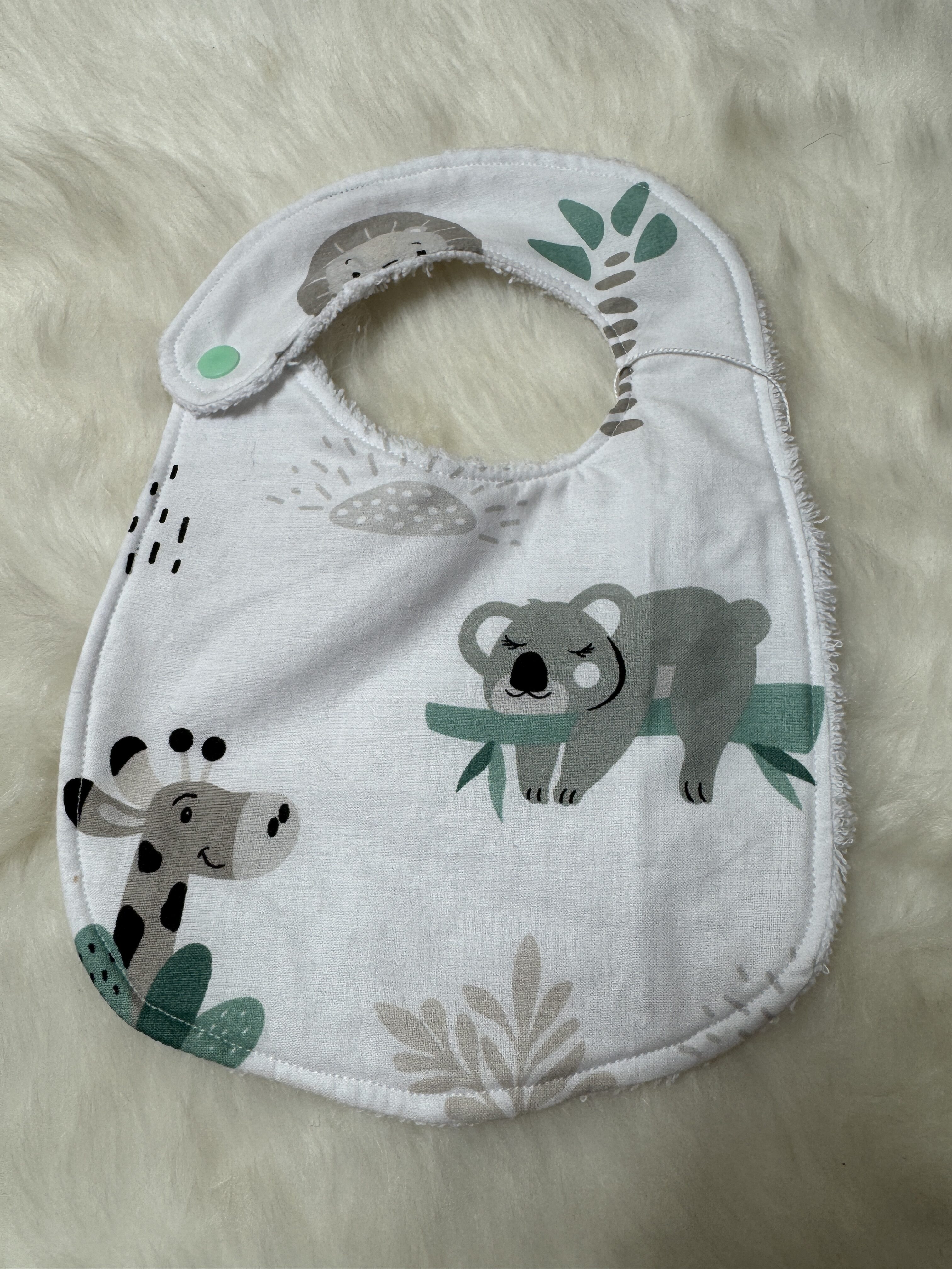 Bavoir bébé en coton thème savane imprimé paresseux, girafe et éponge blanche absorbante