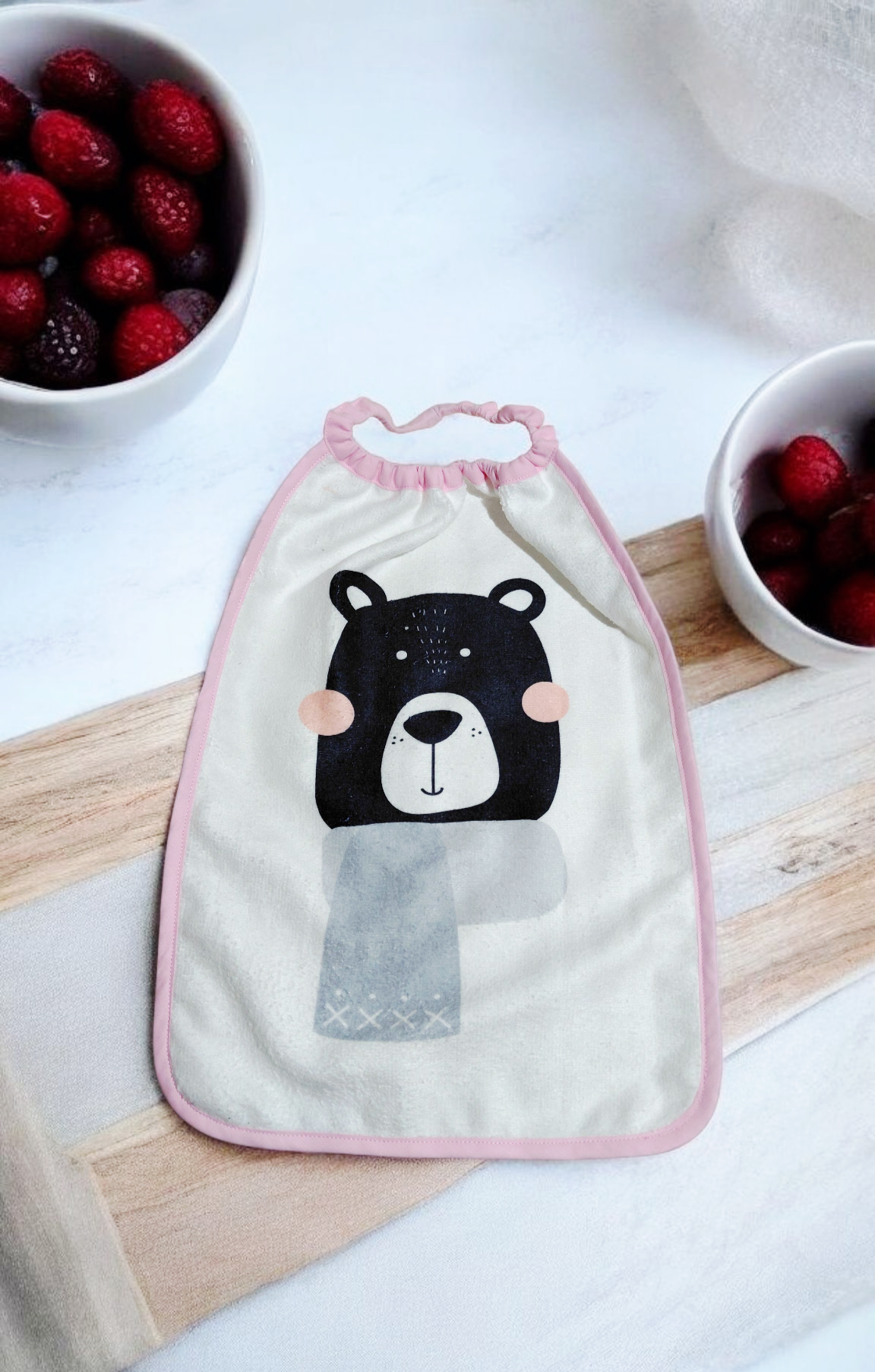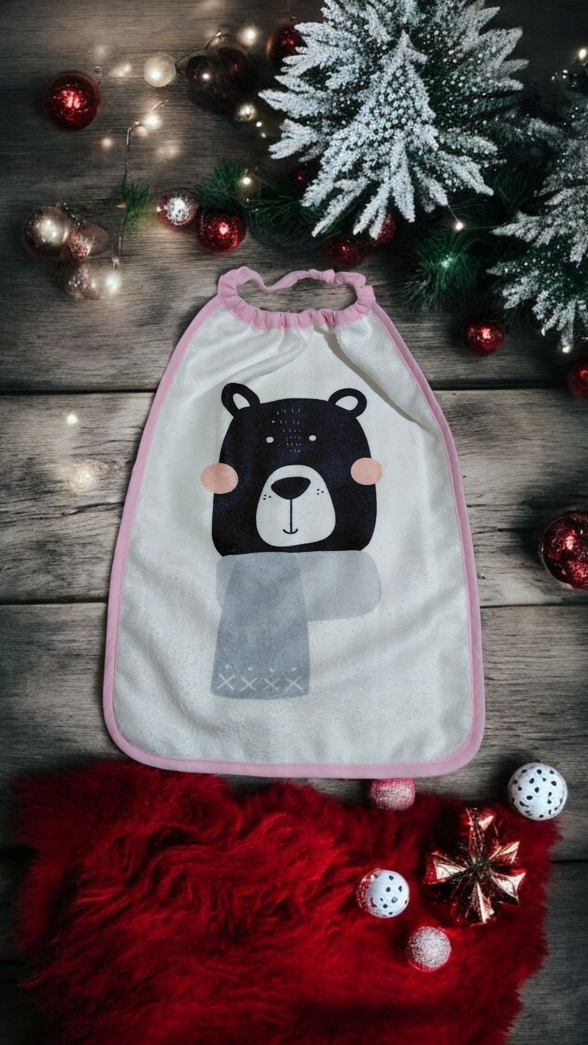 Entièrement fait main, ce bavoir est réalisé dans un tissu doux, absorbant et agréable au toucher. Son motif ours aux joues roses apporte une touche tendre et hivernale qui plaît instantanément aux petits.