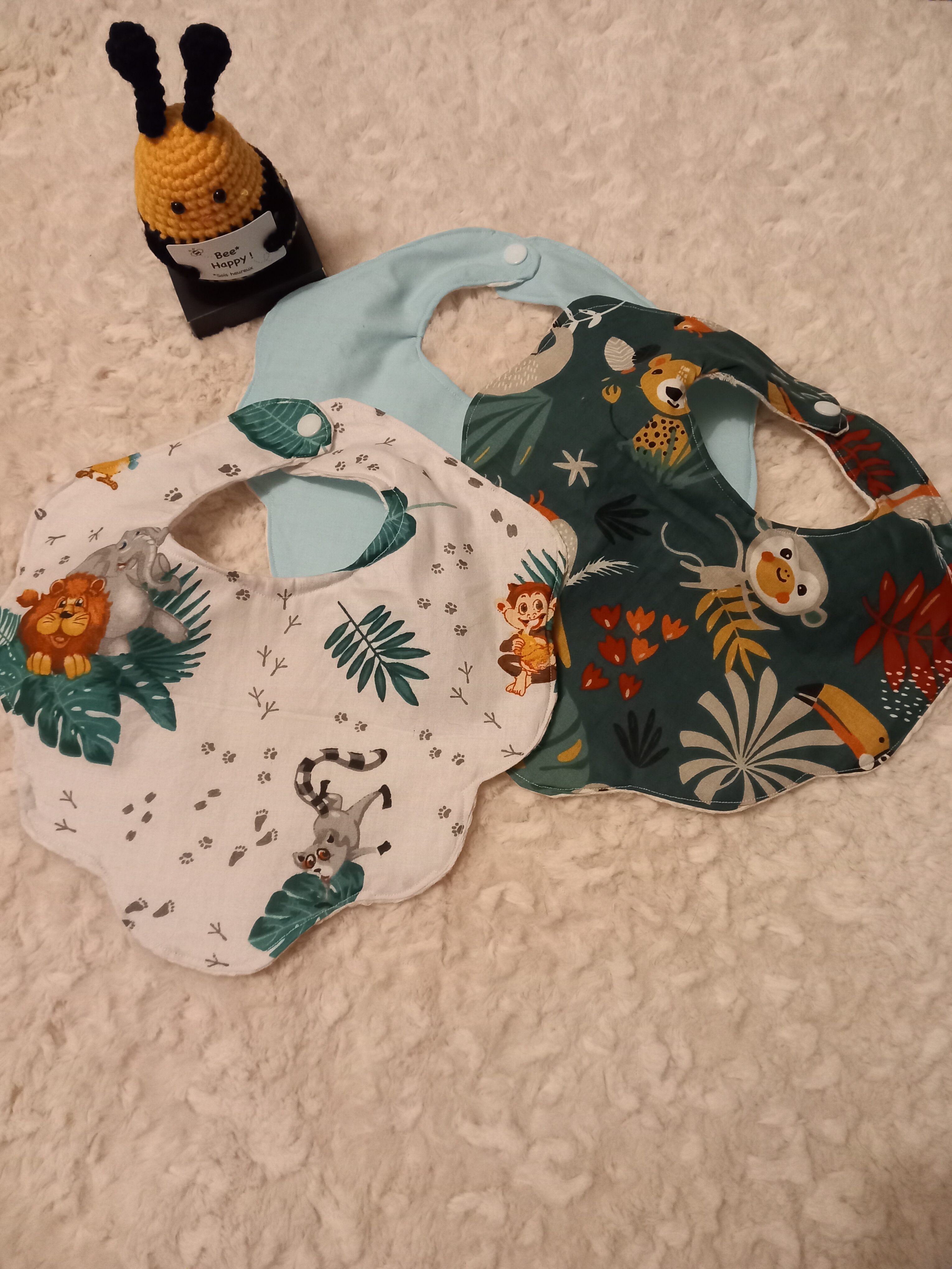 de jolie bavoir naissance par lot de 3 ,pression ,coton et coton gaze nid d’abeille ,1 uni bleu ciel ,1 toucan vert foncé ,1 jungle fond blanc