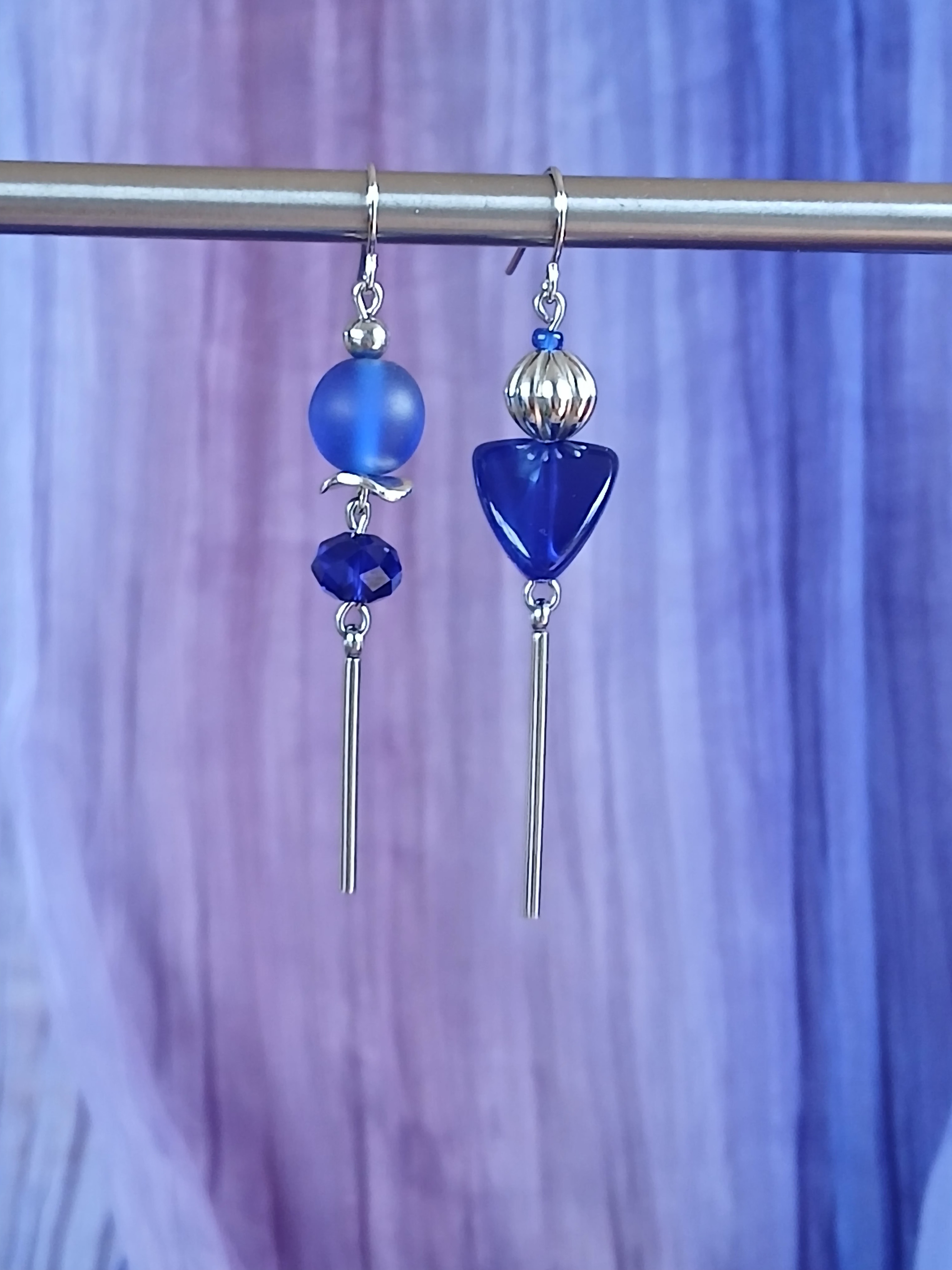Apportez une touche de sophistication à votre tenue avec ces boucles d’oreilles pendantes bleues en perles, un bijou moderne et raffiné au design asymétrique.