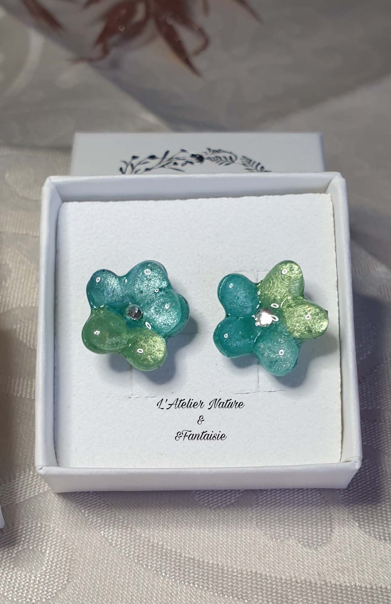 Boucles d’oreilles Artisanales “Fleurs” (Bleu Vert) -Made In France
