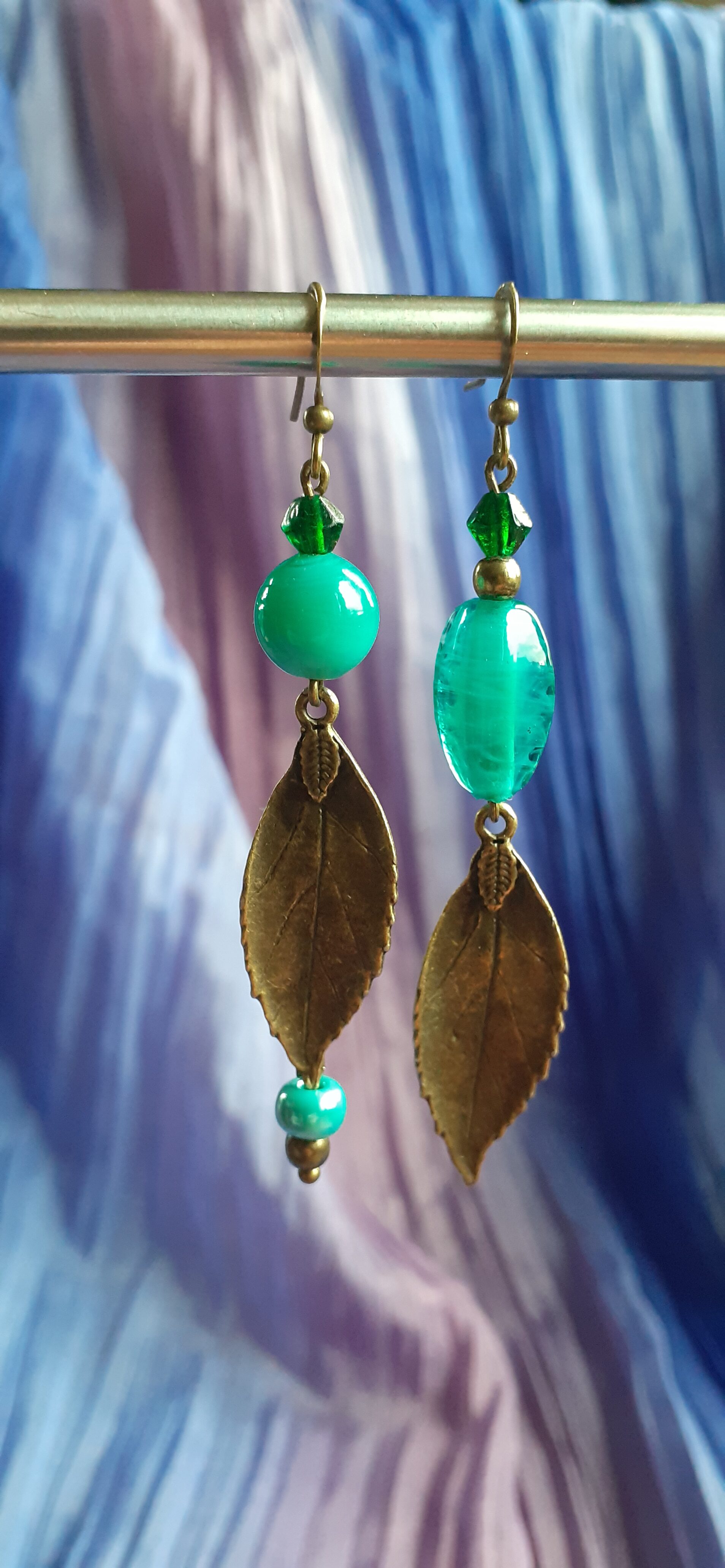 Boucles d’oreilles feuille bleu turquoise – Style bohème bronze vintage