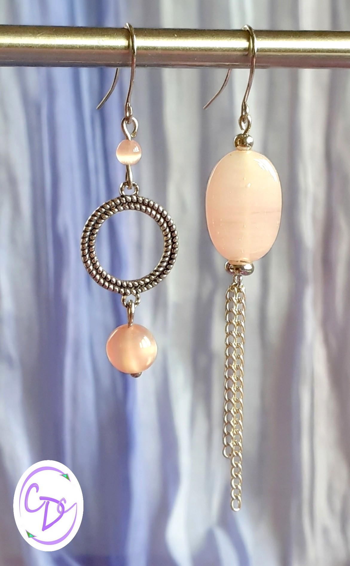 Boucles d’oreilles pendantes asymétriques, perles de verre ton rose dragée, breloque chainette et éléments métalliques en acier inoxydable aspect argenté.