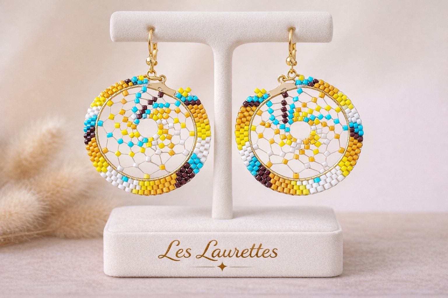Boucles d’oreilles attrapes rêves multicolores. Perles Miyuki. Acier inoxydables.