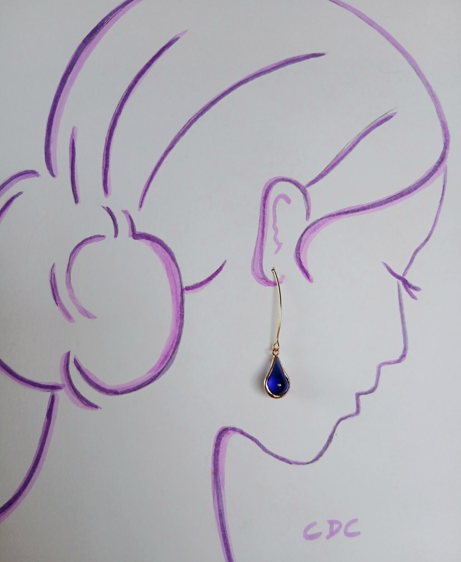 Boucles d’oreilles pendantes. Crochet long doré, goutte de verre bleu outremer.