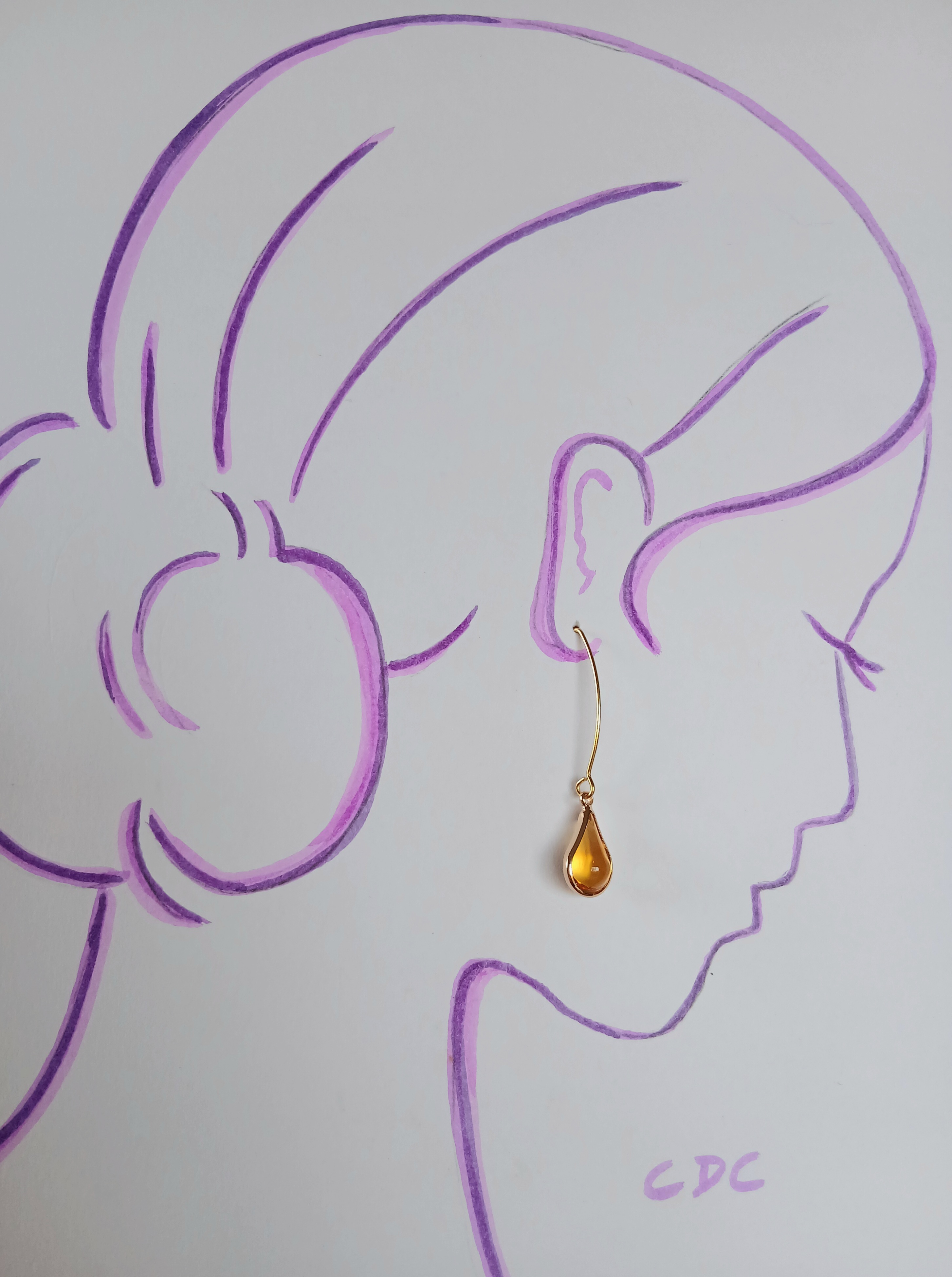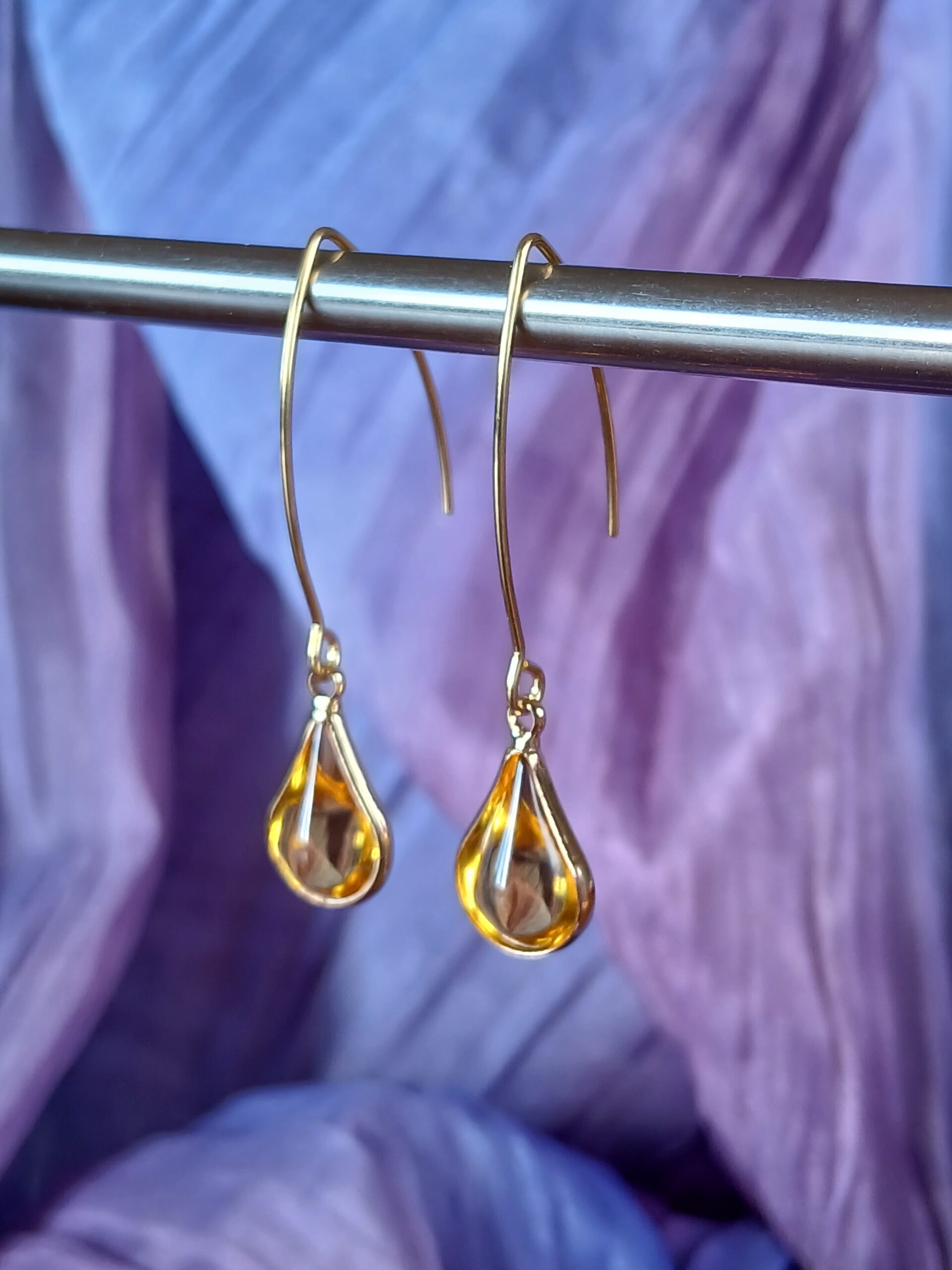 Boucles d’oreilles pendantes. Crochet long doré, goutte de verre jaune.