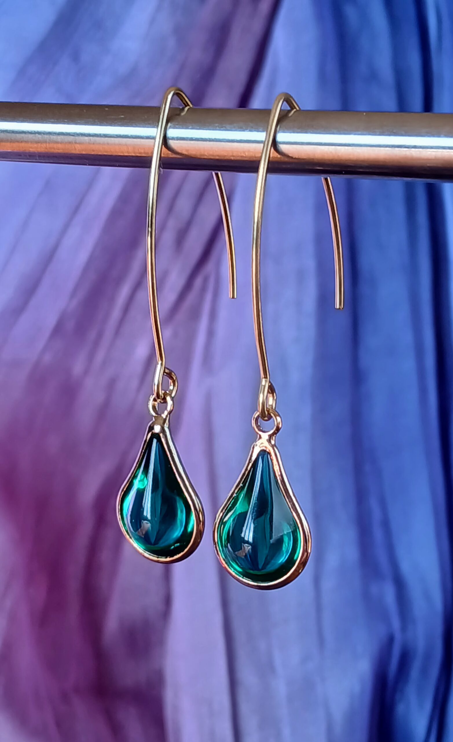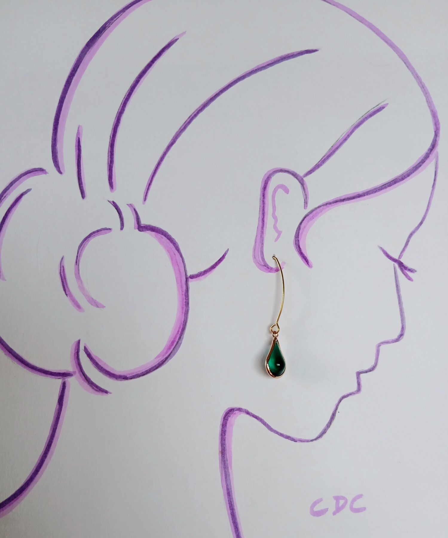 Boucles d’oreilles pendantes. Crochet long doré, goutte de verre vert émeraude.