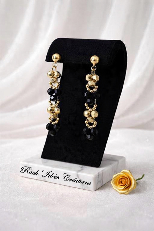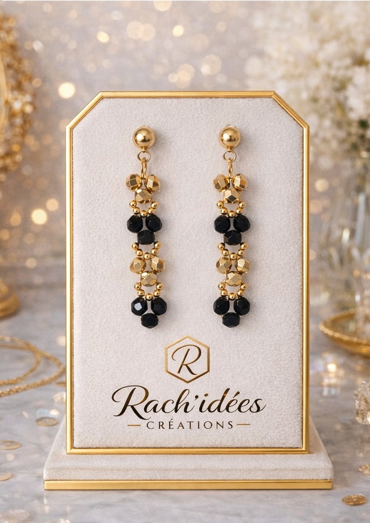 Apportez une touche de sophistication à votre tenue avec ces boucles d’oreilles délicates aux nuances noir profond et doré lumineux. Leur design raffiné associe des perles facettées en cristal de Bohème scintillantes à des détails dorés pour un rendu à la fois chic et intemporel.