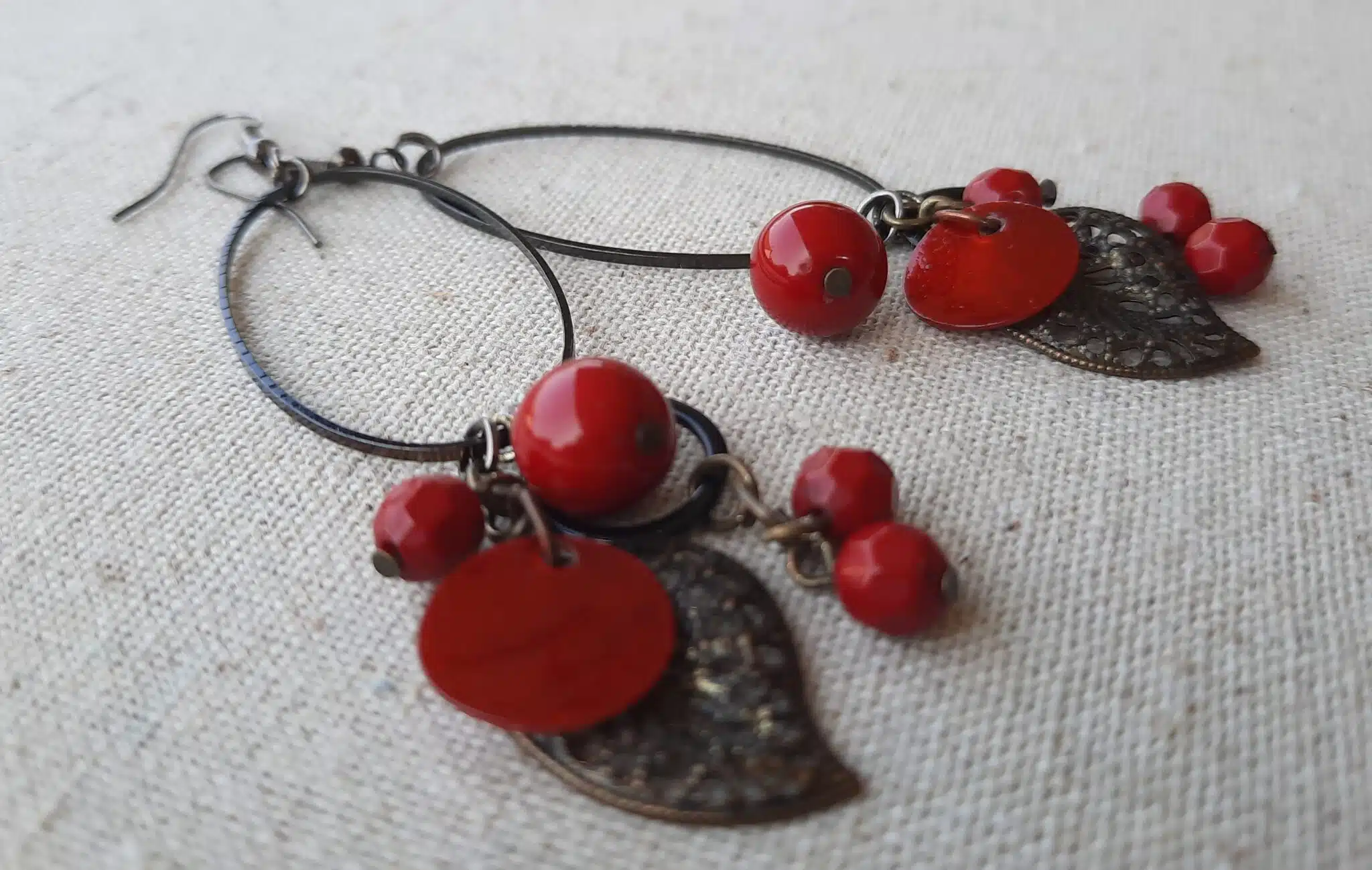 Perles de verre rouge, perles sequins rouges, breloques feuilles bronze, perles à facettes rouges, créoles ovales noires, anneaux fermés noirs.