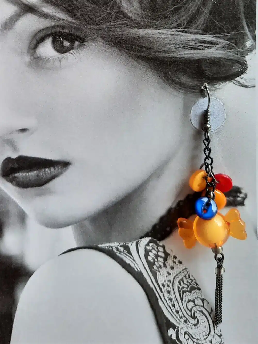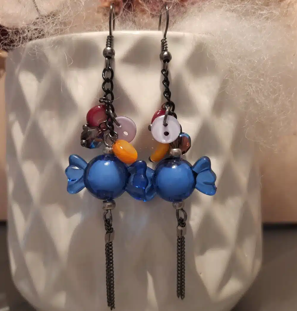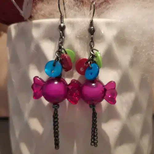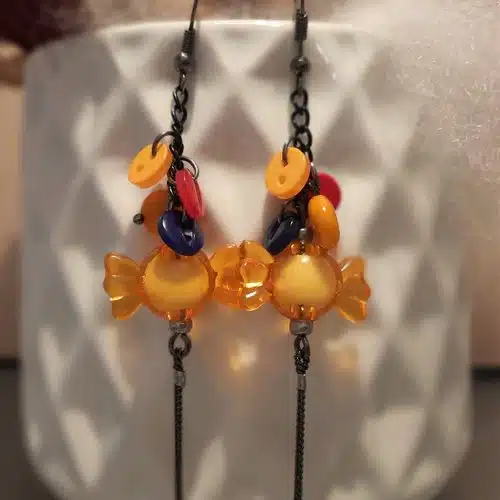 Ces créations très légères, sont un mélange subtil de perles plastique: les “bonbons acidulés”, de boutons de couture de couleurs vives, de perles palets très brillantes. De petites chaînettes ou tiges acier viennent agrémenter l’ensemble pour une finition plus stylée.