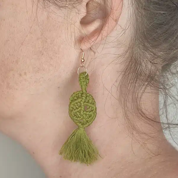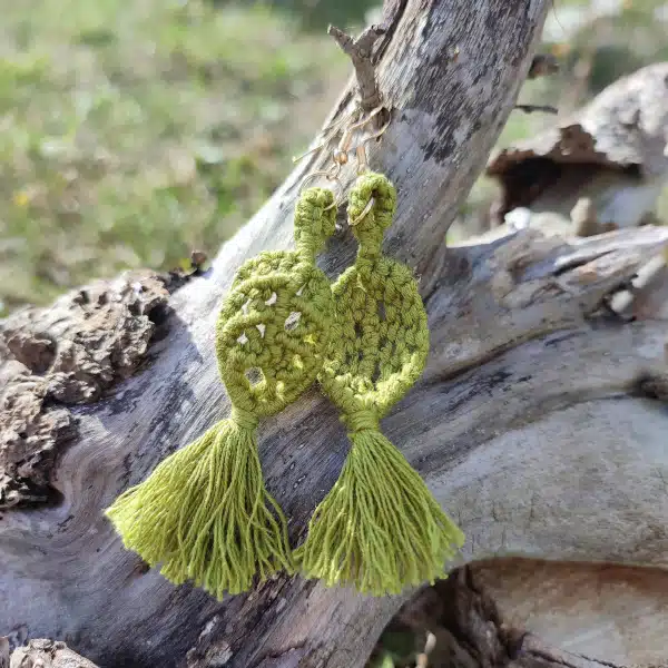 Ces boucles d’oreilles en forme de feuilles couleur olive en macramé sont réalisées à la main en fil 100% coton certifié oeko-tex.