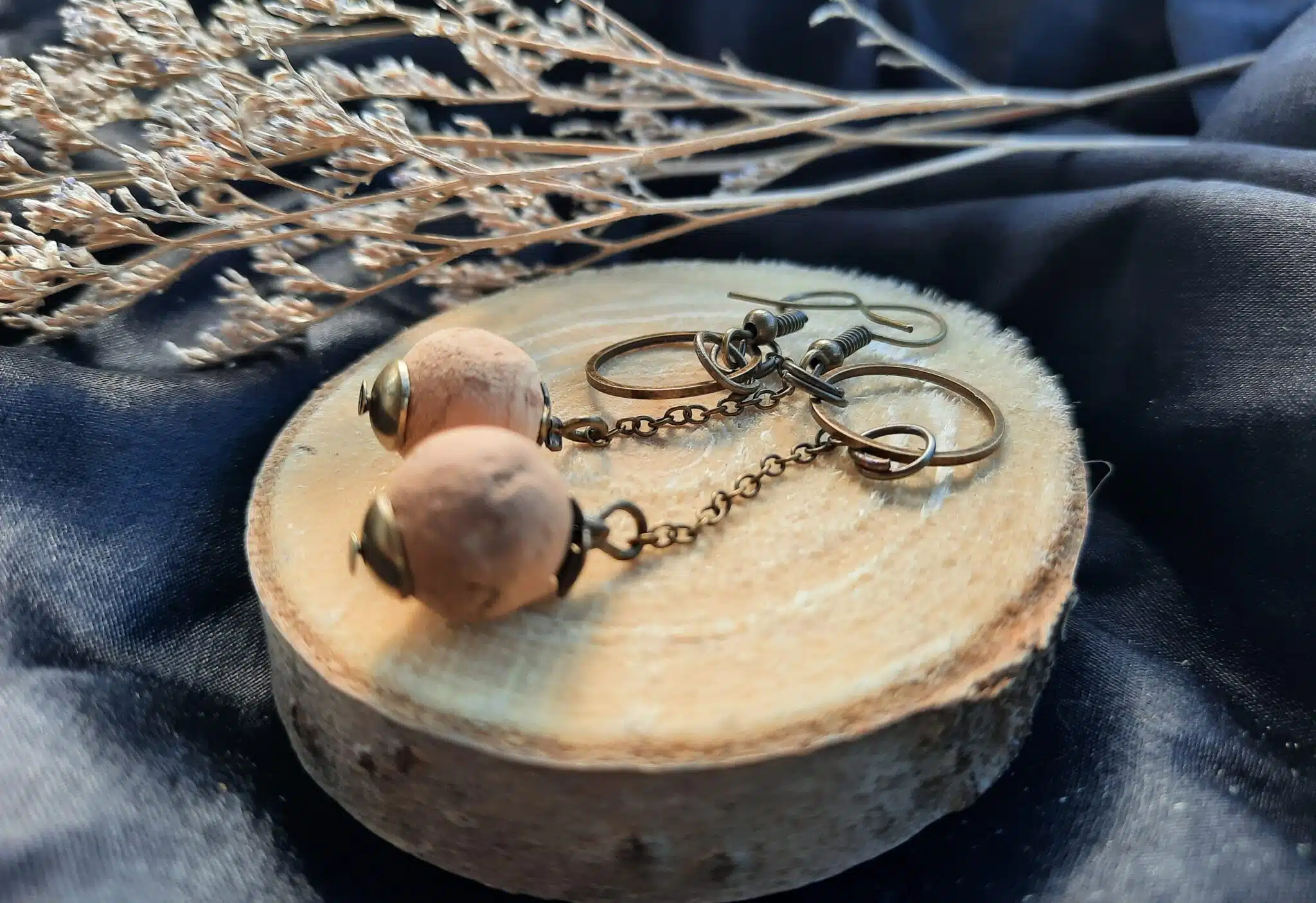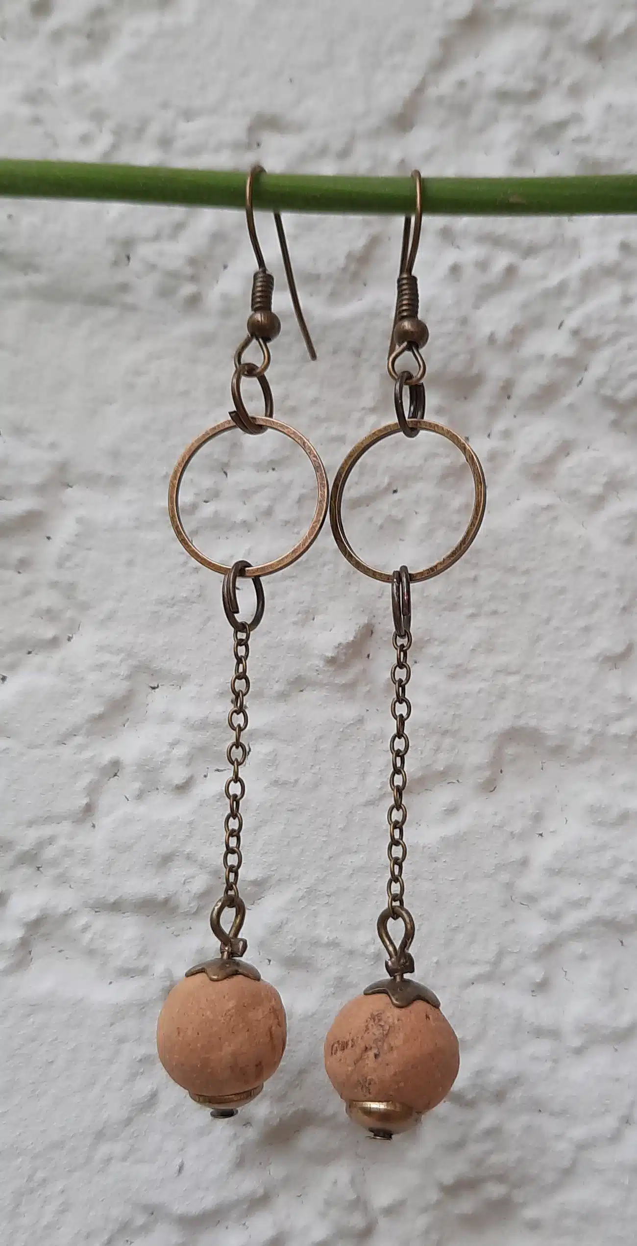 Un anneau de bronze. le tout agrémenté d’une chaînette de bronze avec des perles rondes en liège.