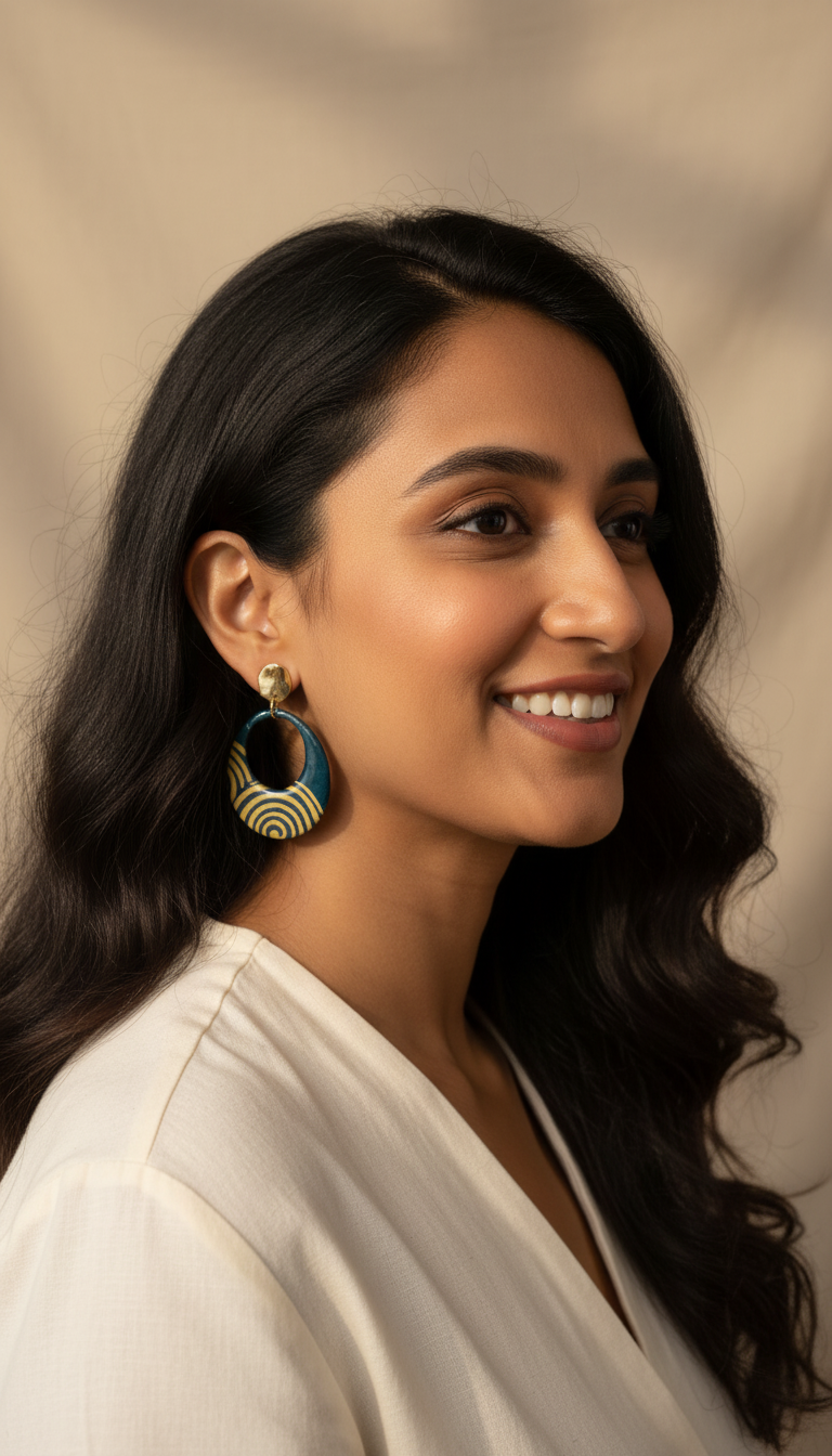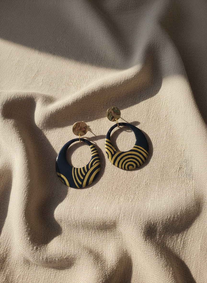 Ces boucles uniques allient légèreté et élégance grâce à leur design artisanal. Réalisées en papier népalais aux motifs marrons et bleus, elles sont soigneusement résinées et vernies afin d’assurer une belle brillance et une protection durable.
