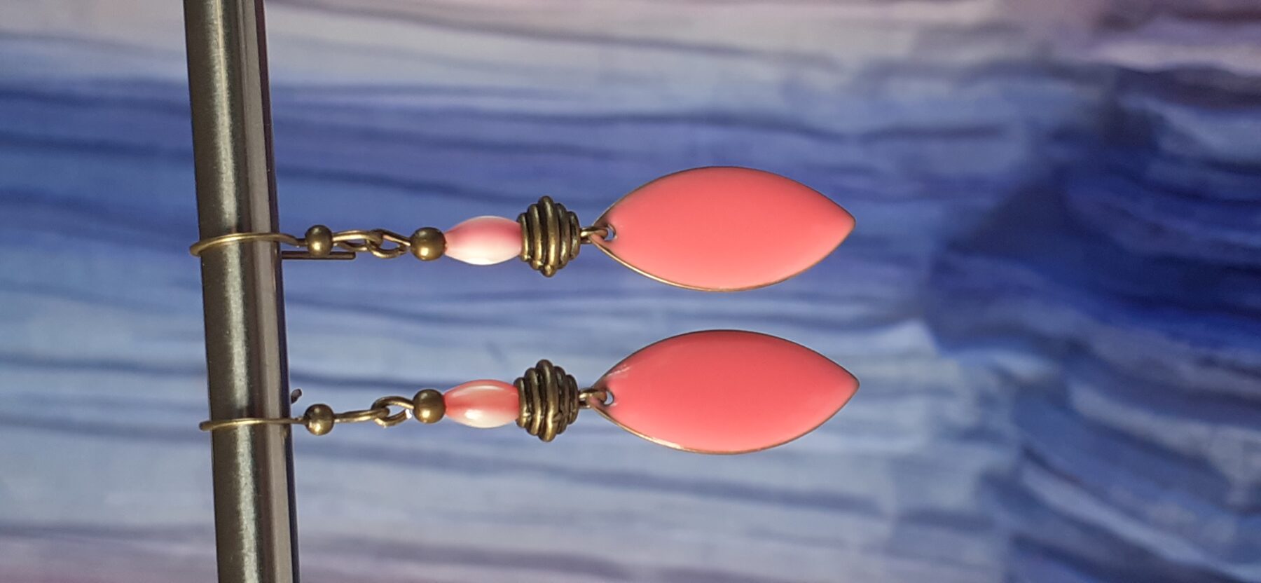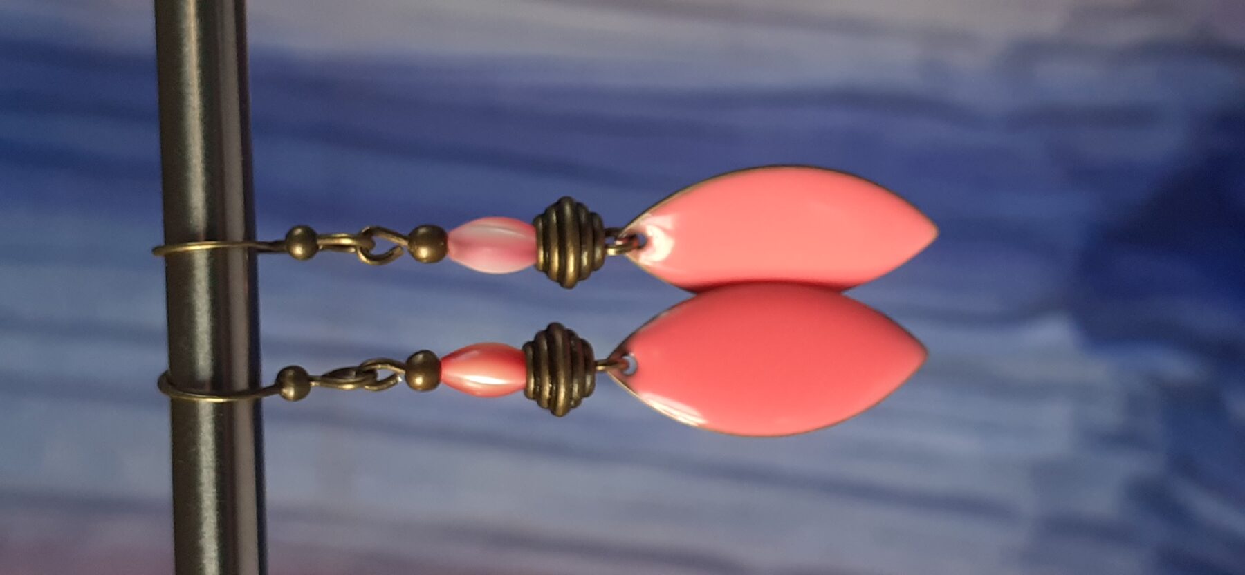Composées d’une petite perle ovale rose irisé de reflets nacrés délicatement associée à une longue goutte émaillée rose brillant, elles offrent un mouvement gracieux et une silhouette élancée. Les attaches en bronze apportent une touche chaleureuse et légèrement vintage, idéale pour un look bohème chic ou estival.