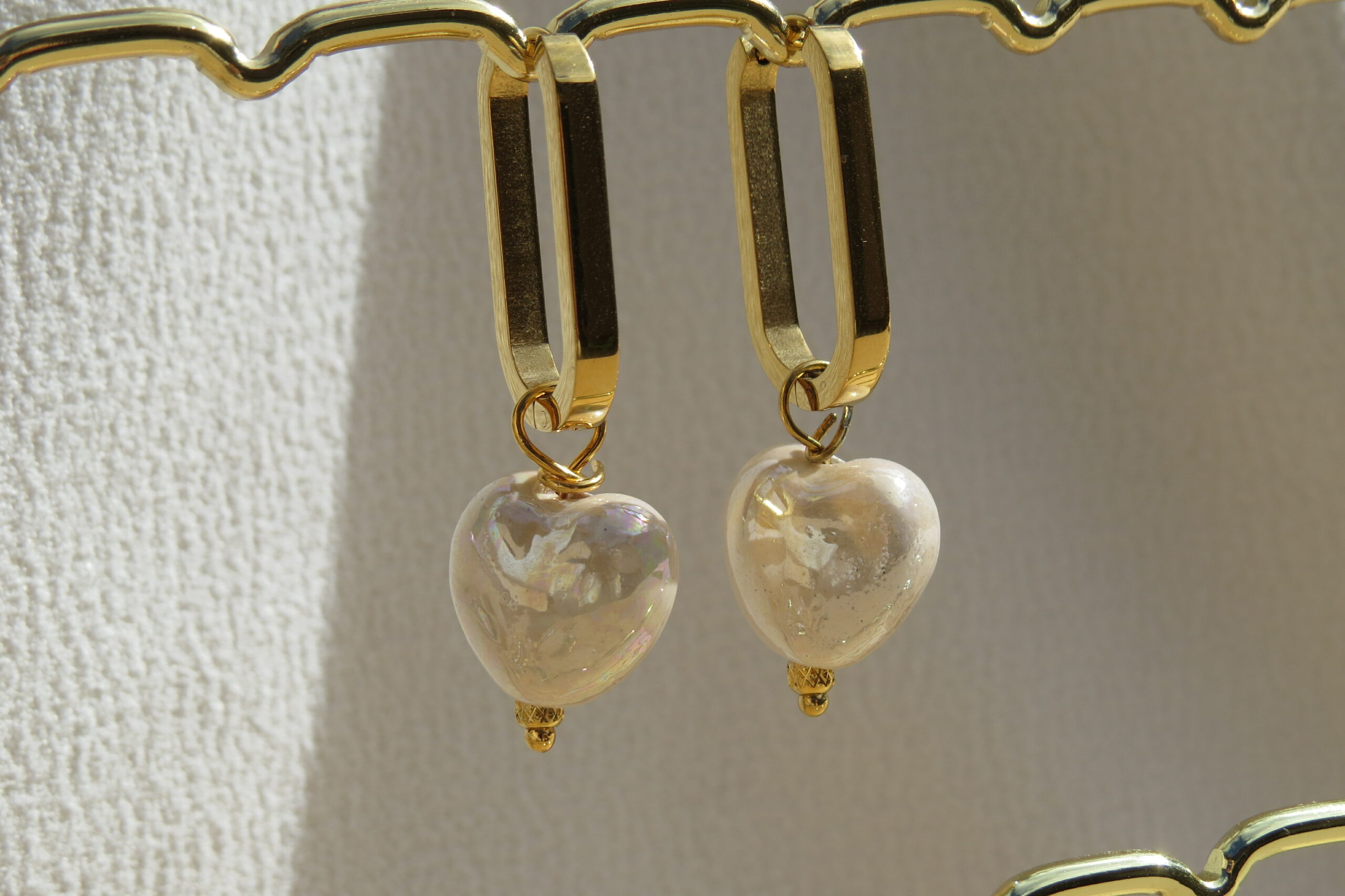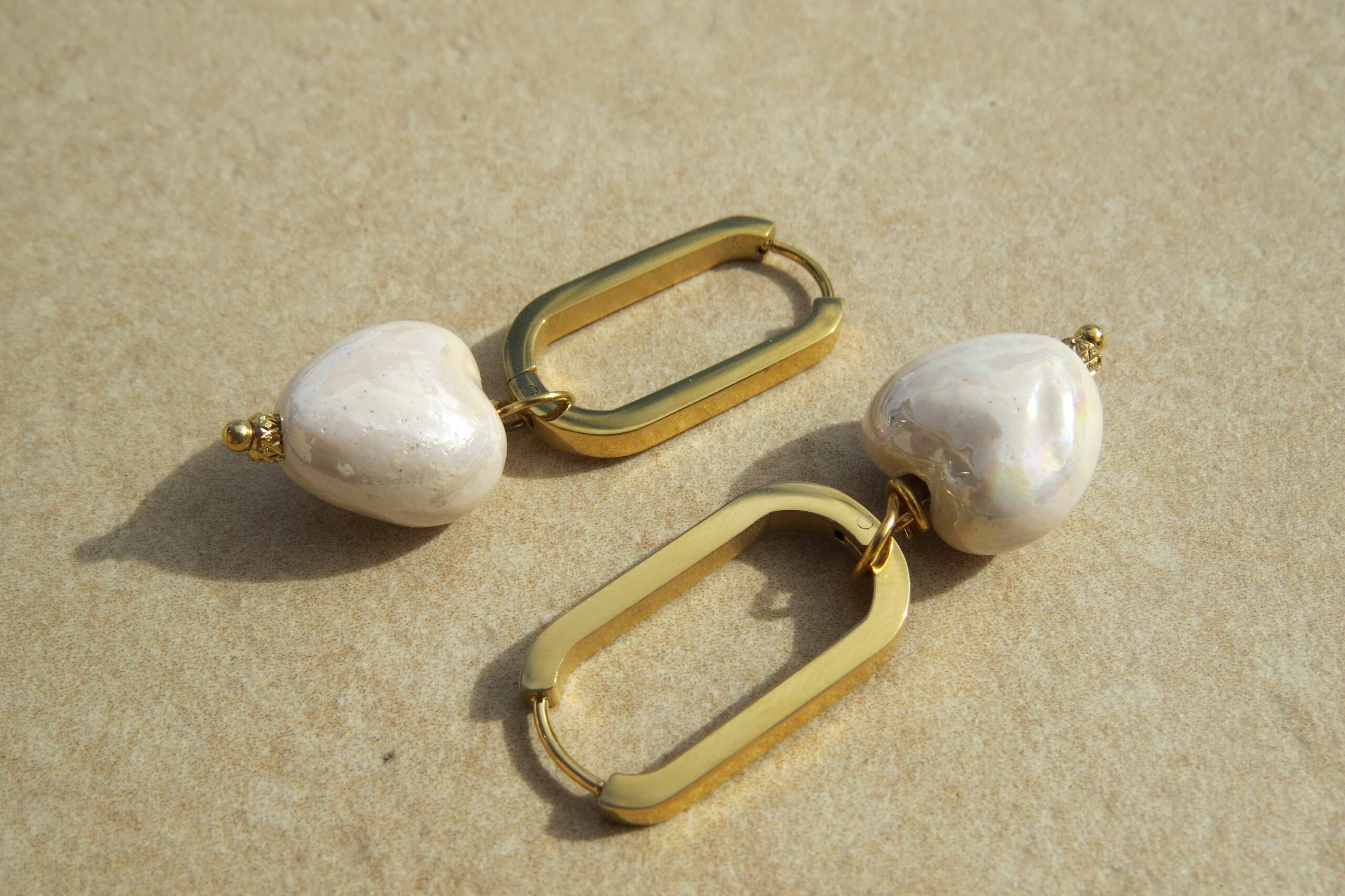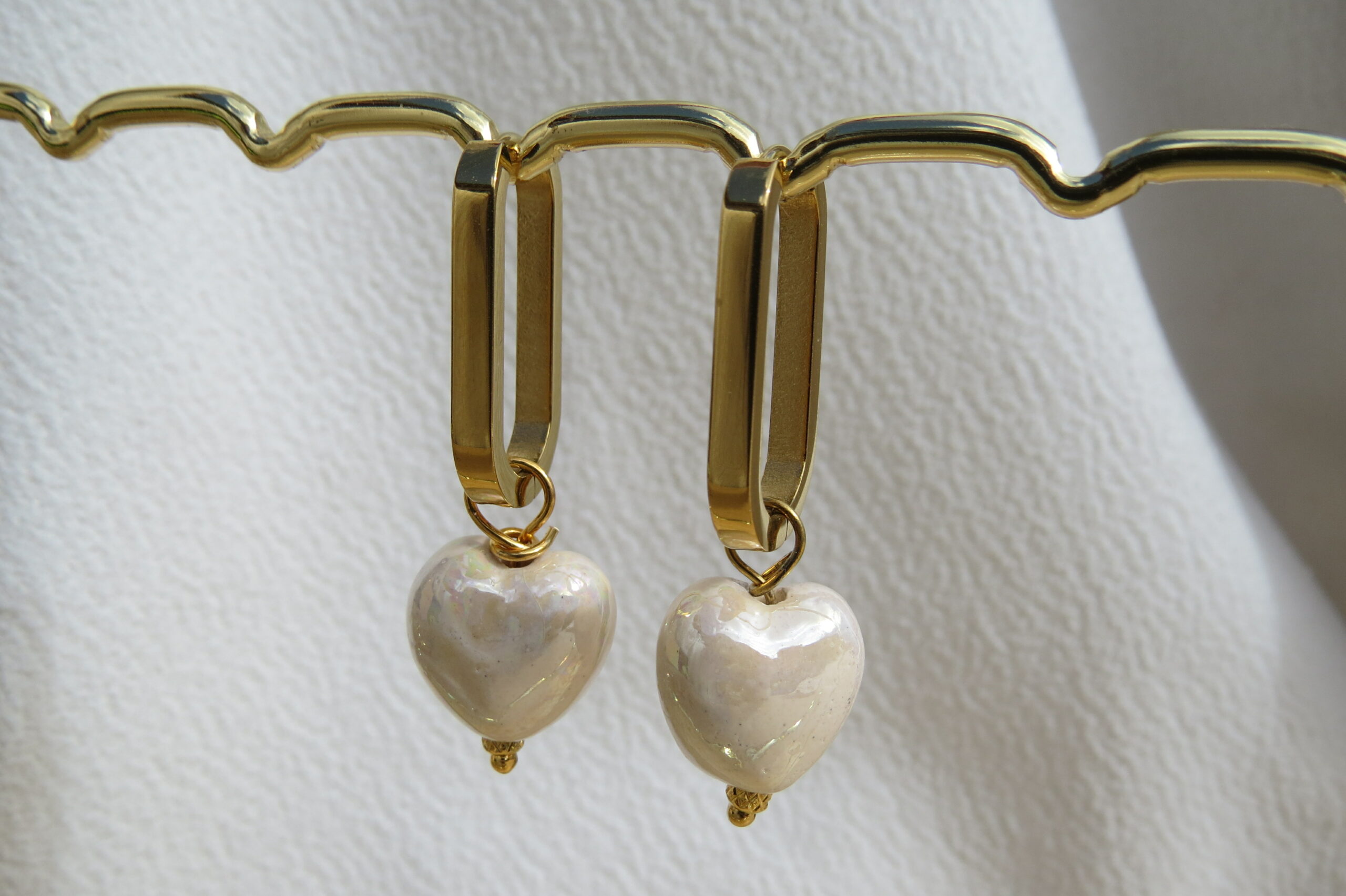 Les boucles d’oreilles sont en acier inoxydable doré, et surmonté de perles en céramique.