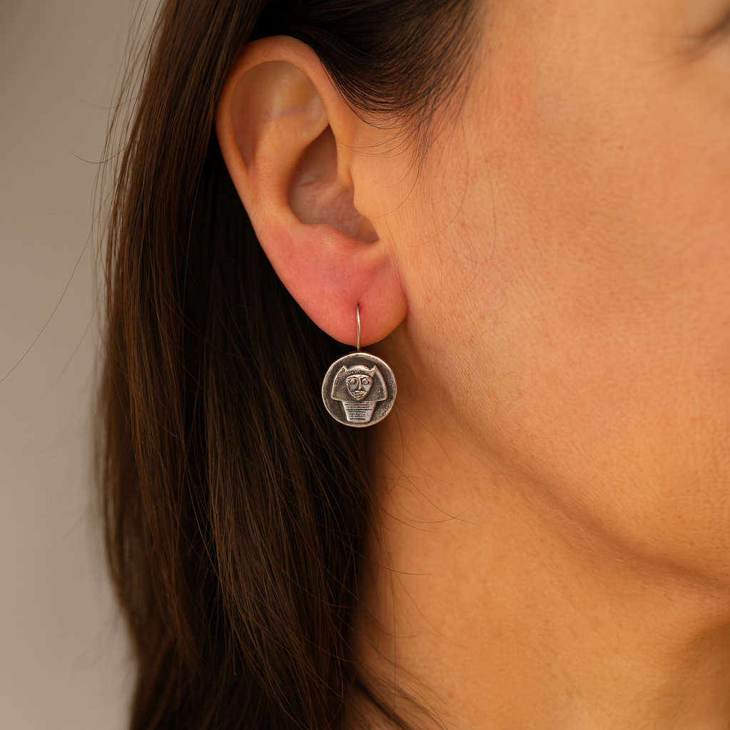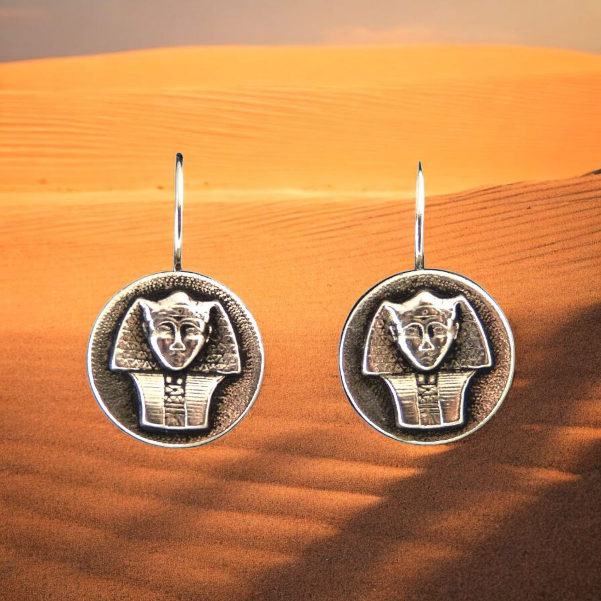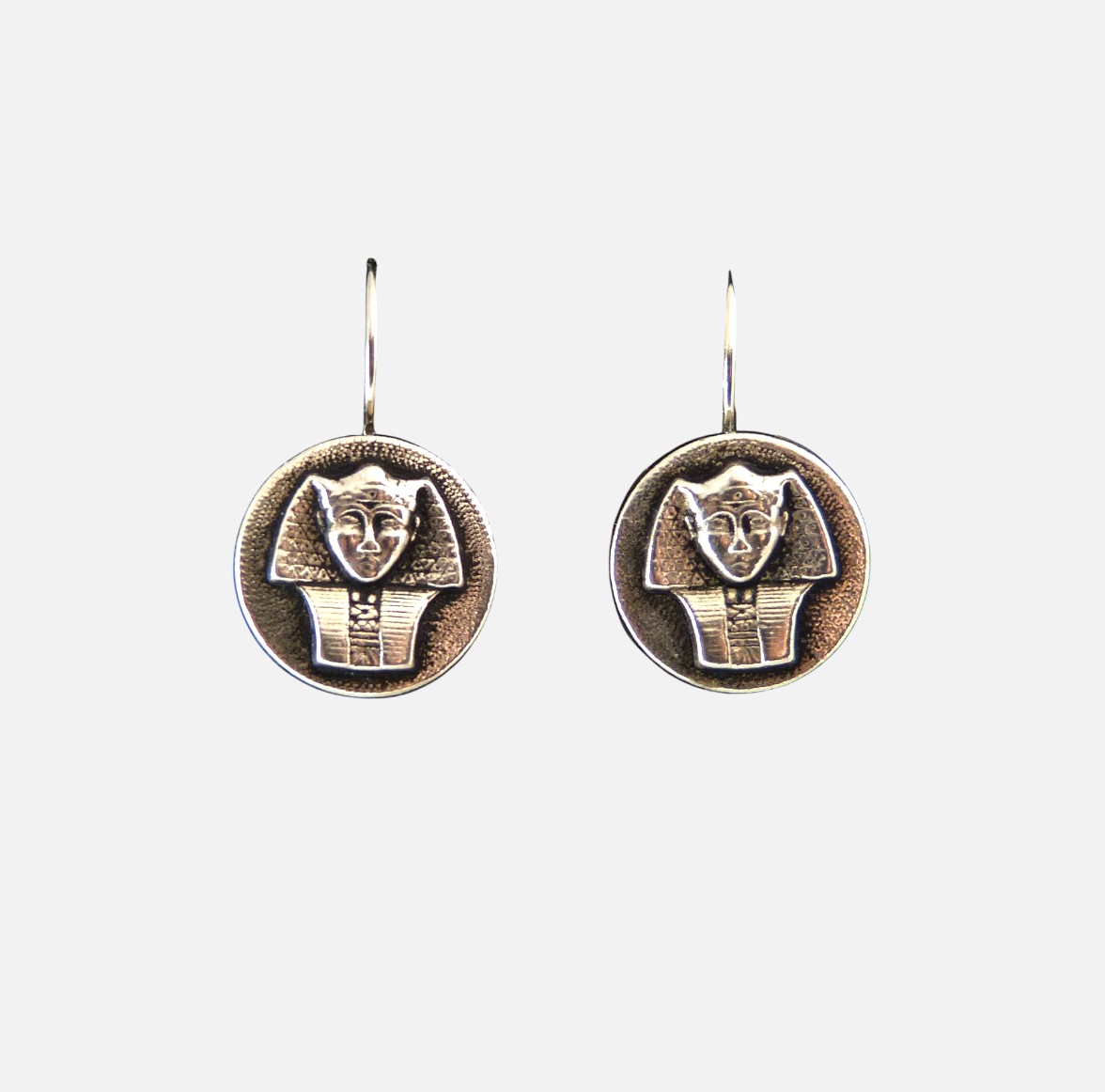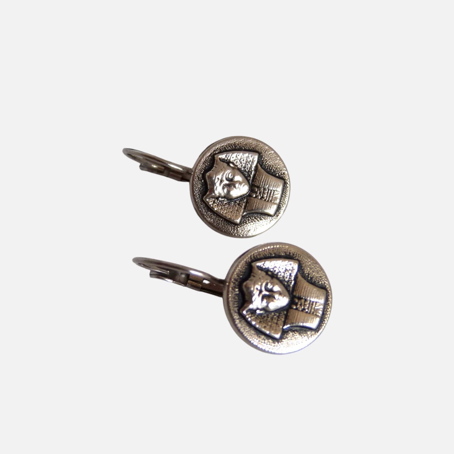 Inspirées de l’Égypte antique, ces boucles d’oreilles uniques sont créées à partir de véritables boutons vintage.