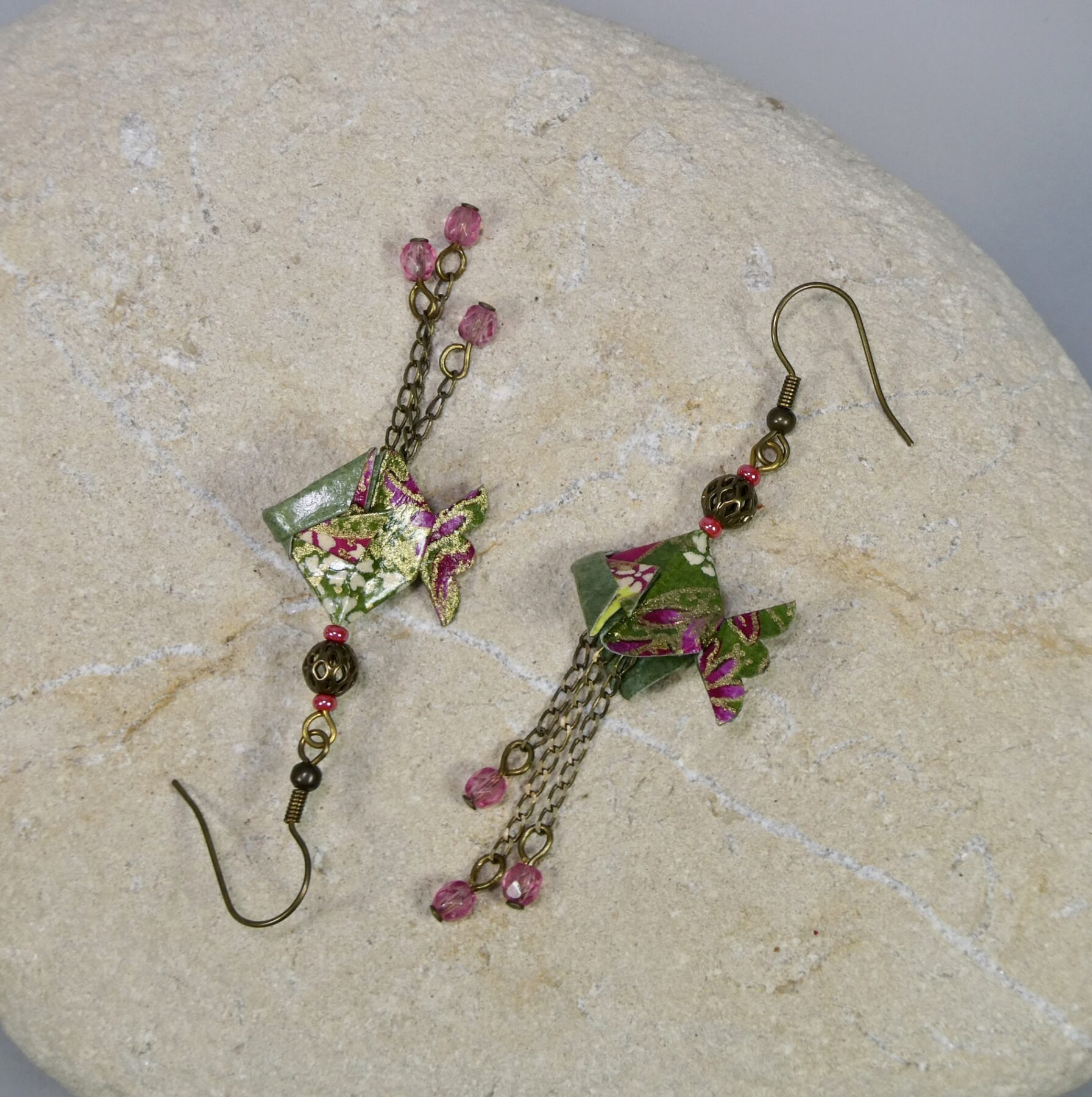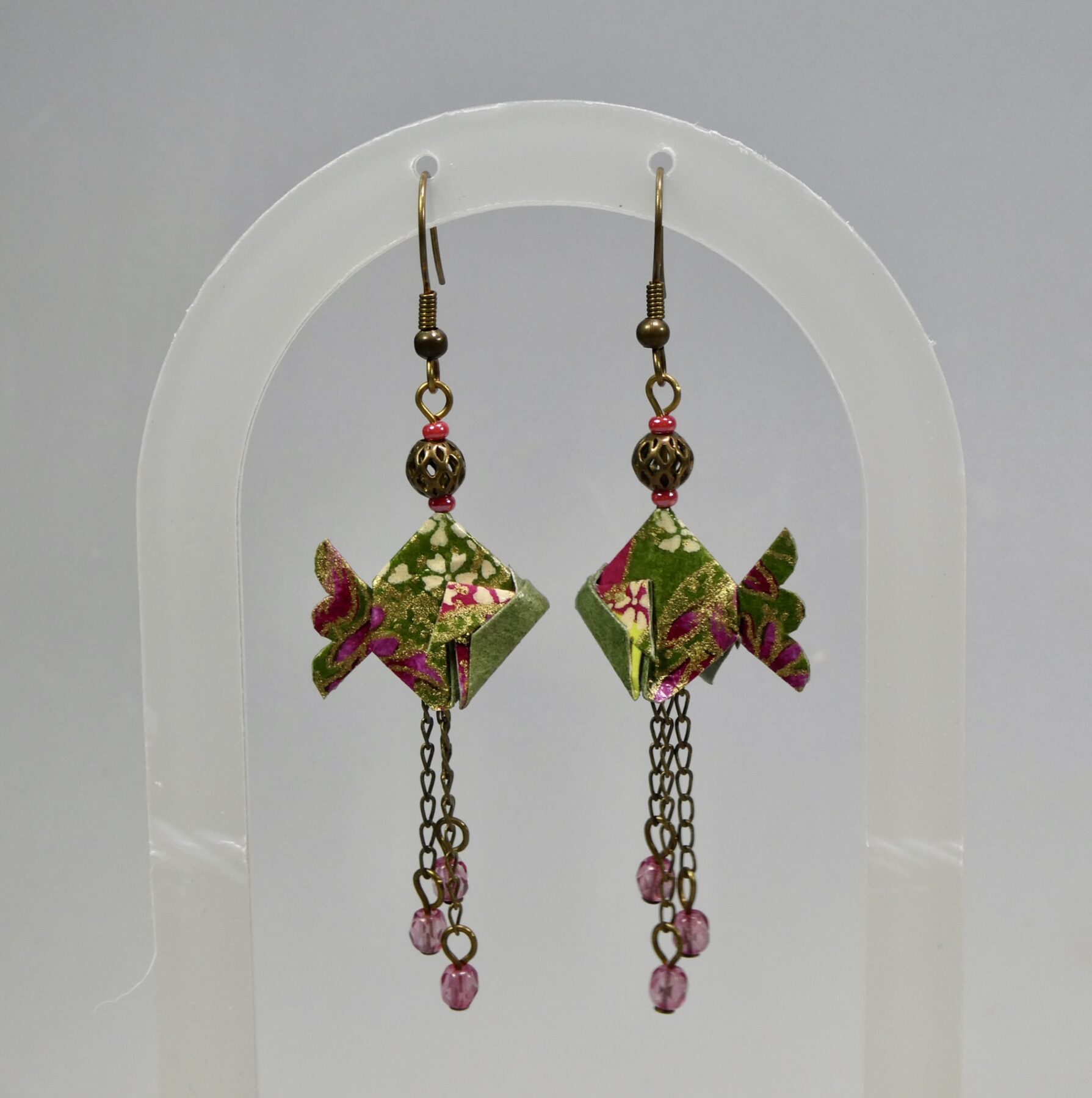 Boucles d’Oreilles Poissons en Origami vert et rose