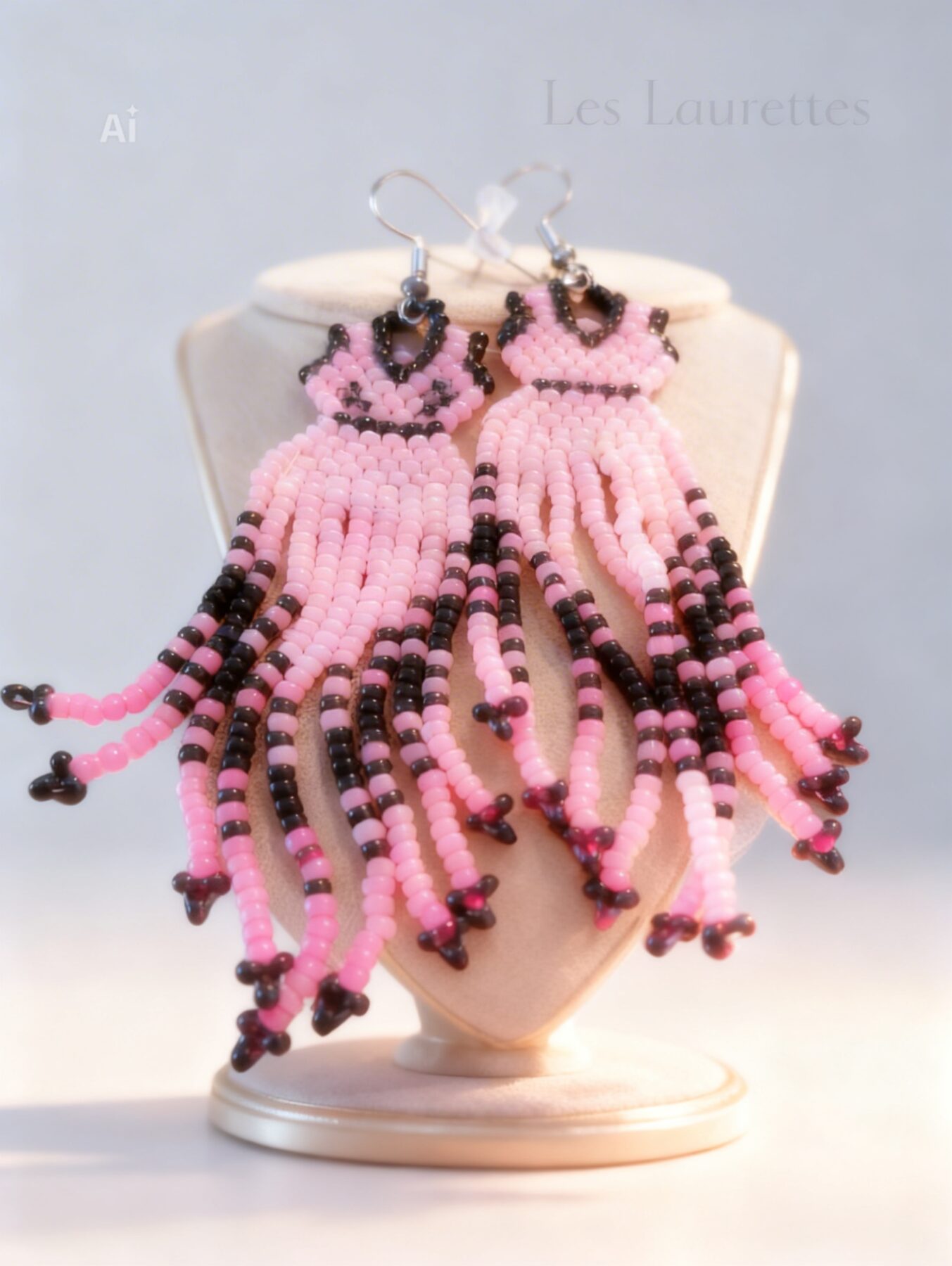 Boucles d’oreilles robe en perles Miyuki rose/noir en acier inoxydable