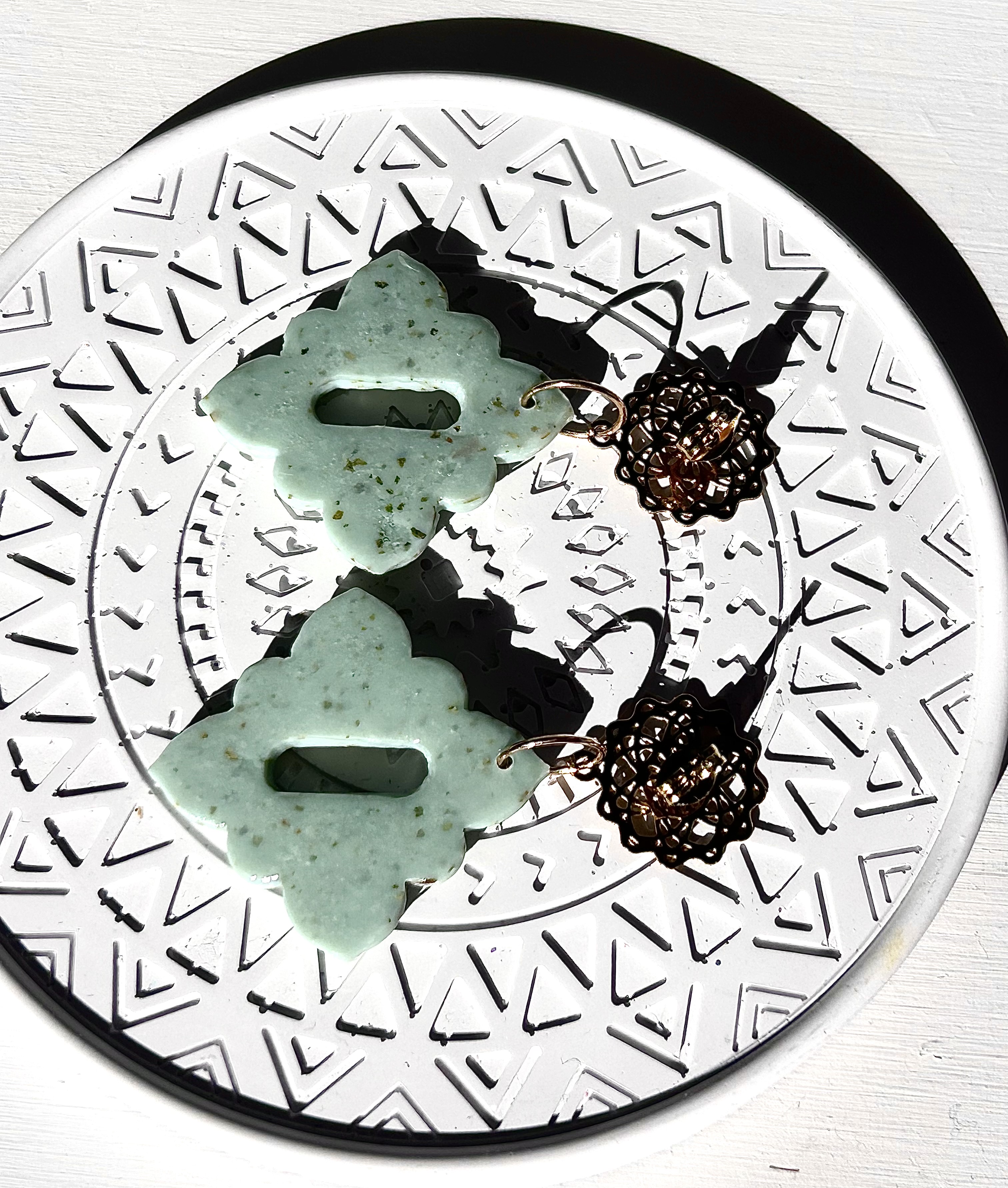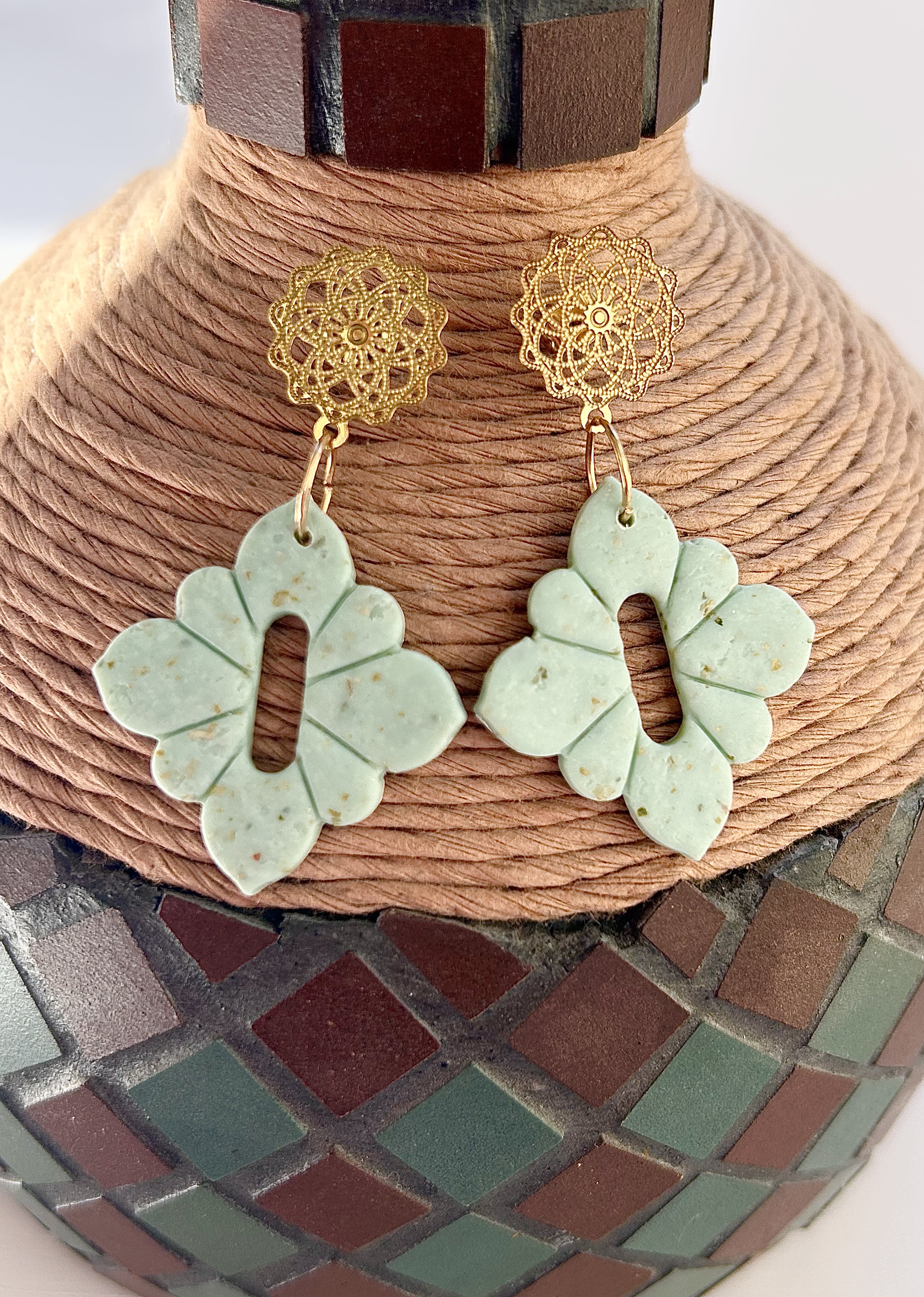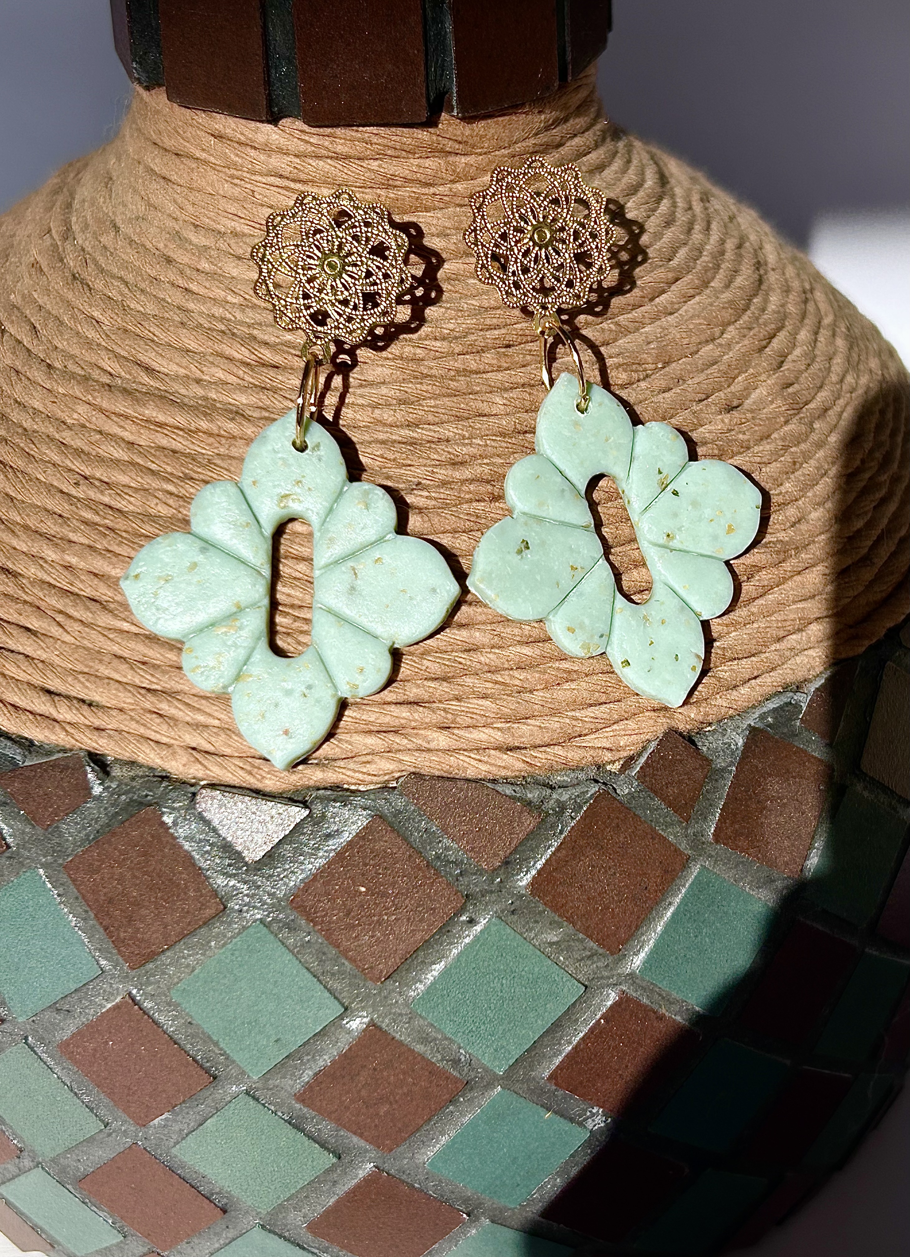 La combinaison d’une partie dorée finement travaillée qui rappelle une dentelle ou un mandala et de la pâte polymère couleur pastel leur donne un aspect à la fois moderne, léger et artisanal…