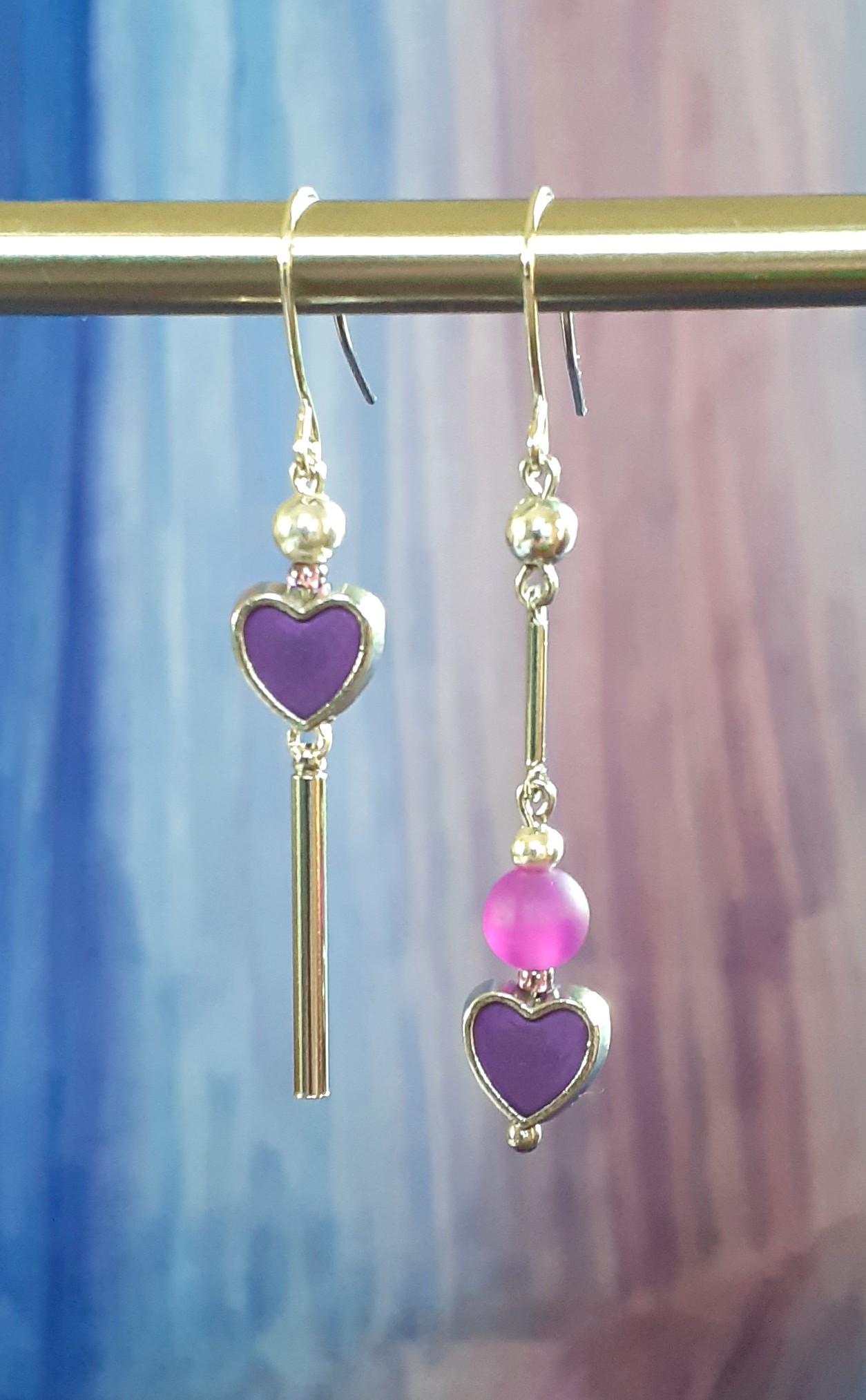 Apportez une touche de sophistication à votre tenue avec ces boucles d’oreilles pendantes avec petits cœurs violets, un bijou moderne et raffiné au design asymétrique.