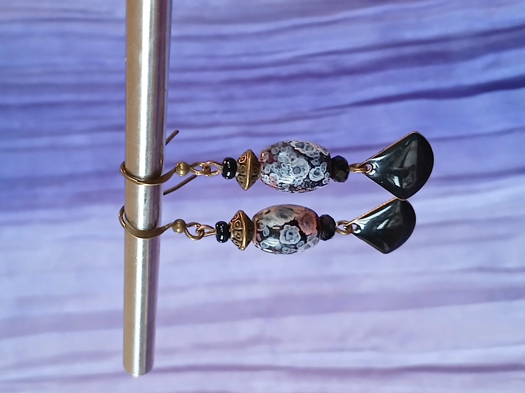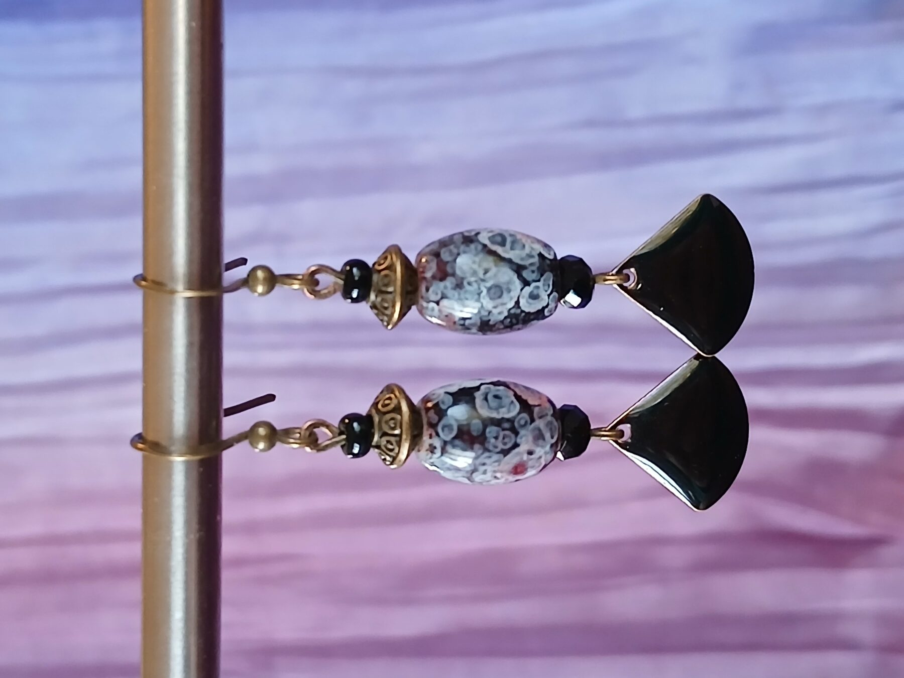 Boucles d’oreilles pendantes en bronze. Breloque émaillée noir brillant, forme éventail. Perle ovale noire mouchetée blanc, rose et parme.