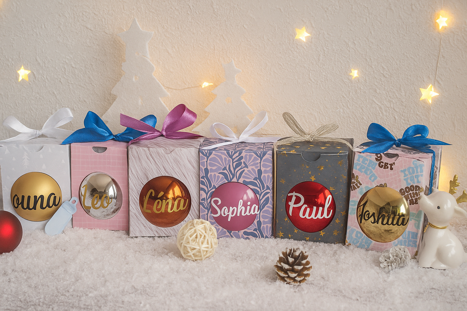 Ces boules personnalisées sont un cadeau idéal pour la famille, les amis ou pour célébrer un moment spécial. Elles deviendront un souvenir précieux à ressortir chaque Noël.