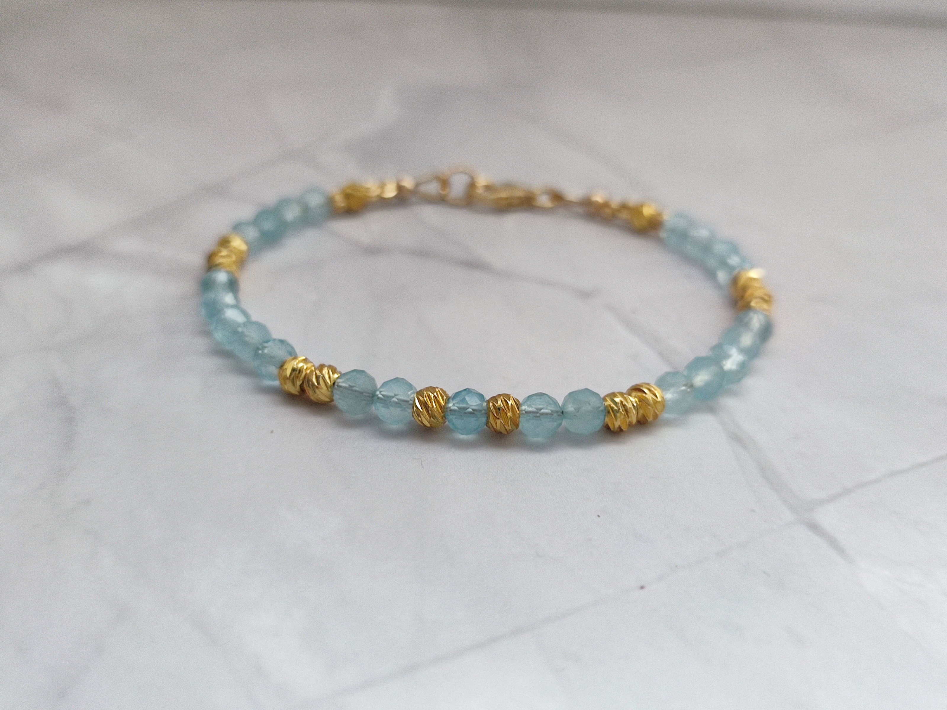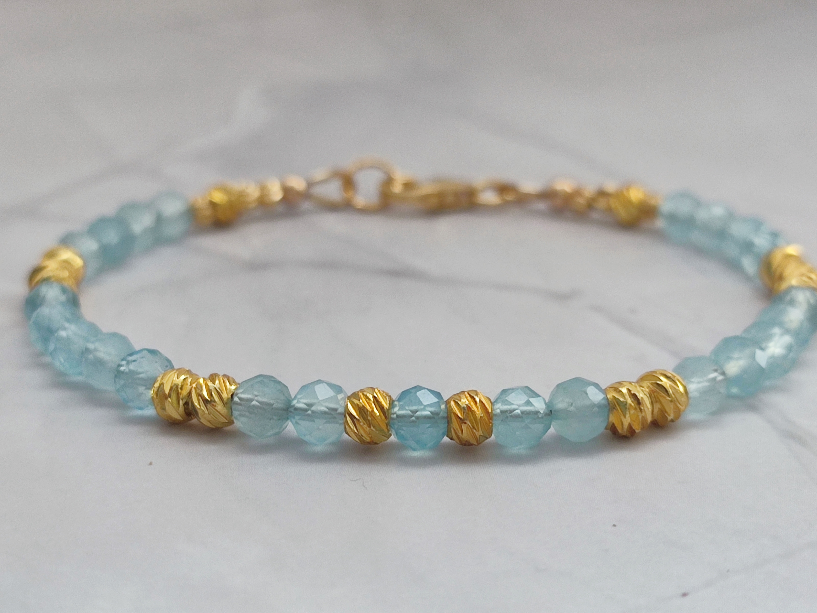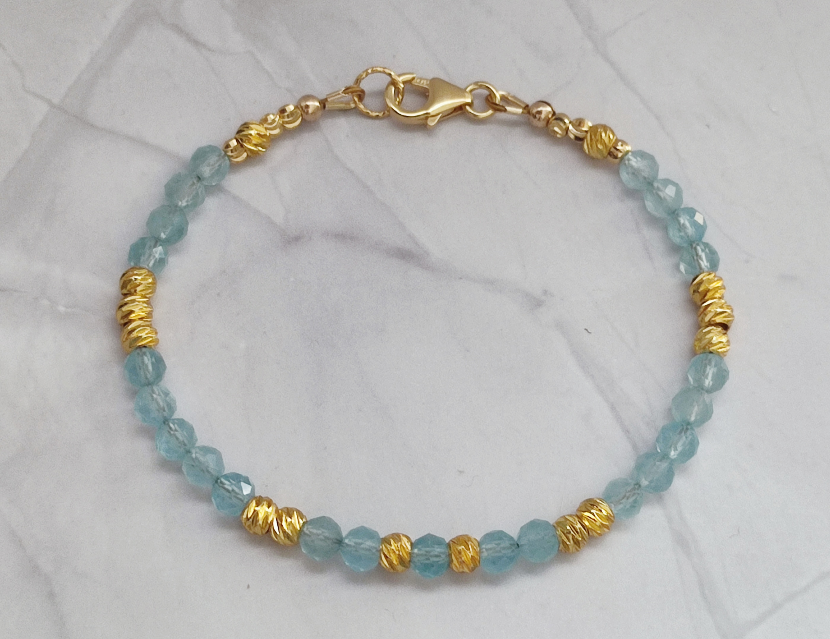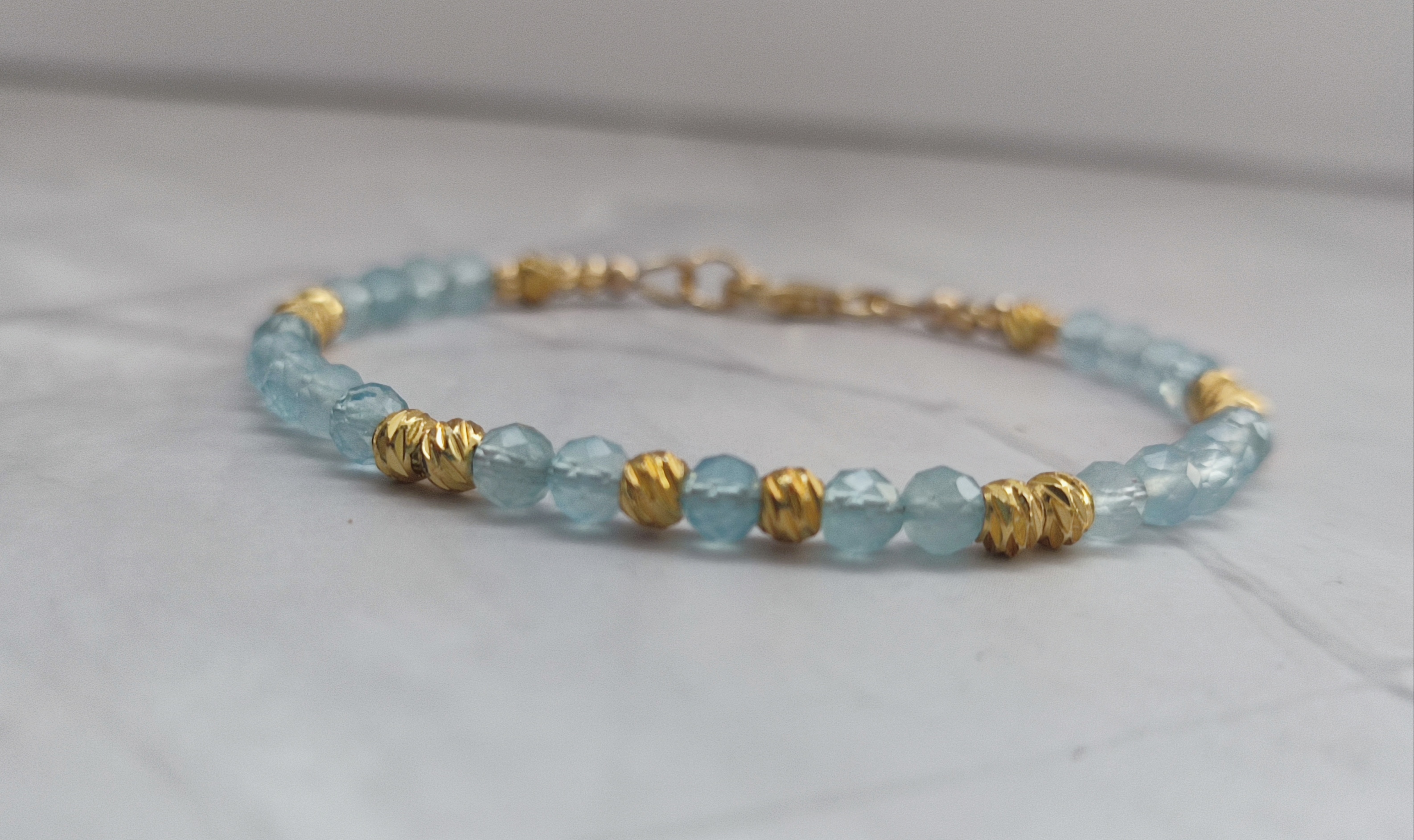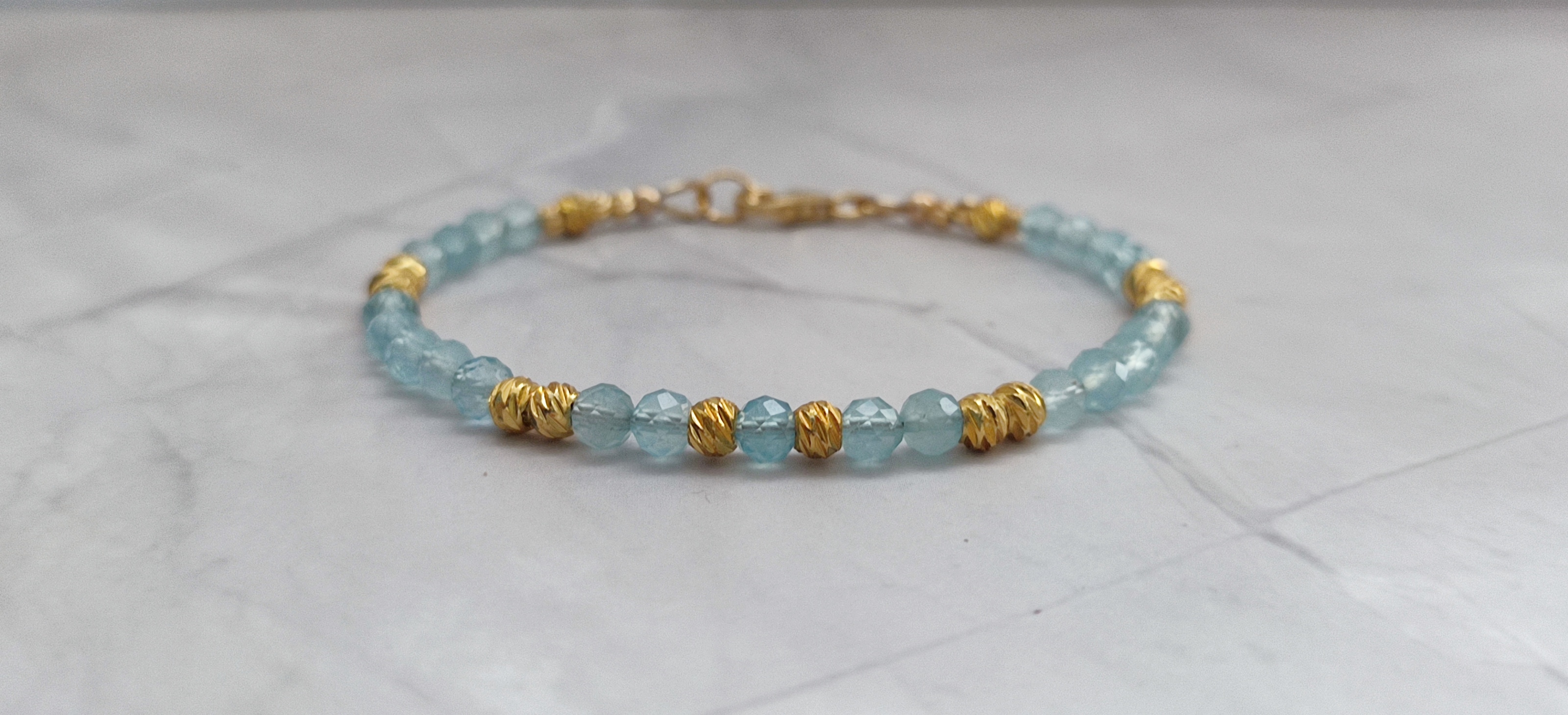 Les perles d’aigue-marine peuvent présenter des nuances naturelles de bleu, transparence et inclusions. C’est ce qui rend chaque bracelet unique.