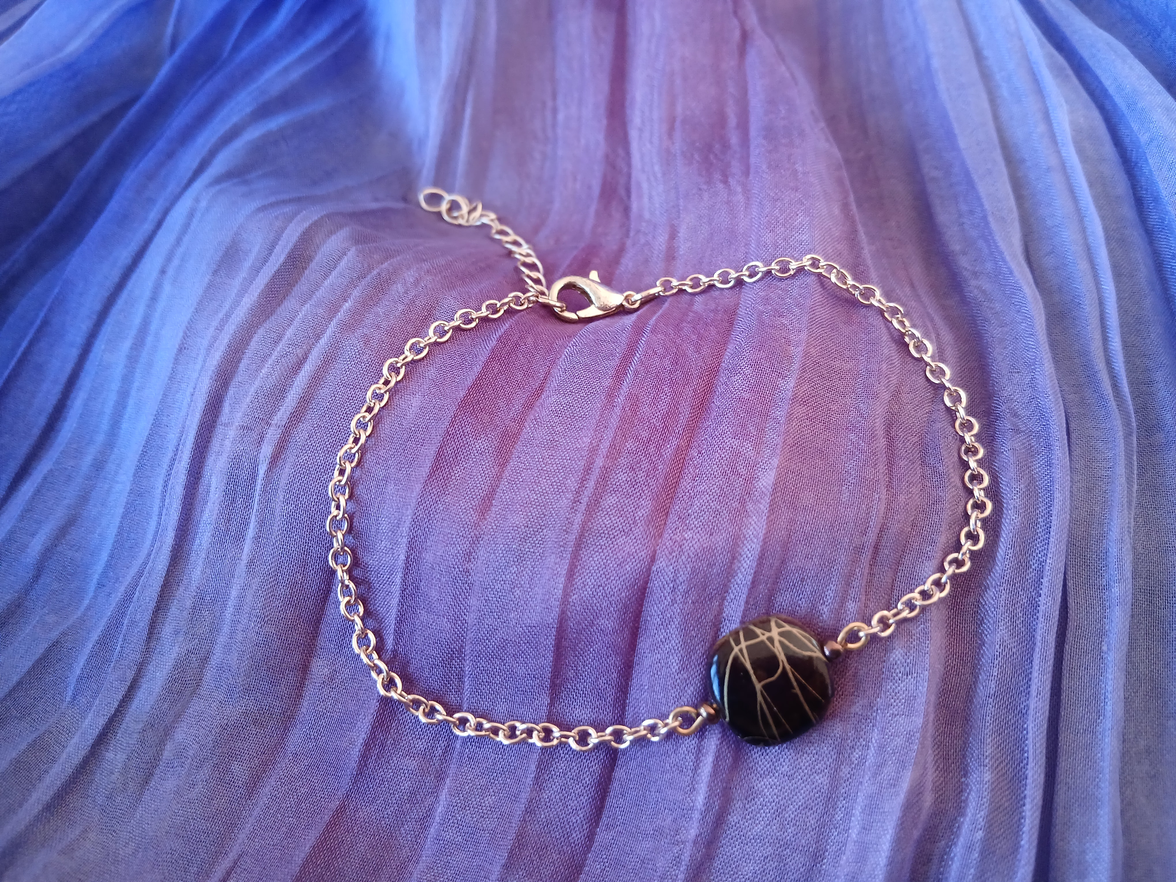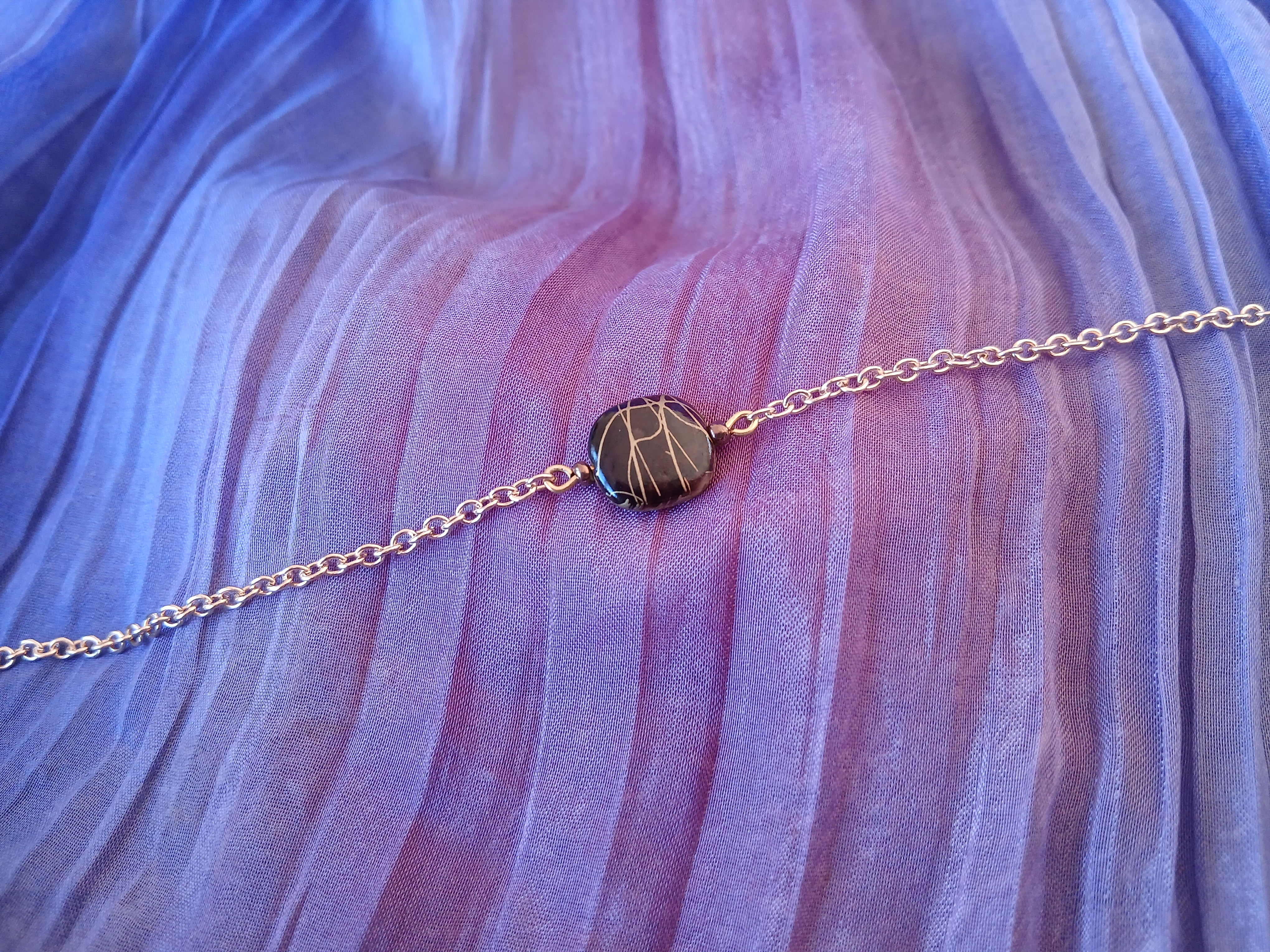 Son élément central est une perle plate brun mordoré, décorée de fines lignes dorées qui créent un jeu de contraste subtil et raffiné. La profondeur de la teinte brune associée aux reflets dorés apporte chaleur et sophistication à ce bijou minimaliste.