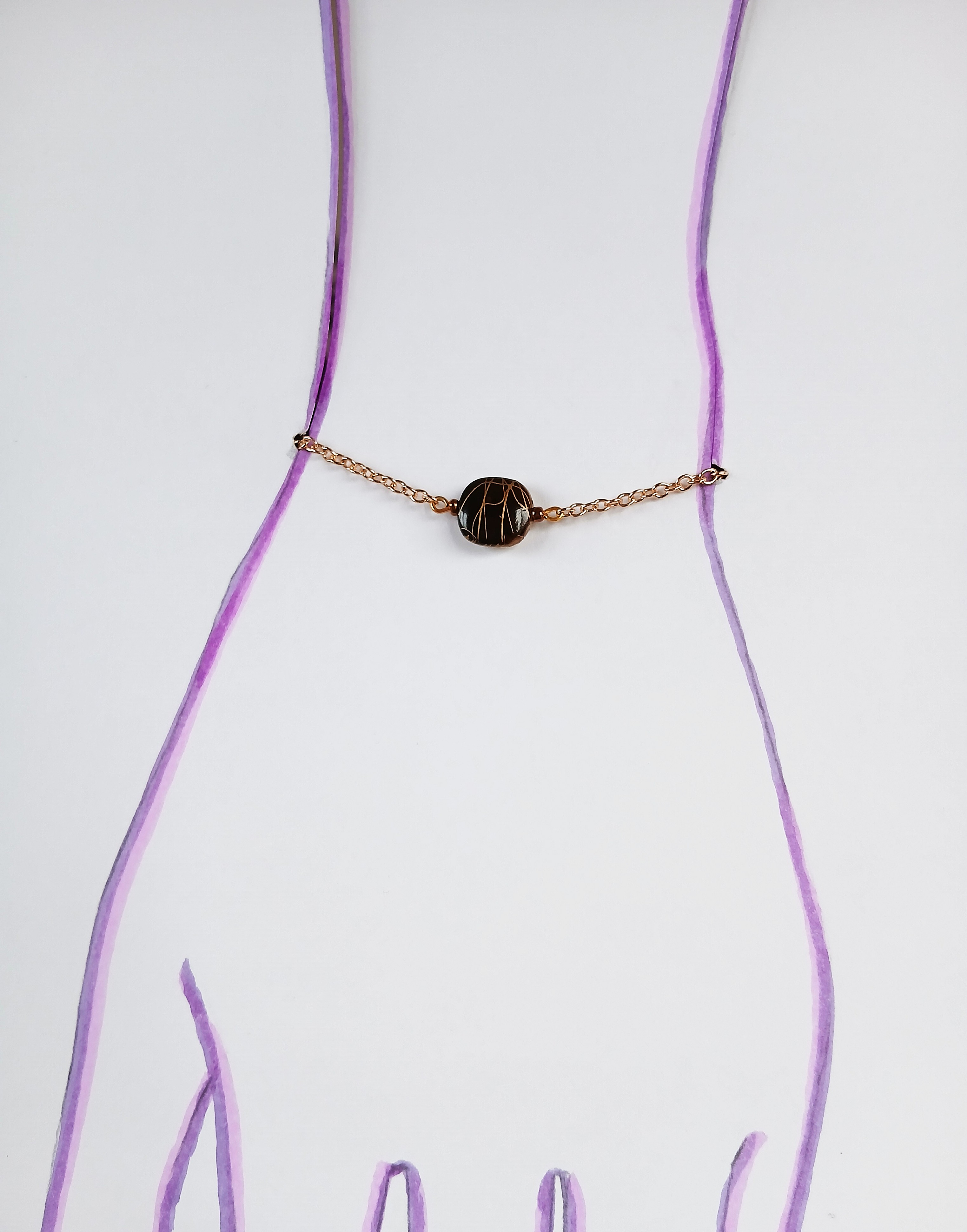 L’élément central, une perle plate brun mordoré, décorée de fines lignes dorées crée un jeu de contraste subtil et raffiné qui donne à ce bijou unique, chaleur et sophistication malgré son apparente simplicité.