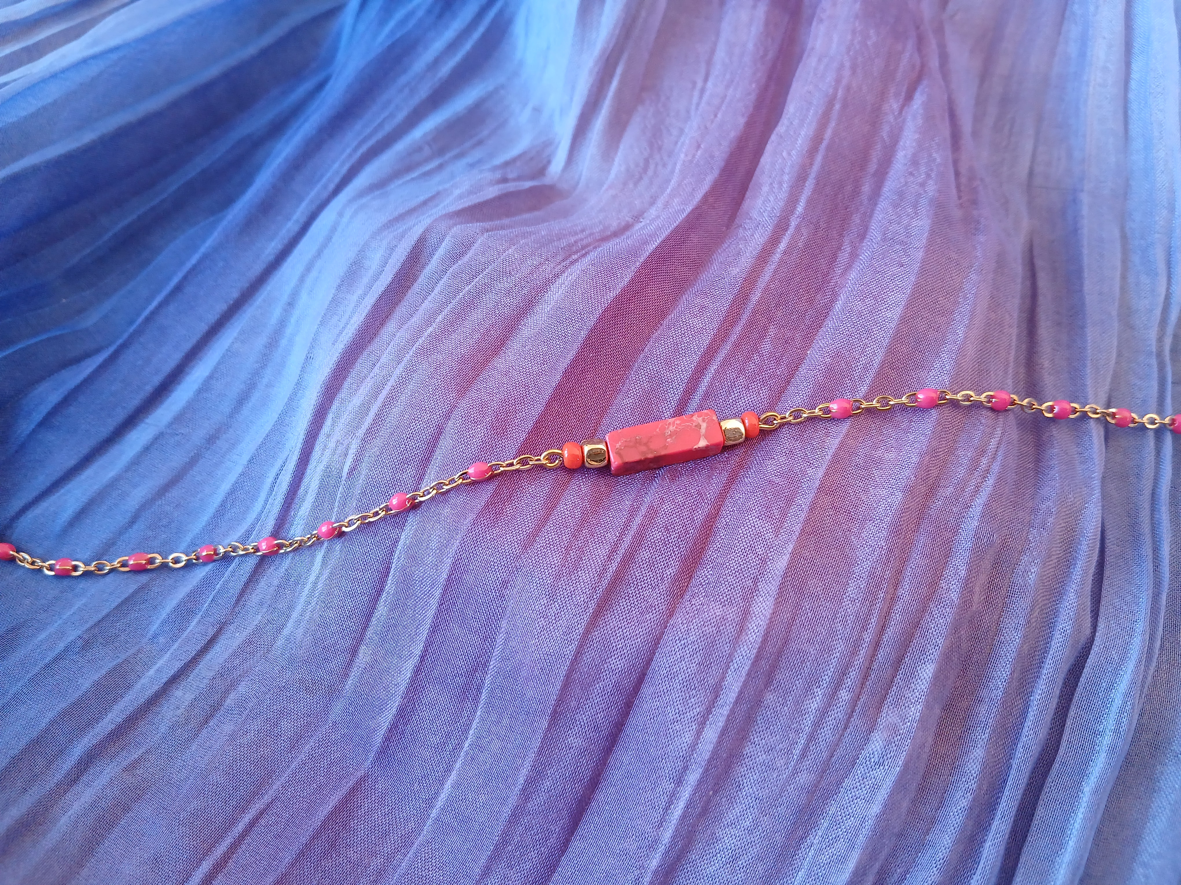 Au centre, une perle rectangulaire marbrée ton corail attire le regard par ses variations naturelles et son effet légèrement minéral. Elle est sublimée par des perles corail et des éléments dorés qui apportent chaleur et éclat à l’ensemble.