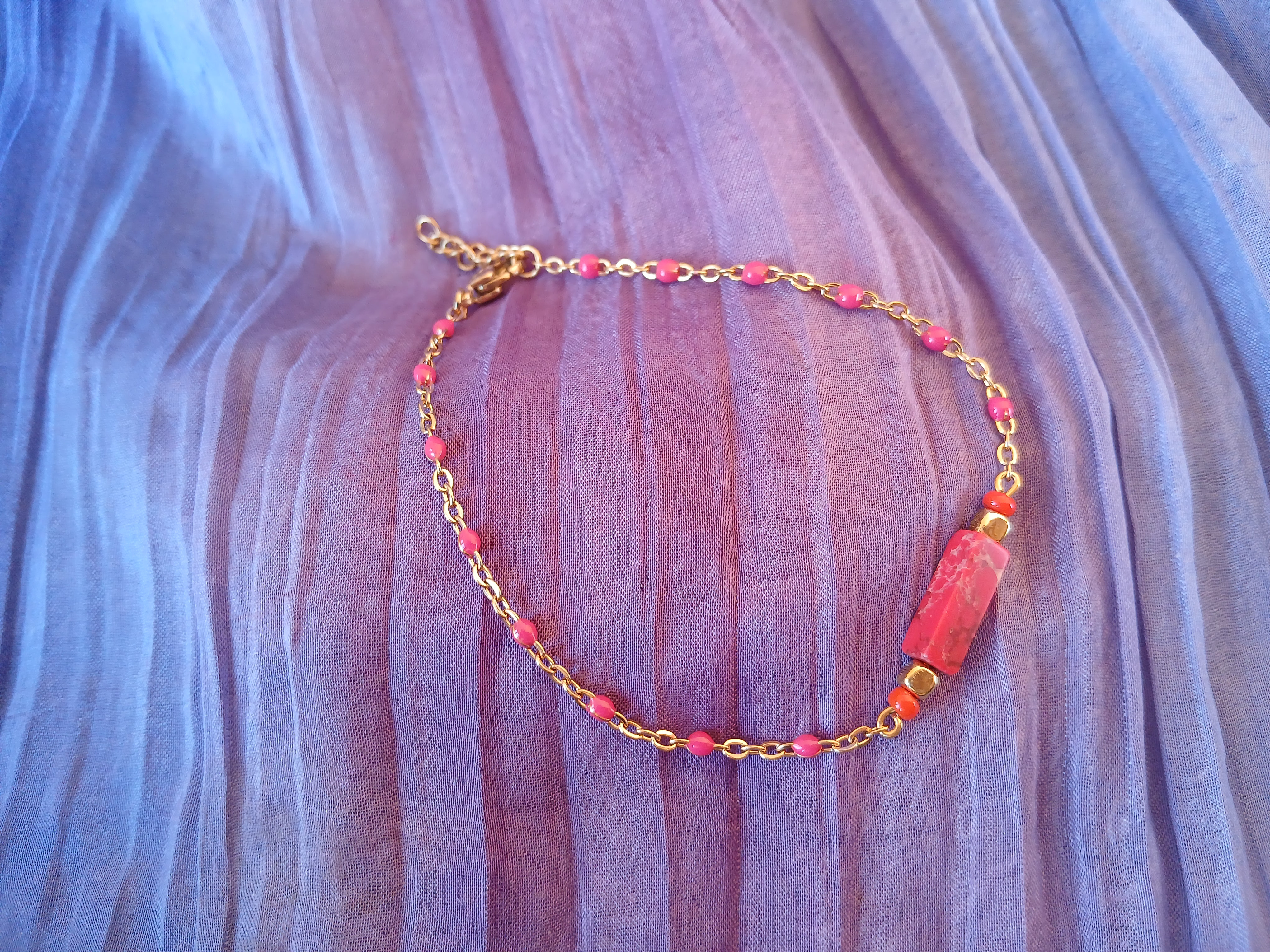 CCe bracelet upcyclé à chaîne dorée illumine le poignet avec ses nuances corail vibrantes.