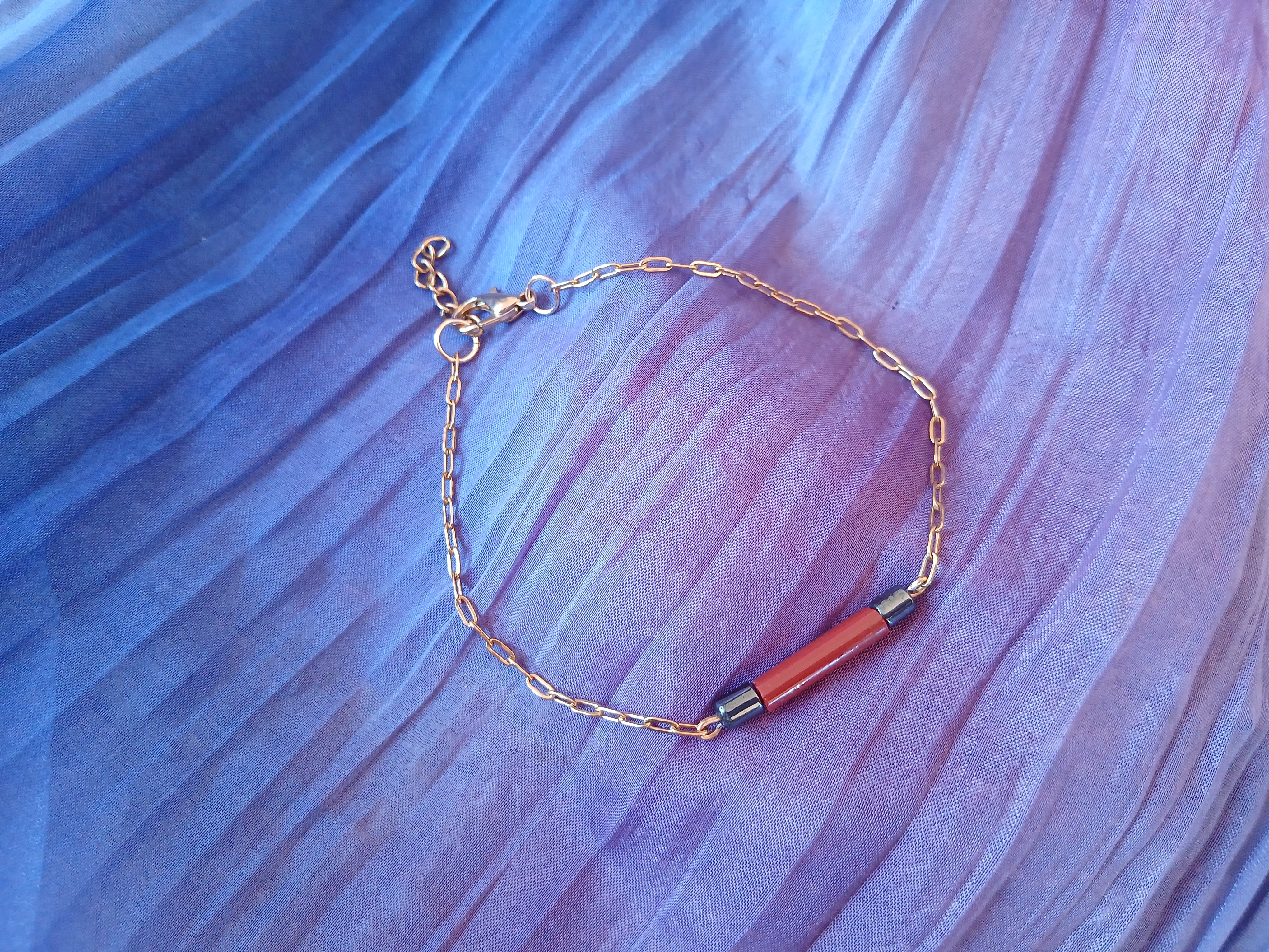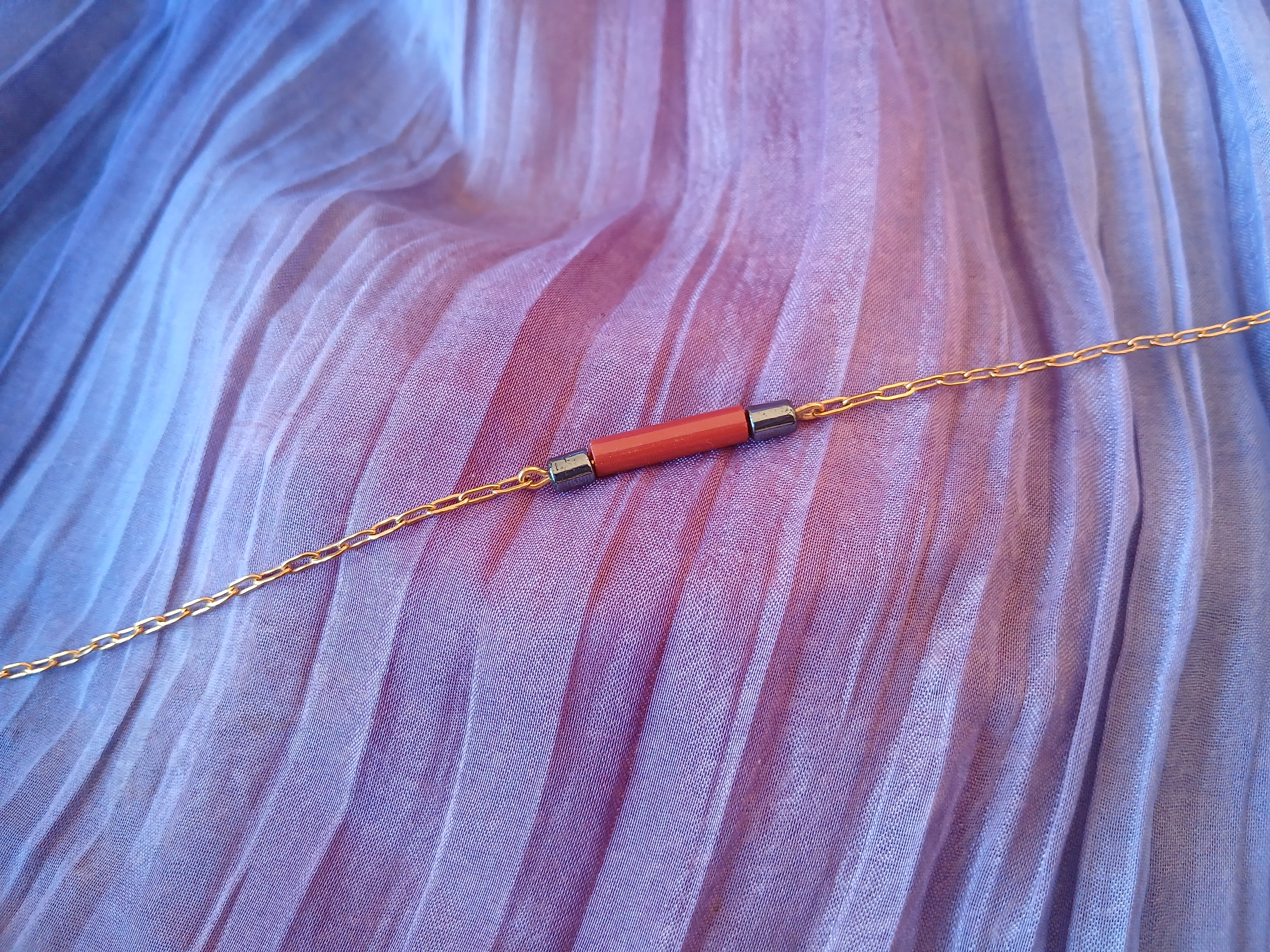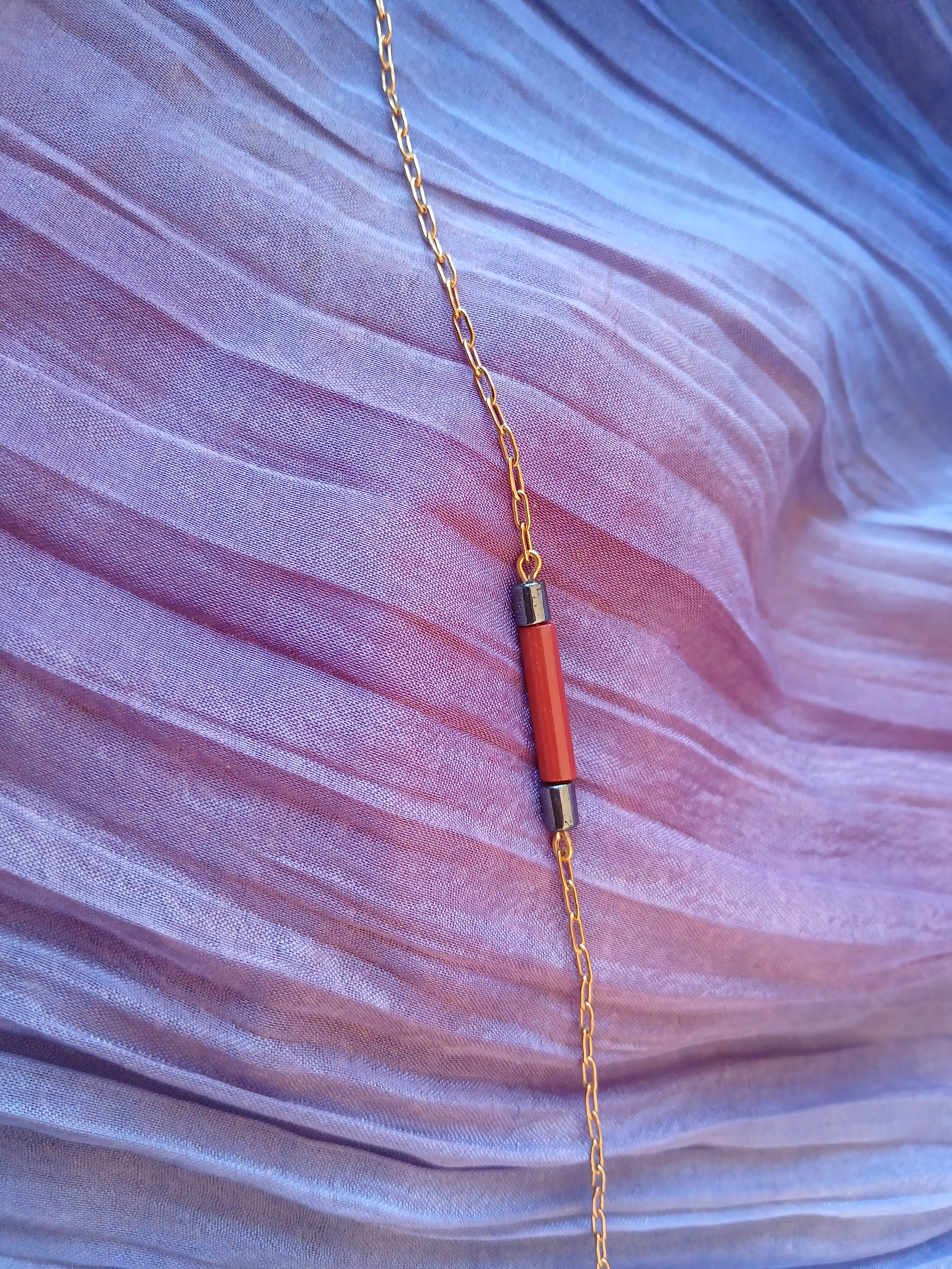 Au centre, une perle cylindrique couleur rouille apporte profondeur et caractère, subtilement encadrée par des éléments métalliques gris anthracite qui créent un contraste moderne et élégant.