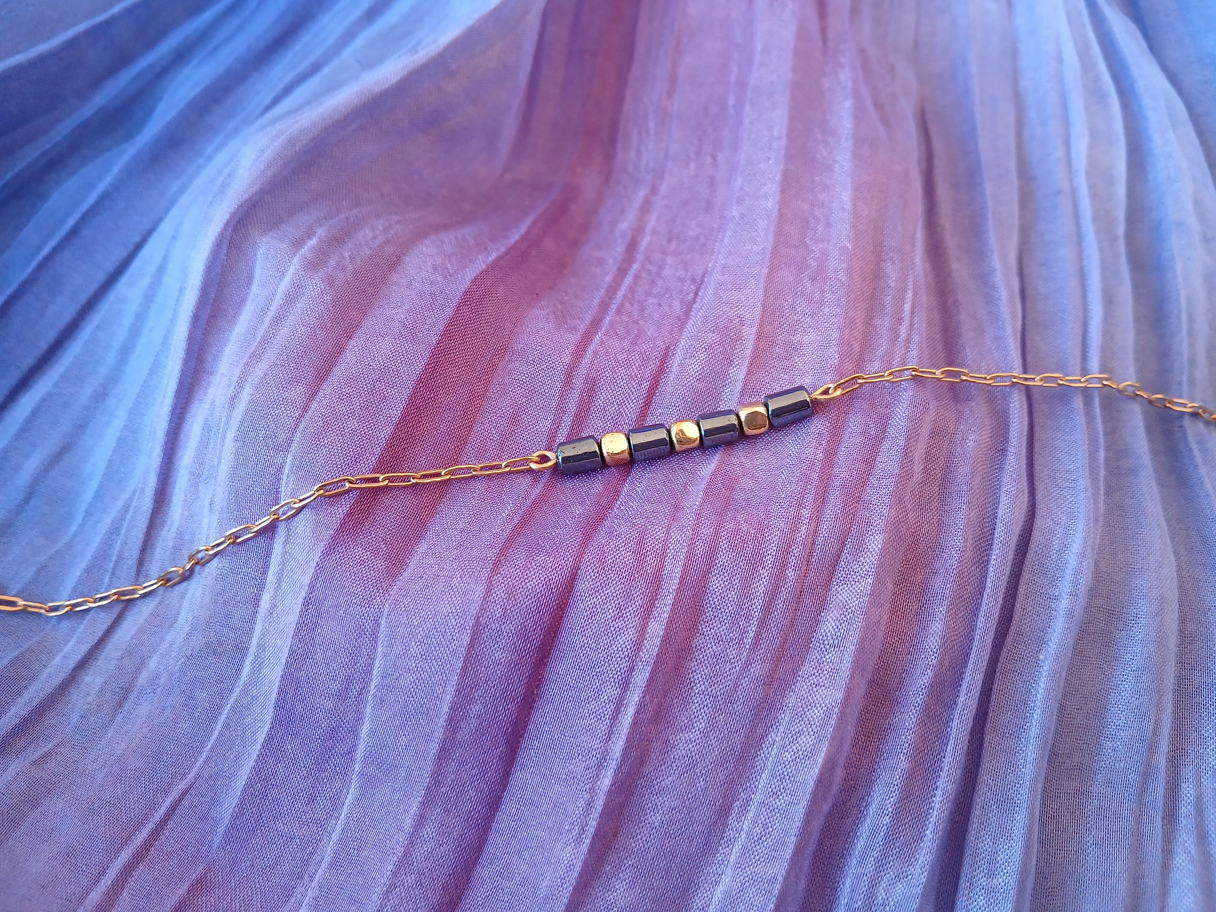 Au centre, une ligne structurée de perles cylindriques aux reflets métalliques (gris anthracite et doré brillant) crée un contraste sophistiqué et moderne. Leur éclat discret capte la lumière et apporte du caractère à ce bijou fin et délicat.