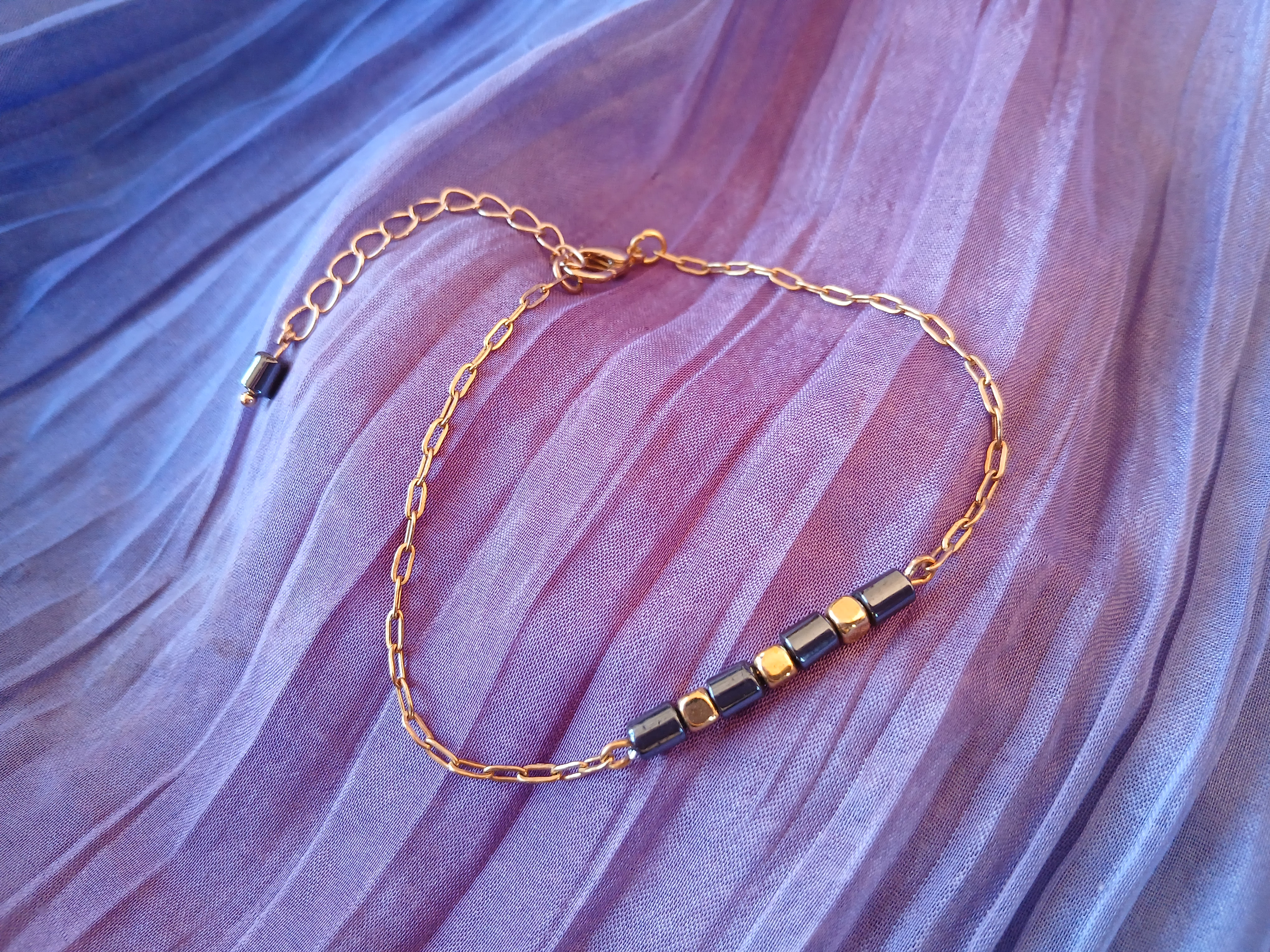 Ce bracelet upcyclé à chaîne dorée incarne l’élégance minimaliste avec une touche contemporaine.