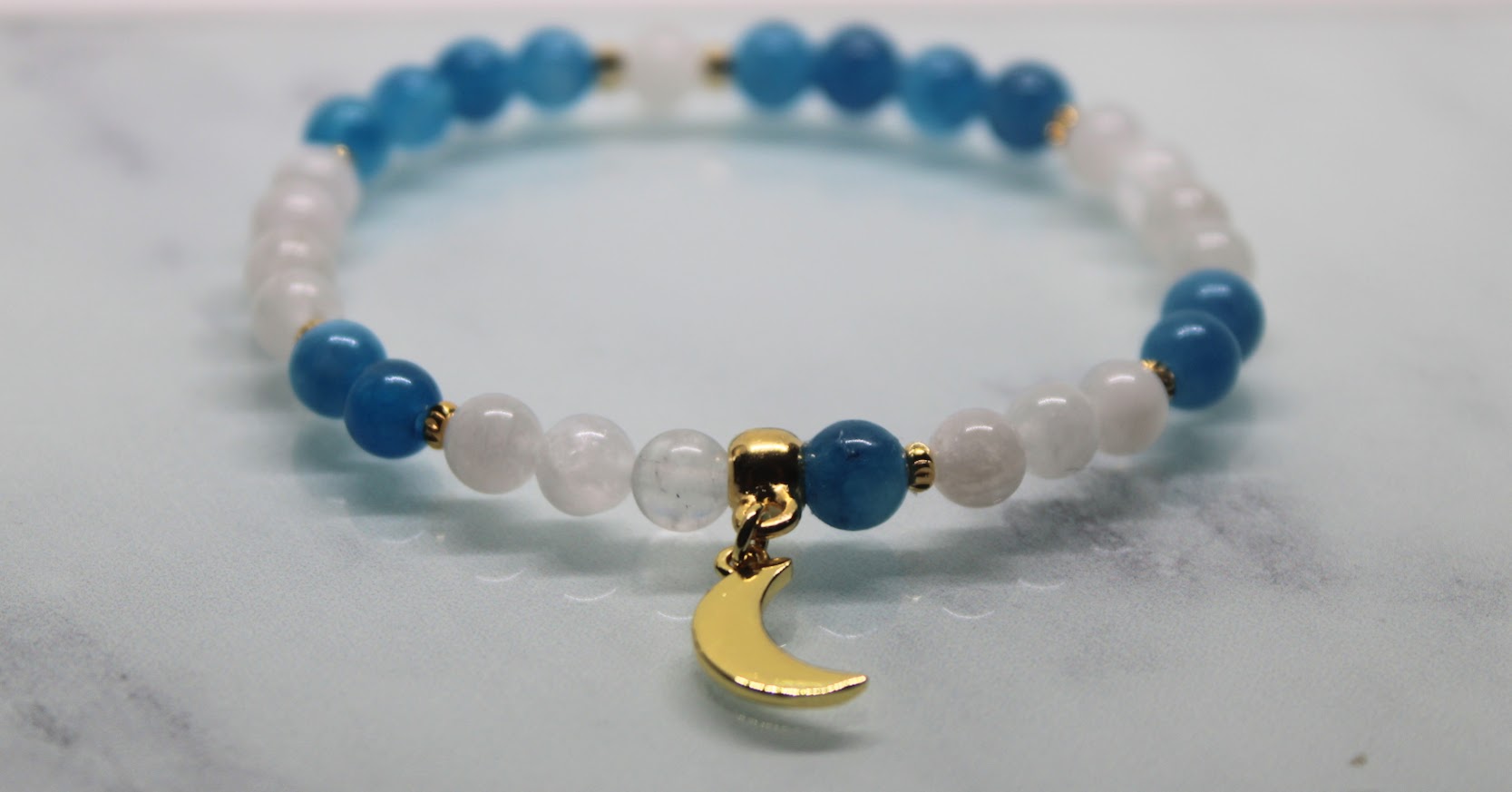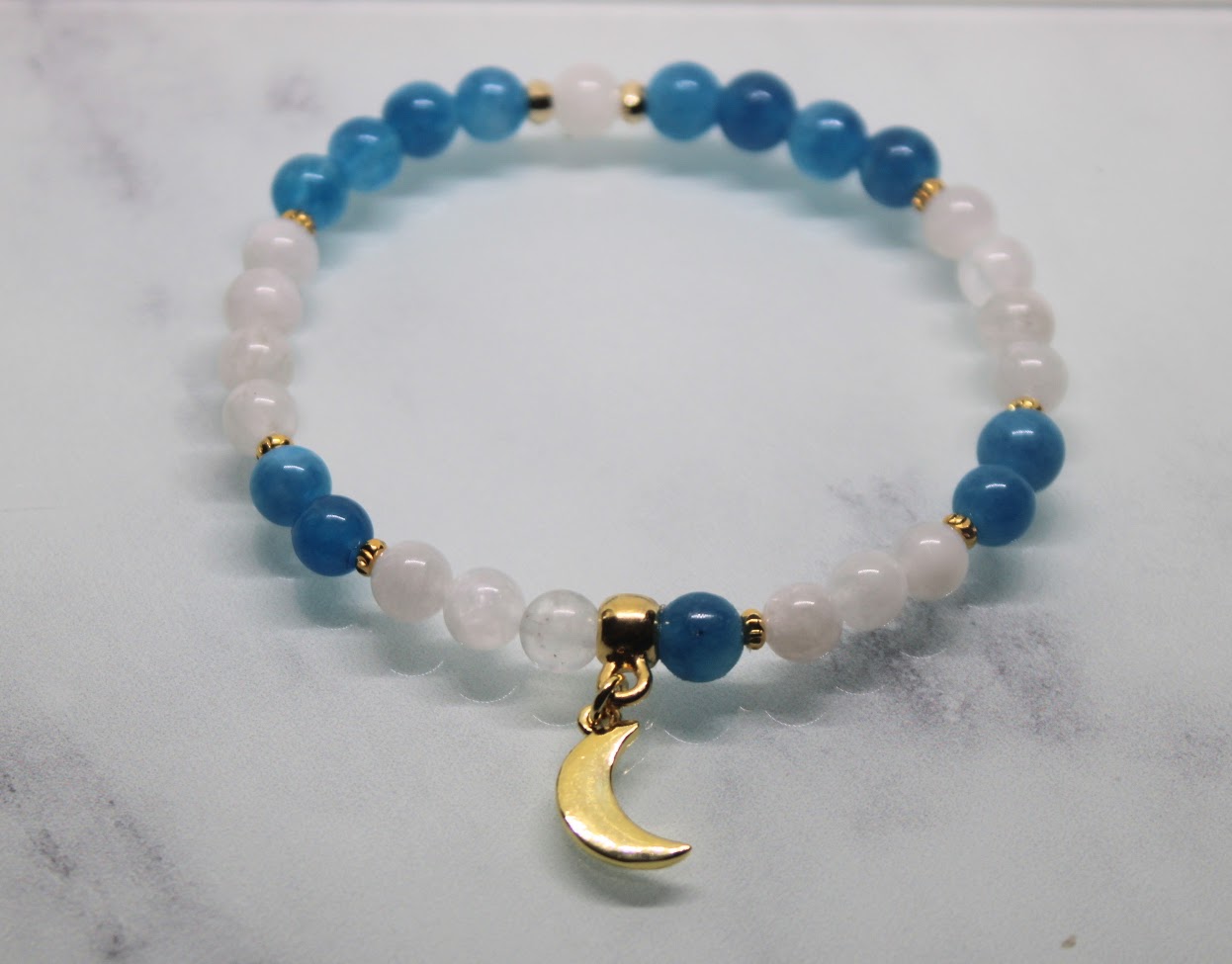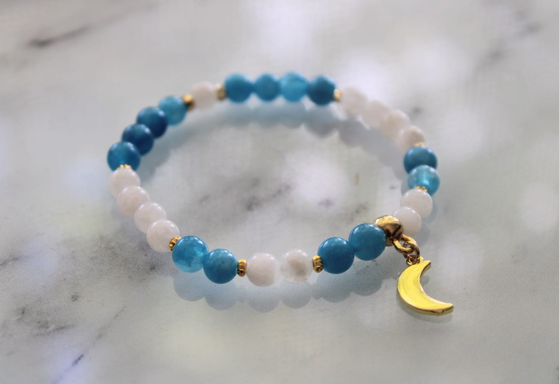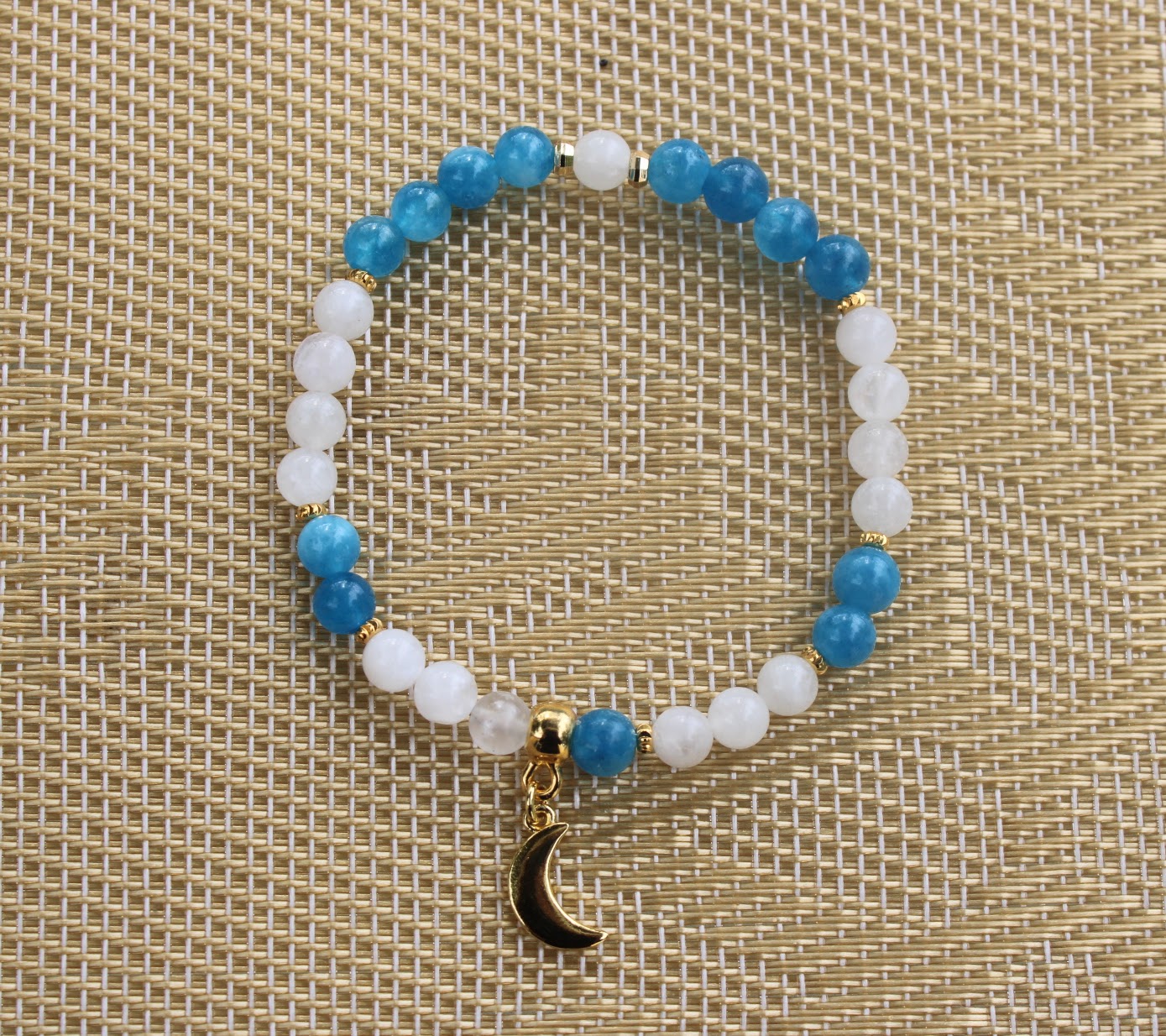 Bracelet en pierres naturelles d’Apatite bleue et de Pierre de Lune, agrémenté de délicates perles intercalaires en plaqué or et d’une jolie breloque lune dorée.