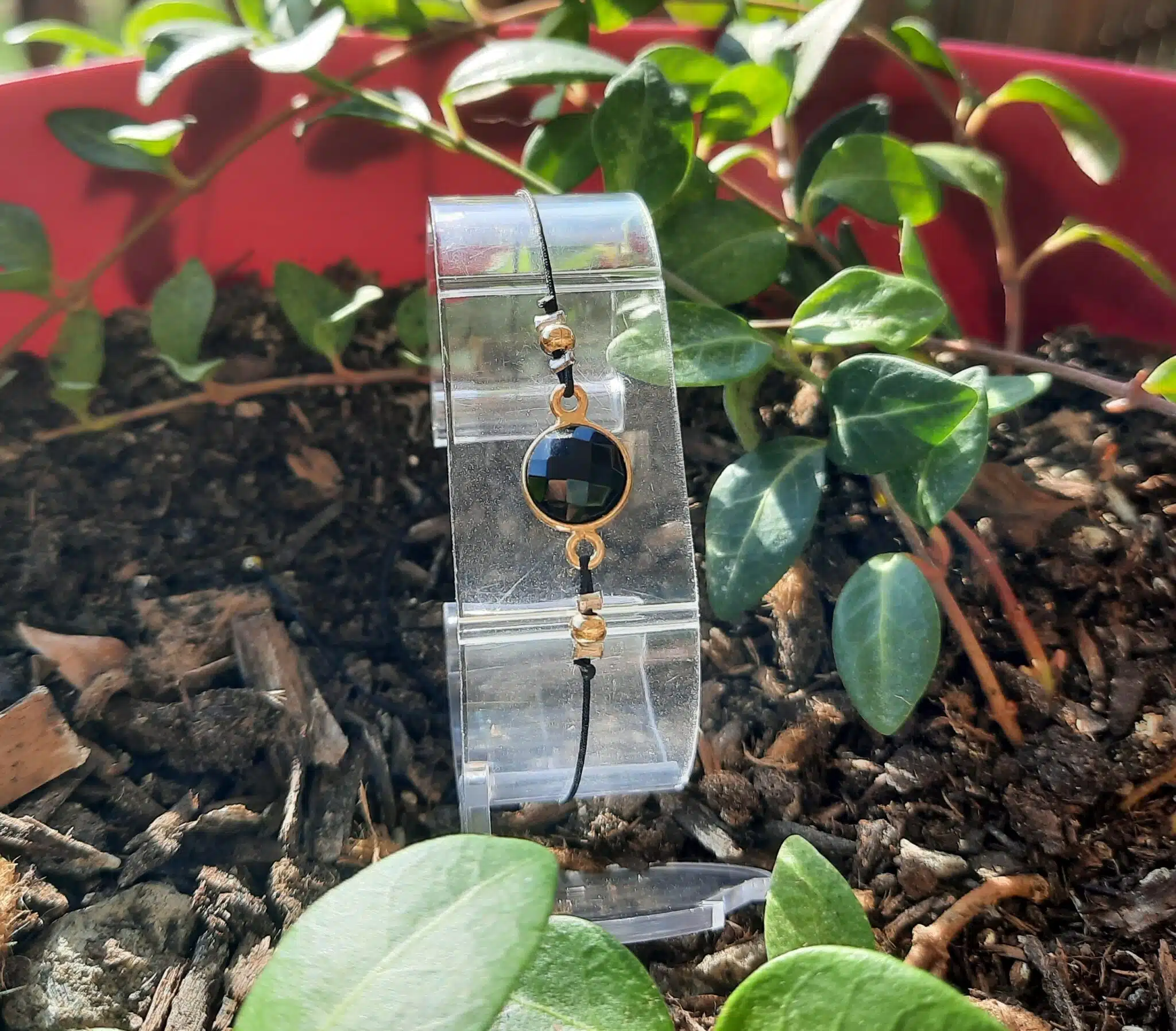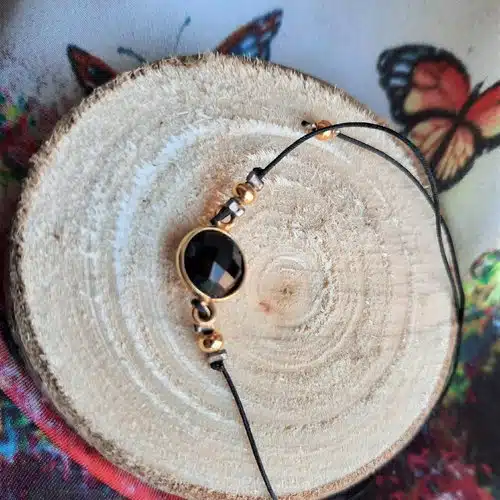 La pierre : ONYX – AGATE NOIRE est taillée en coussin rond facetté sertie sur argent doré. Quatre perles plaqué or : deux qui entourent la perle et deux en finition de bracelet.
